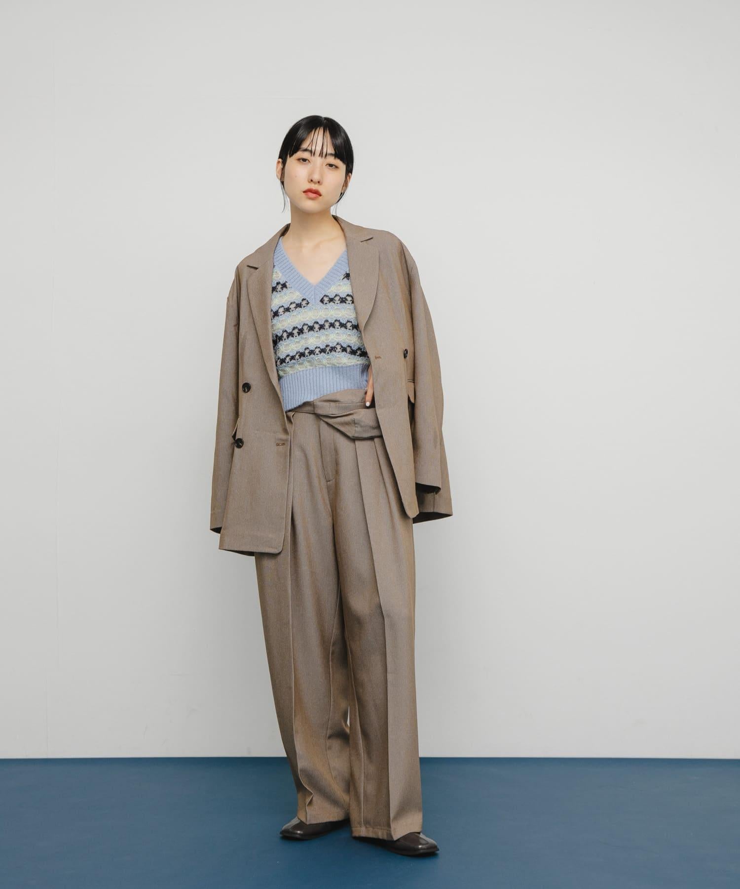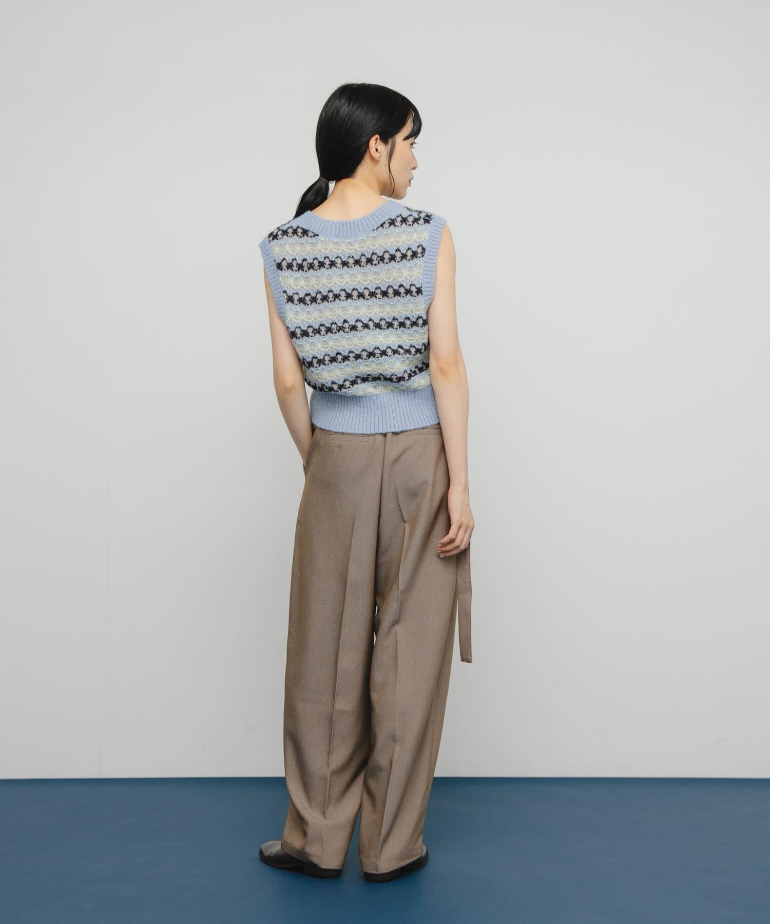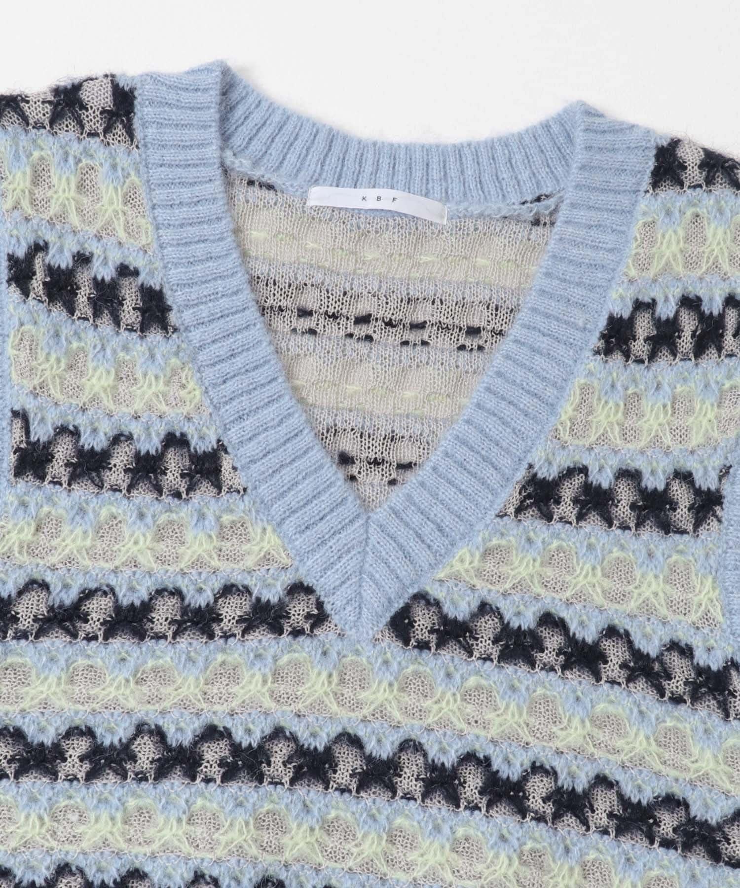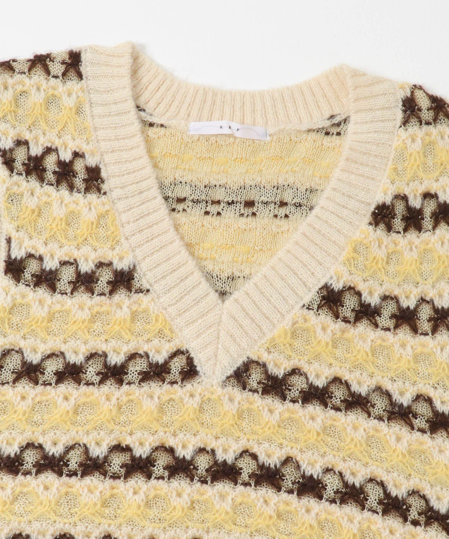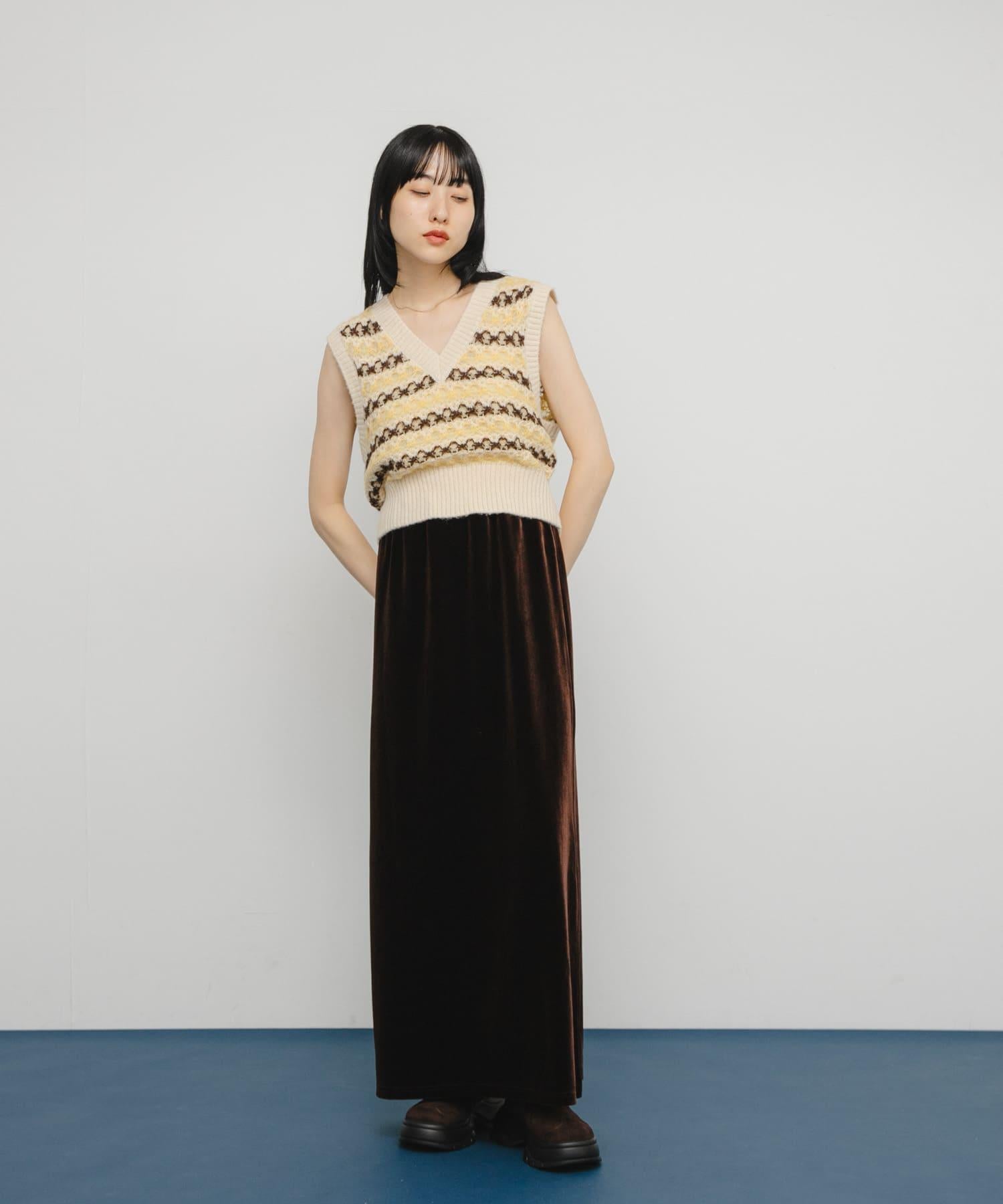 蓬鬆的馬海毛風格針織馬甲,配以醒目的圖案配色。底層部分由薄紗製成,略帶涼爽感,即使在這個季節也能輕鬆穿著。它可以疊穿在剪接式連衣裙和連身裙上,也可以作為夾克的內層。
