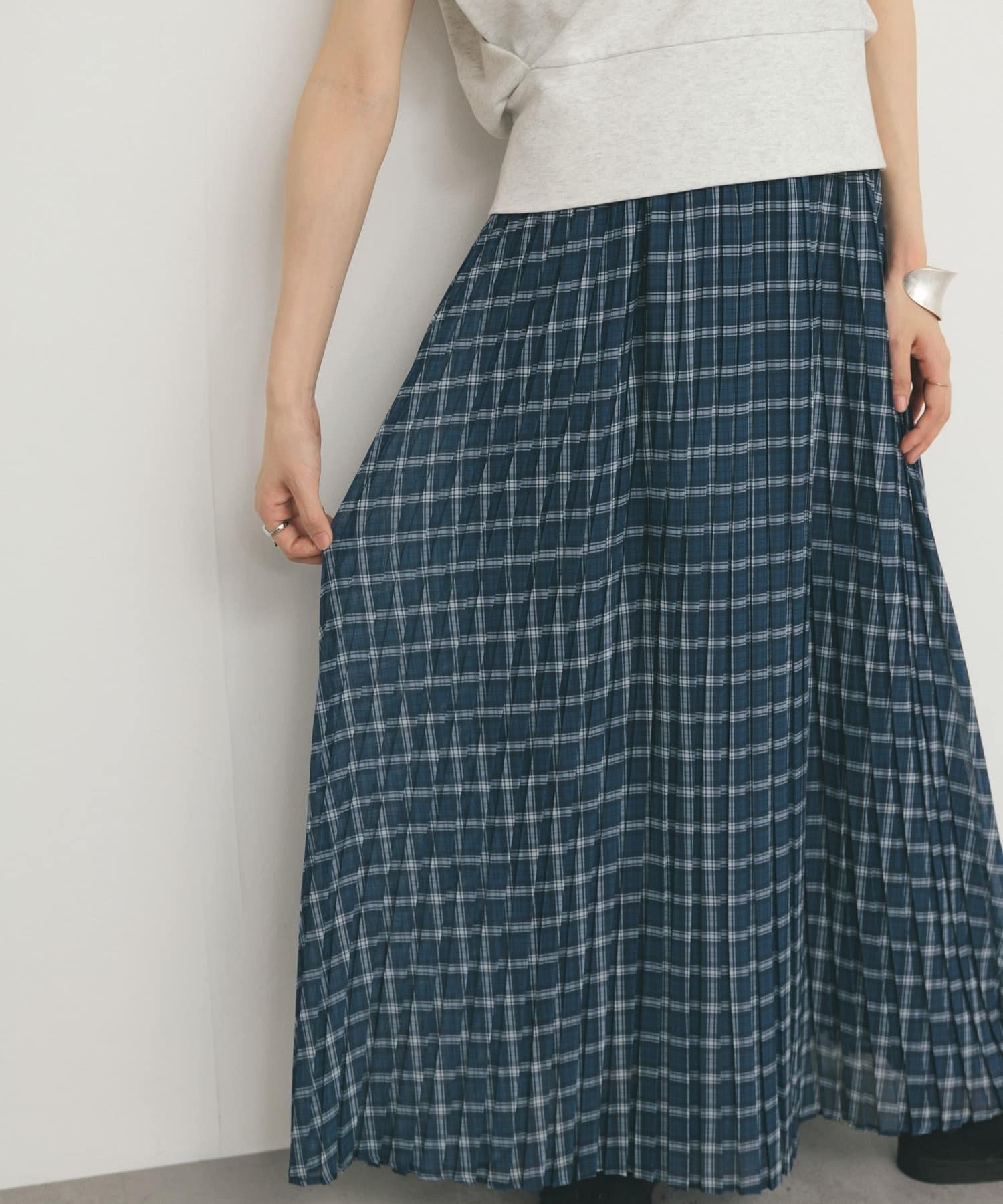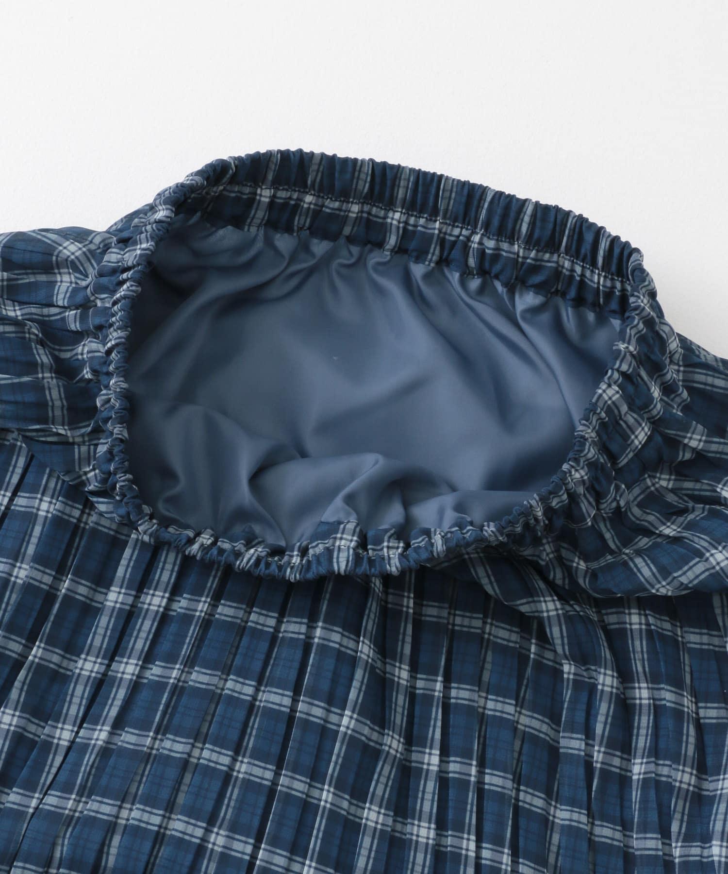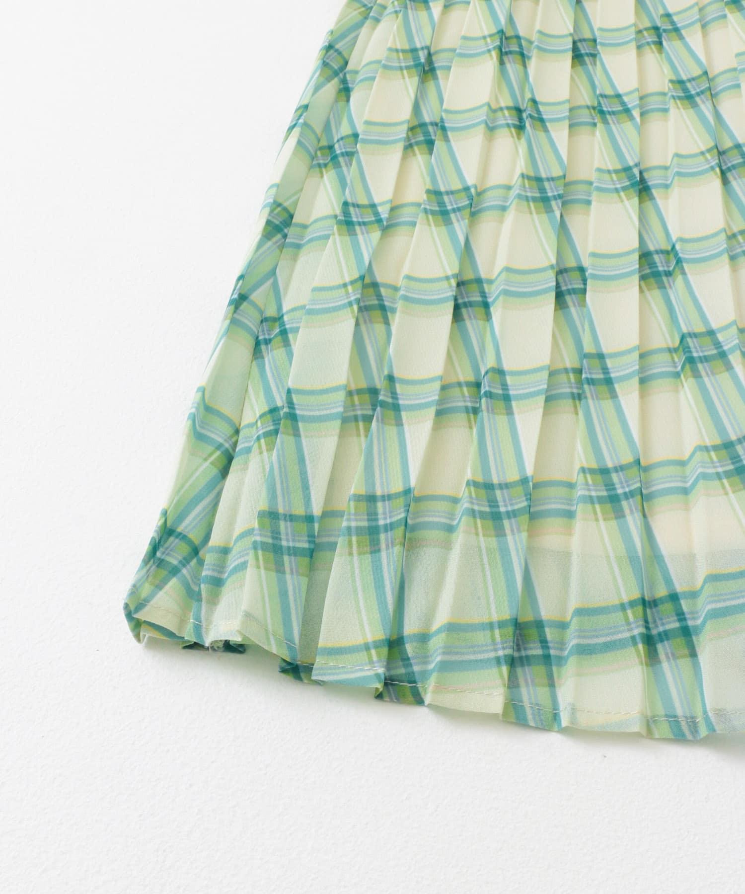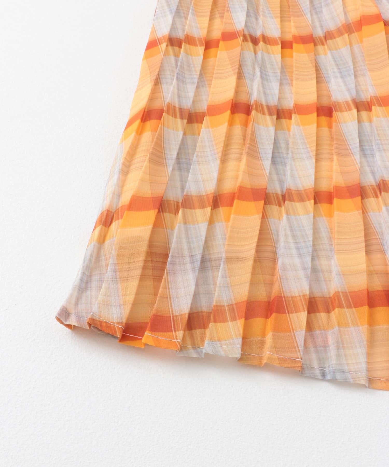 百褶裙採用 KBF 的原創格紋圖案。薄紗材質和細小的褶皺營造出輕盈清新的外觀。腰部全鬆緊設計方便穿脫。可搭配基本款上衣,打造迷人造型。