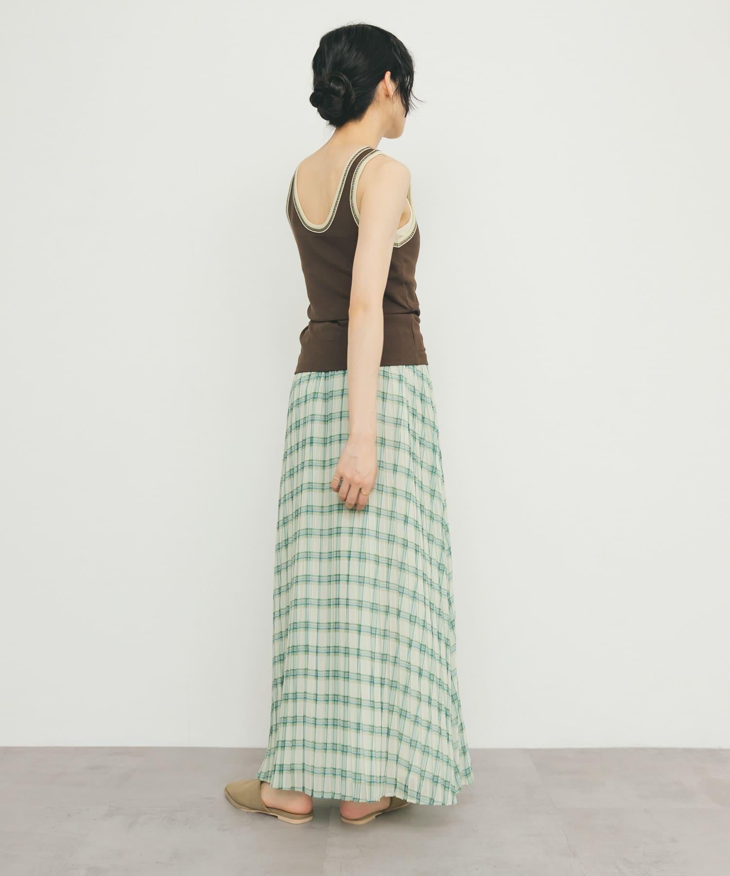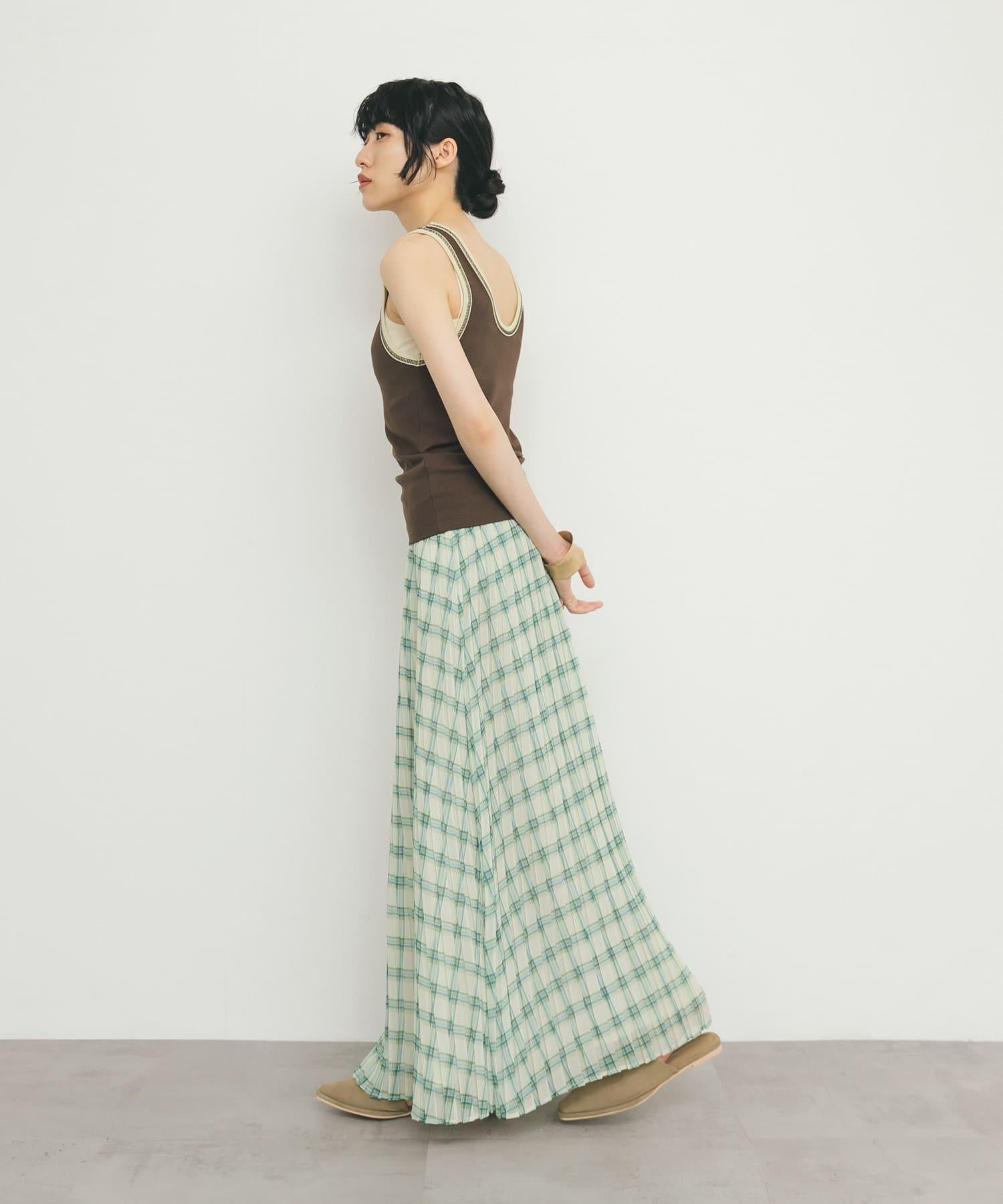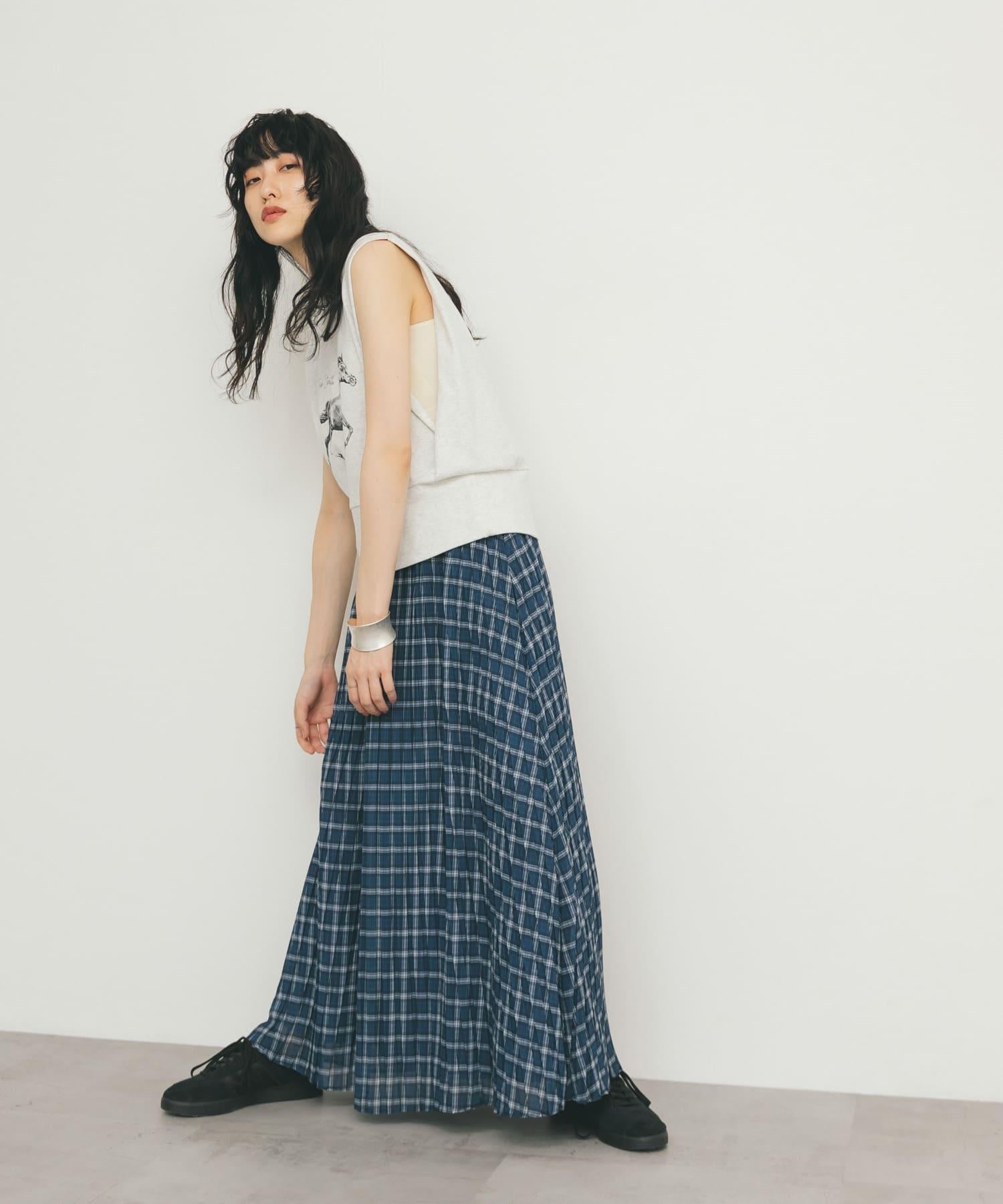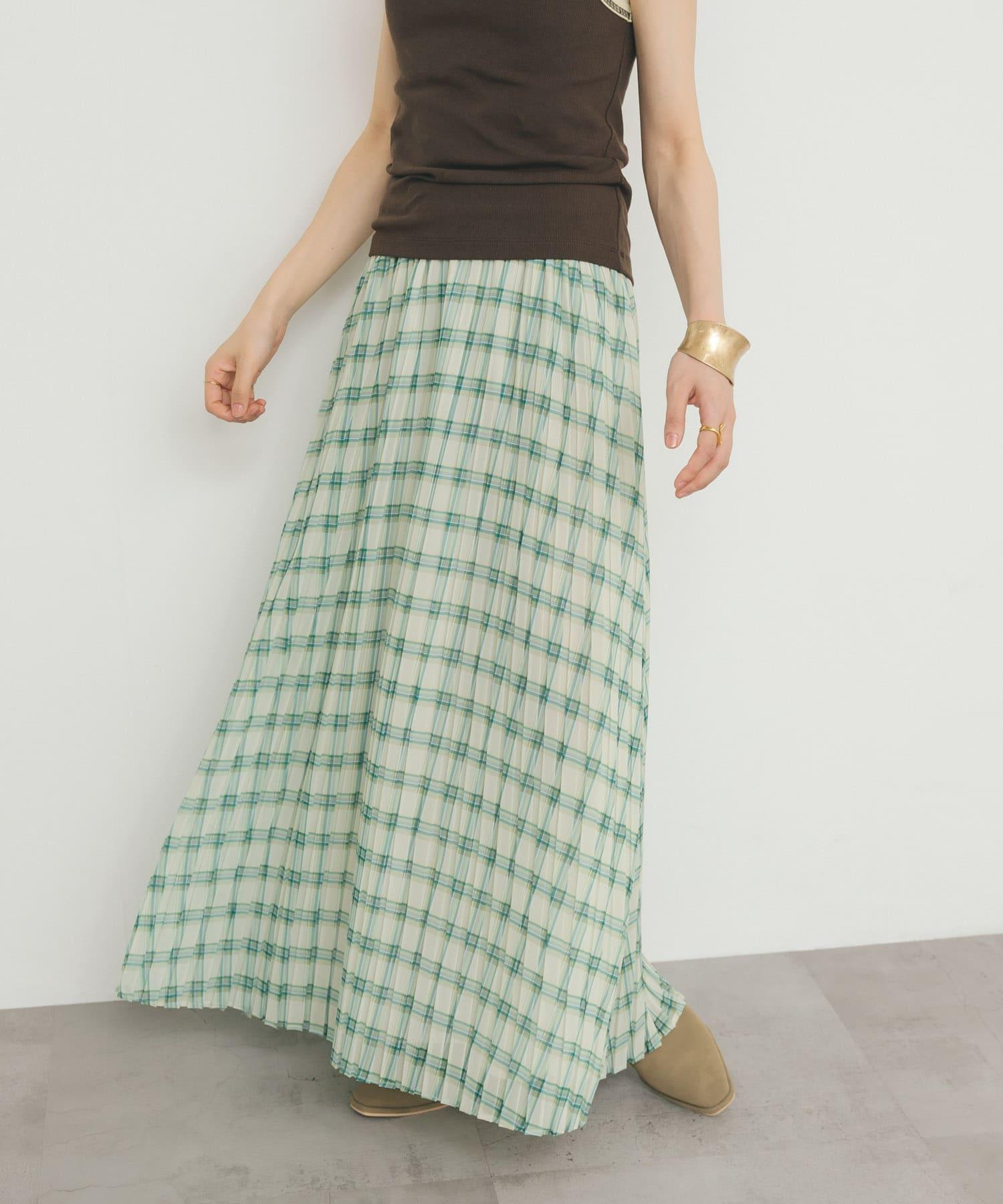 百褶裙採用 KBF 的原創格紋圖案。薄紗材質和細小的褶皺營造出輕盈清新的外觀。腰部全鬆緊設計方便穿脫。可搭配基本款上衣,打造迷人造型。