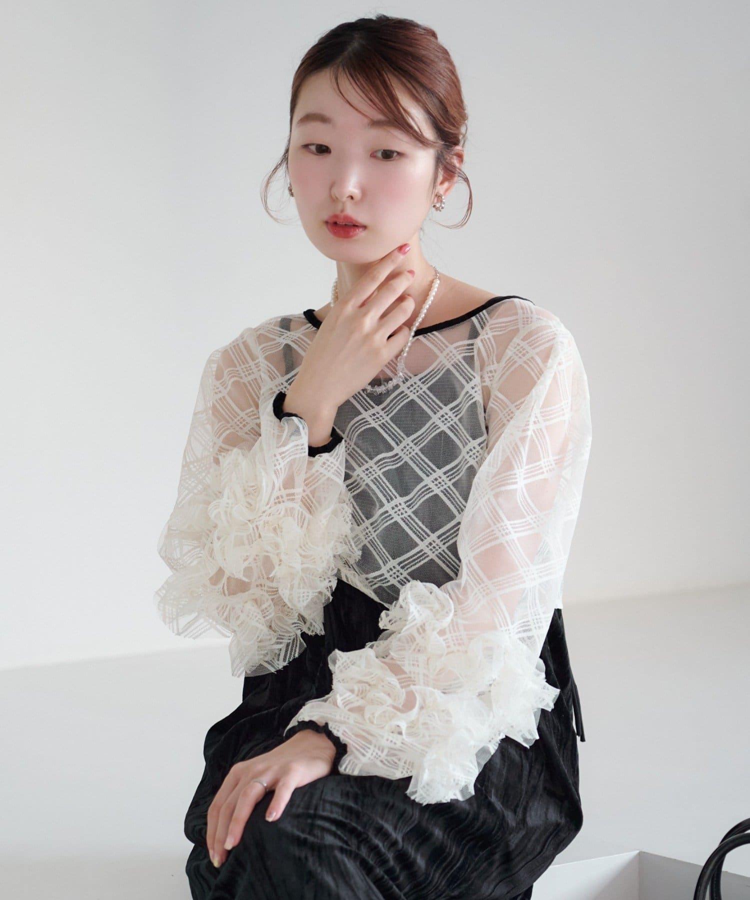 上衣採用略有彈性的透視格紋面料,透明度適中,光澤優雅。