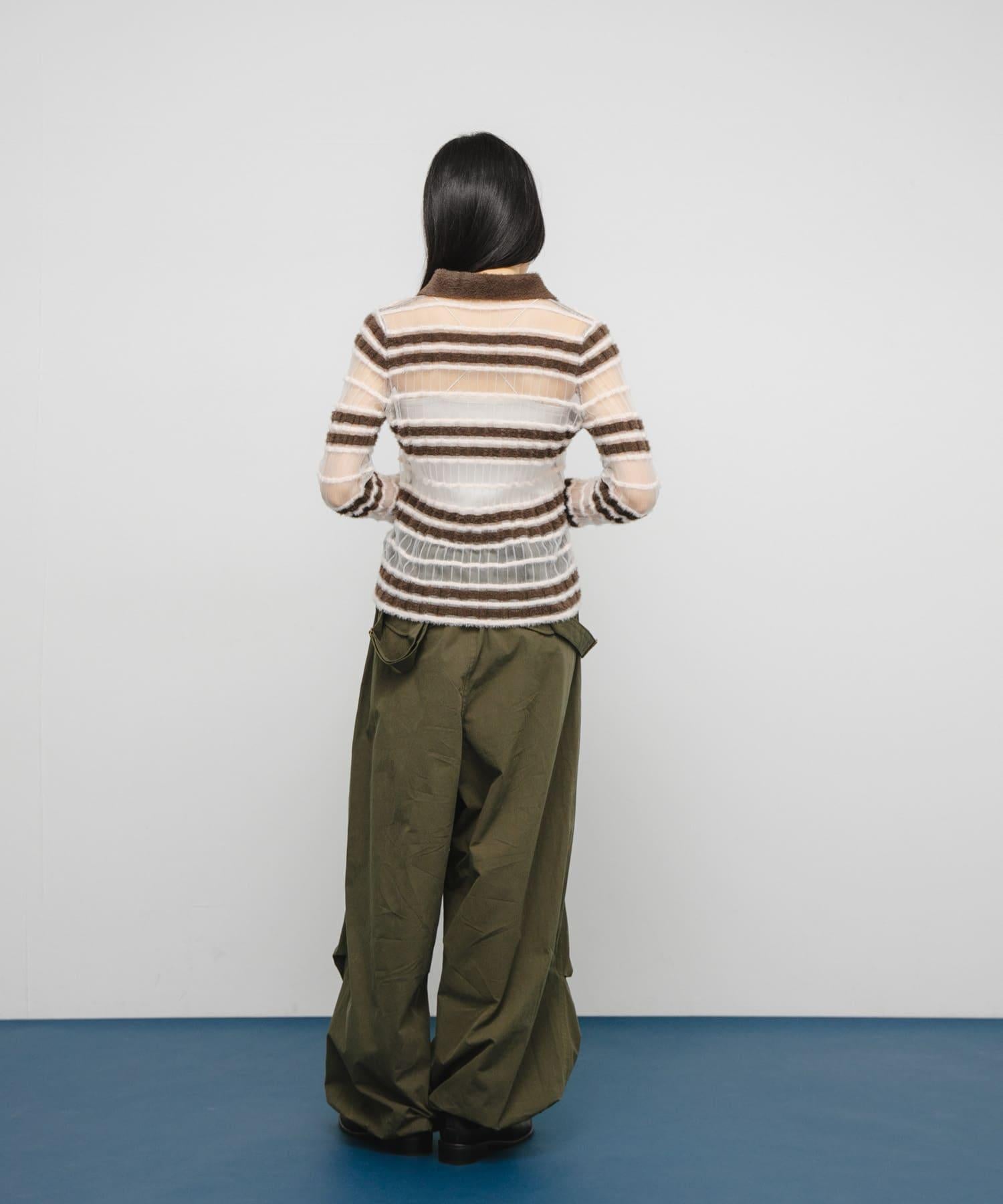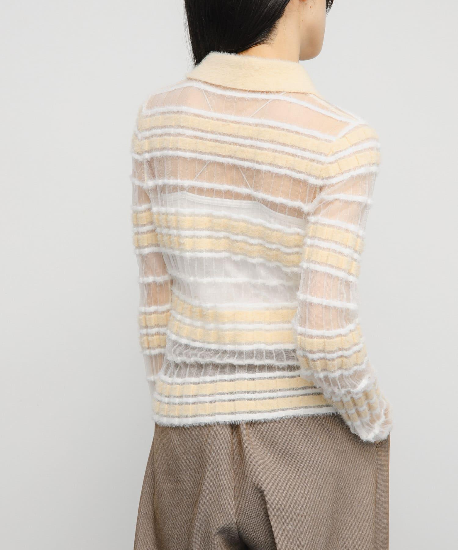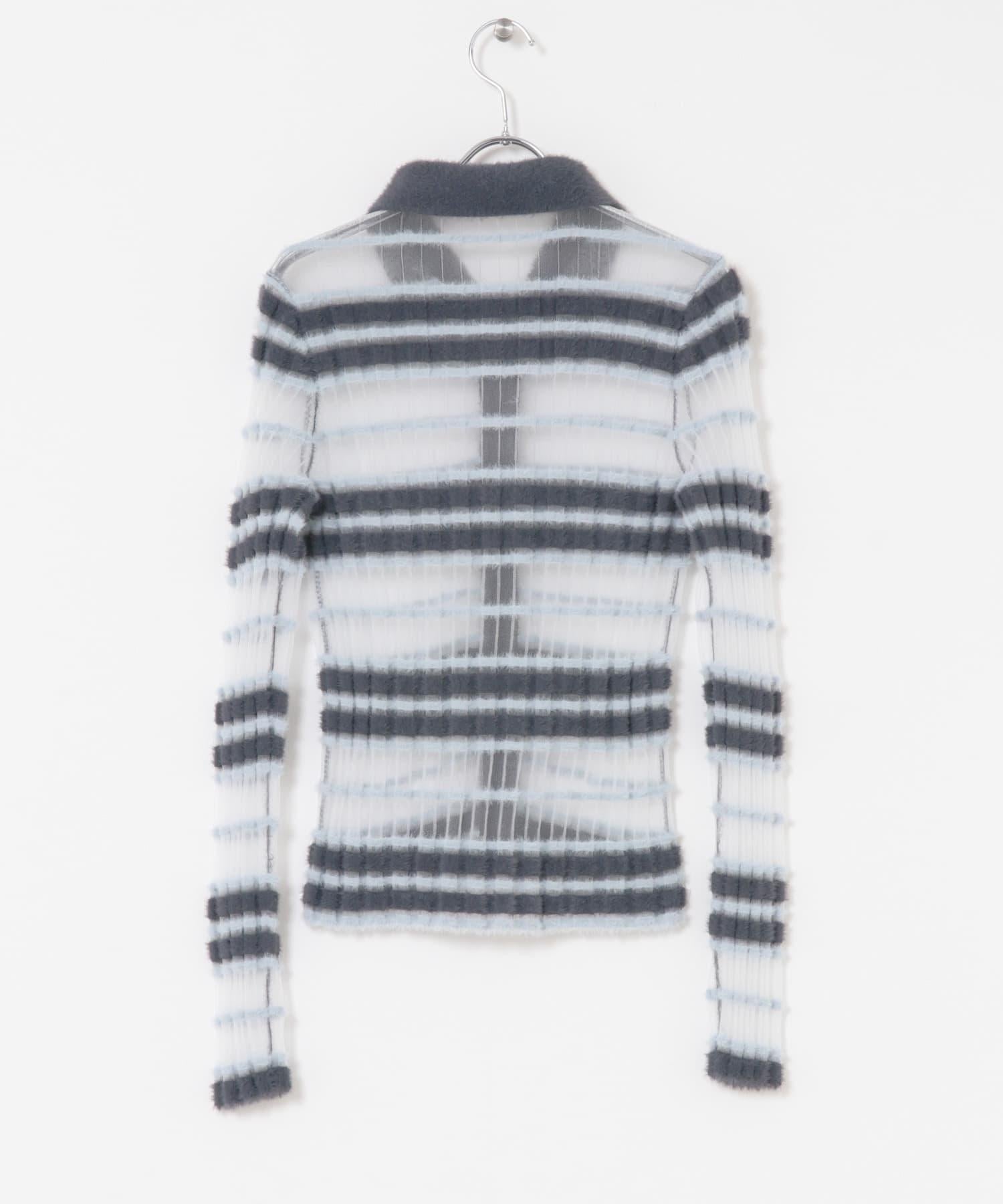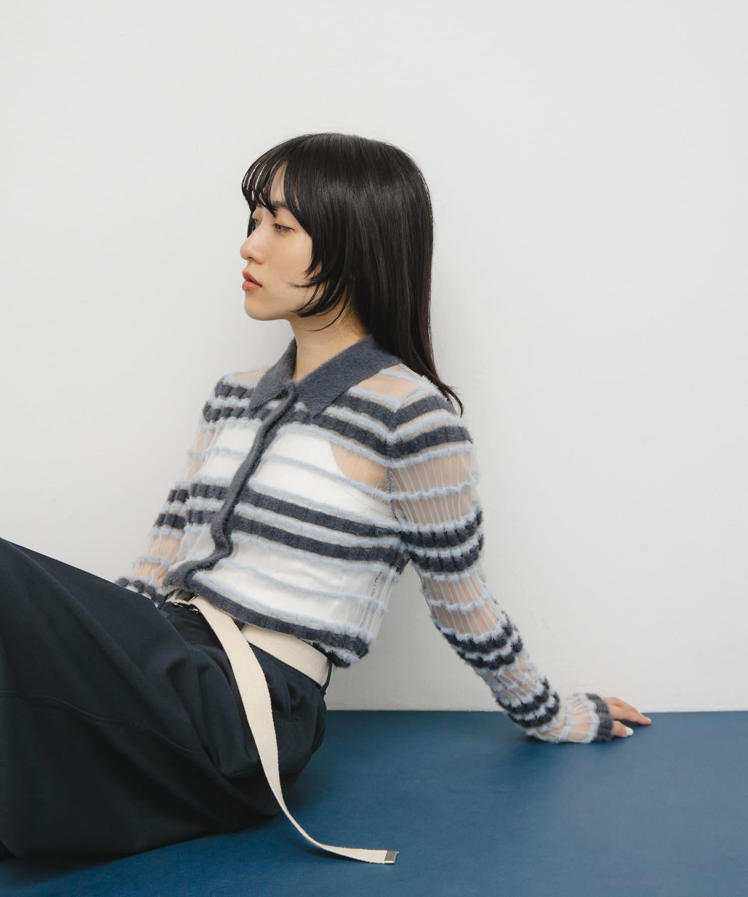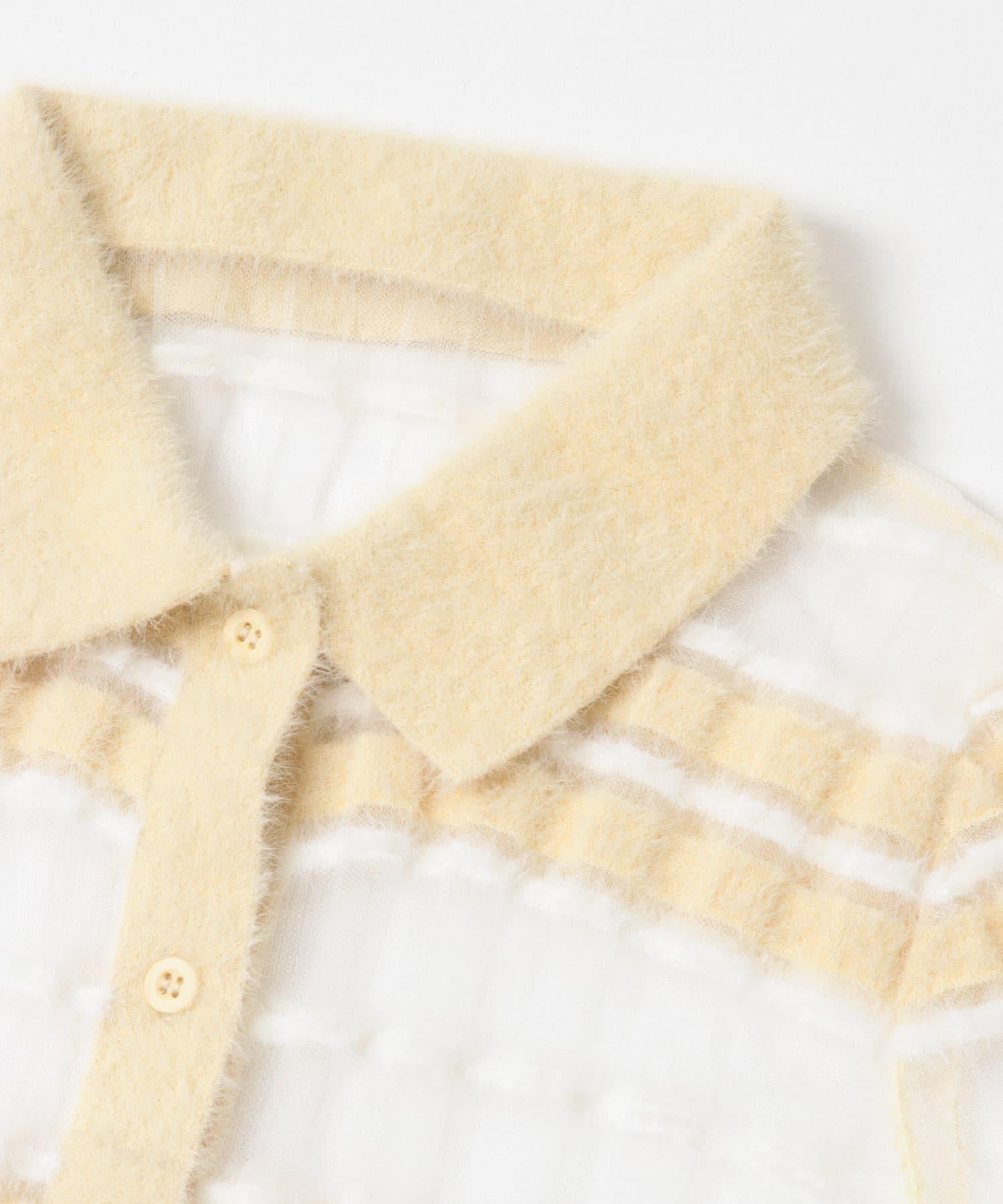 採用與透明格紋羽毛針織衫(KBA6-22R020)相同的紗線編織出透明邊紋。儘管外形小巧,但 RIB 針織確保穿著無壓力。Polo 規格也是關注的重點,只需穿上它就能牢記潮流趨勢。為偏向深色的秋冬搭配增添一抹魅力。