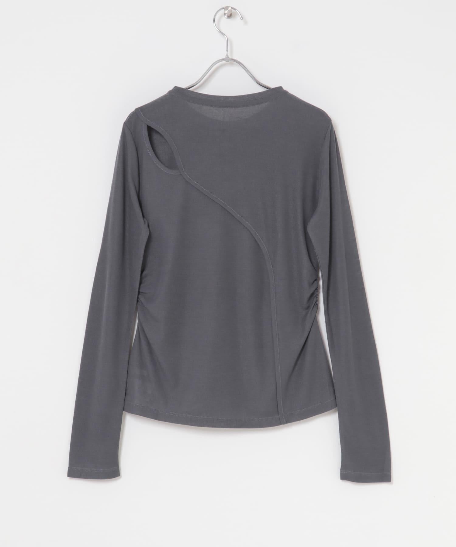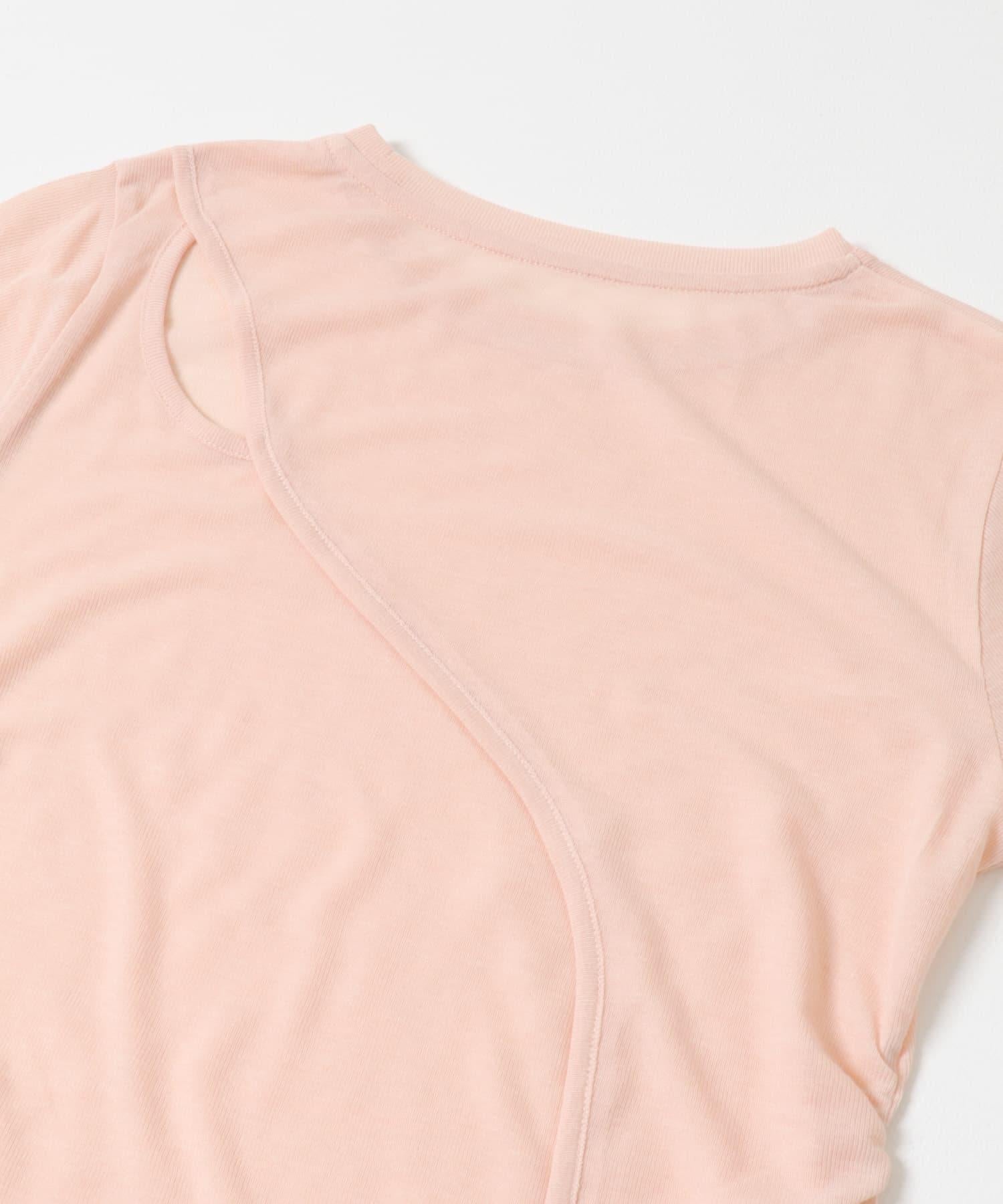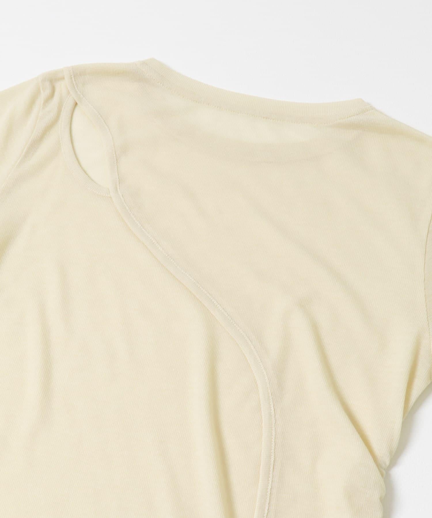 乍看之下,這款剪裁縫製的服裝就像一件簡單的長 T 恤,但適度透明的肋部設計讓它看起來更有女人味。背部的款式設計奇特,肩部的鏤空設計巧妙地展現了肌膚。這是一款既可作為內搭又可作為主衣的單品。