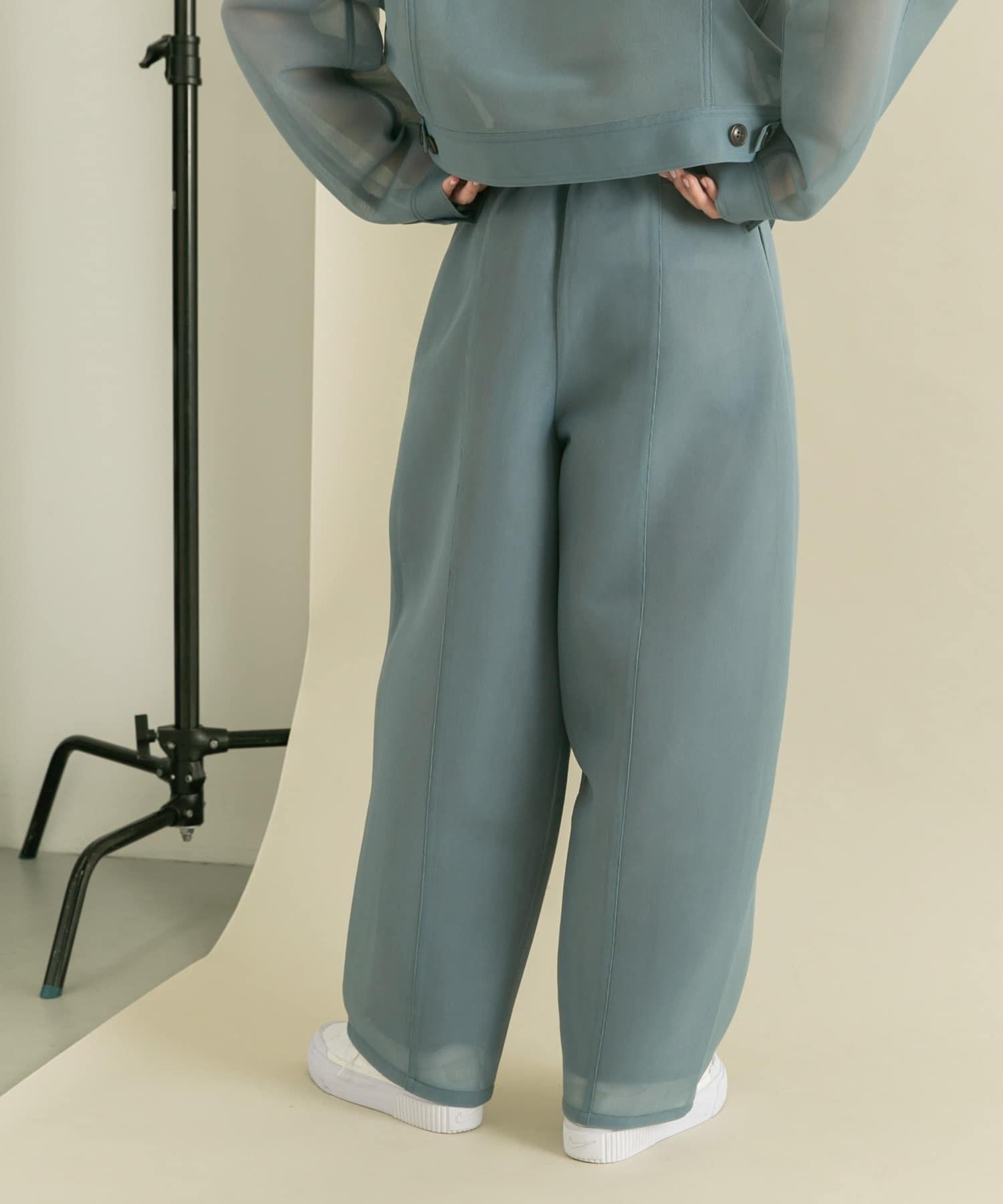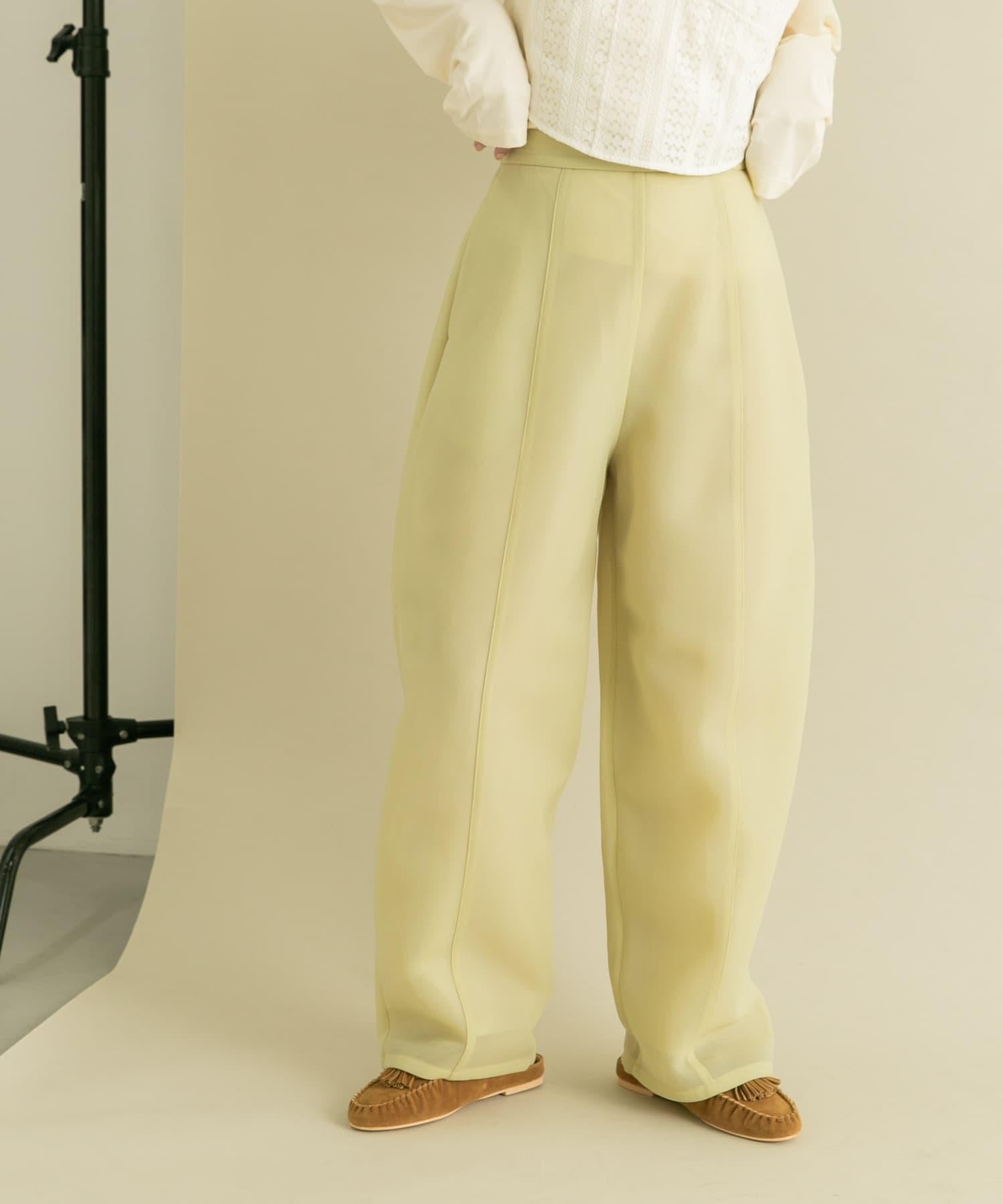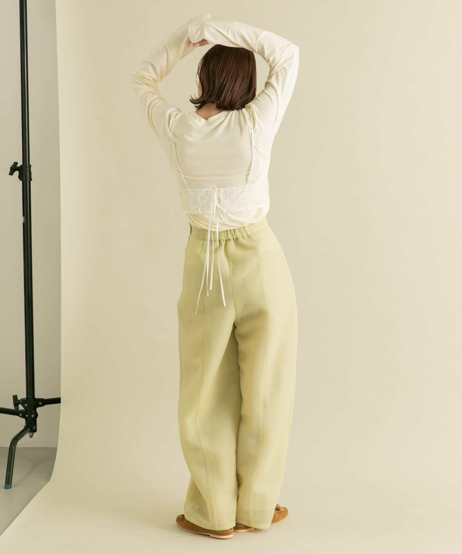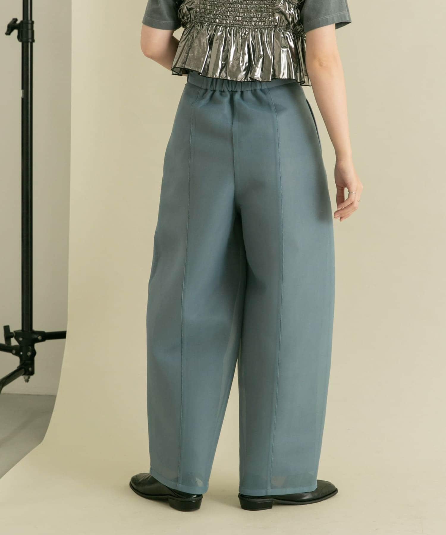 長褲具有瓦楞紙板材料獨有的良好回彈性。透薄的質地使其更加輕盈。自然彈力和背部鬆緊設計帶來舒適感。繭形細節的剪裁是基本款 TEE 的絕佳搭配。