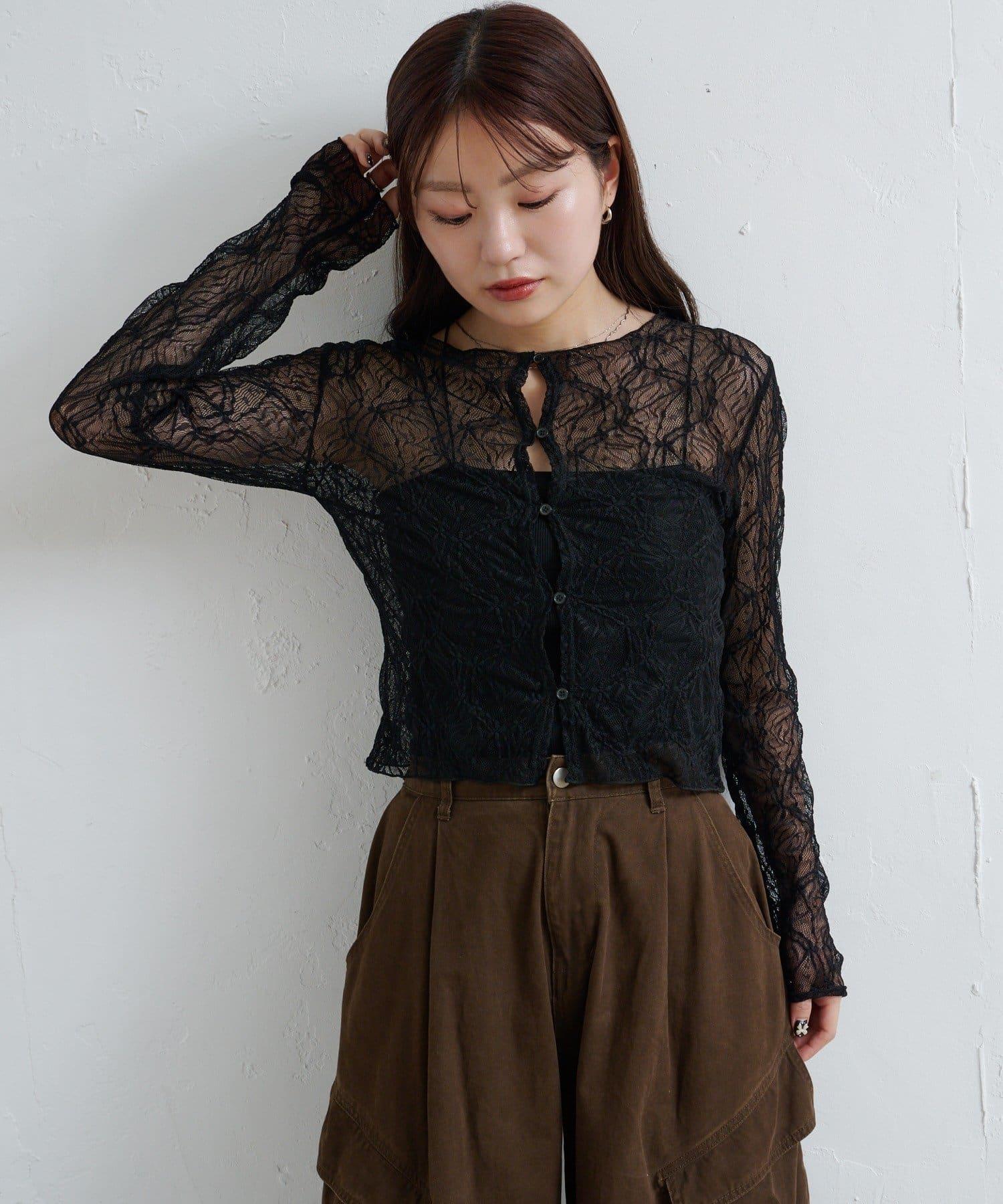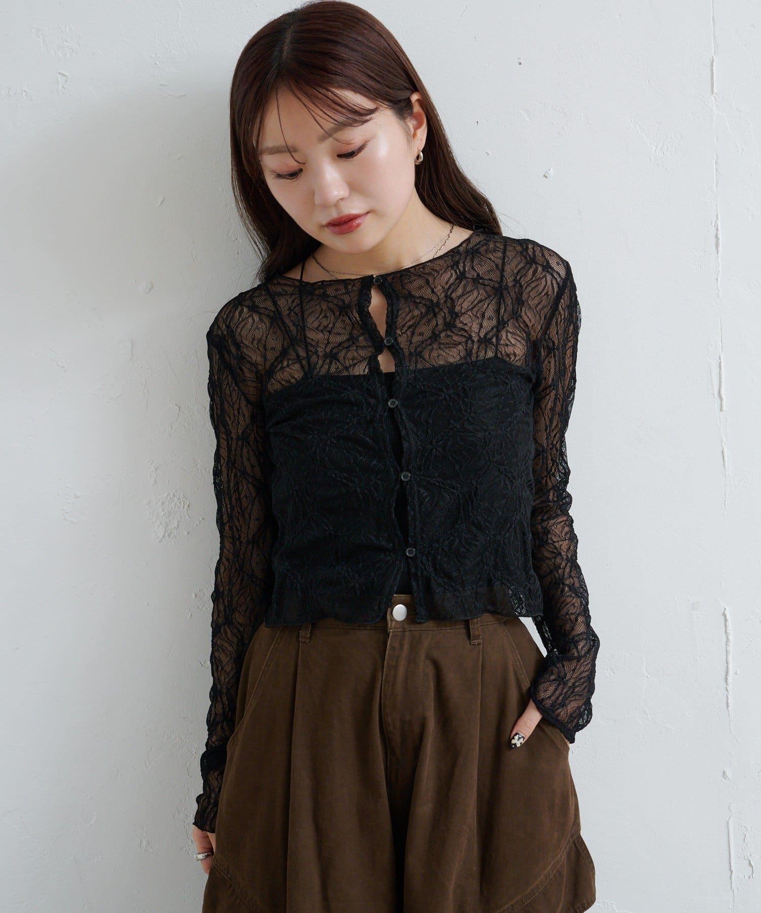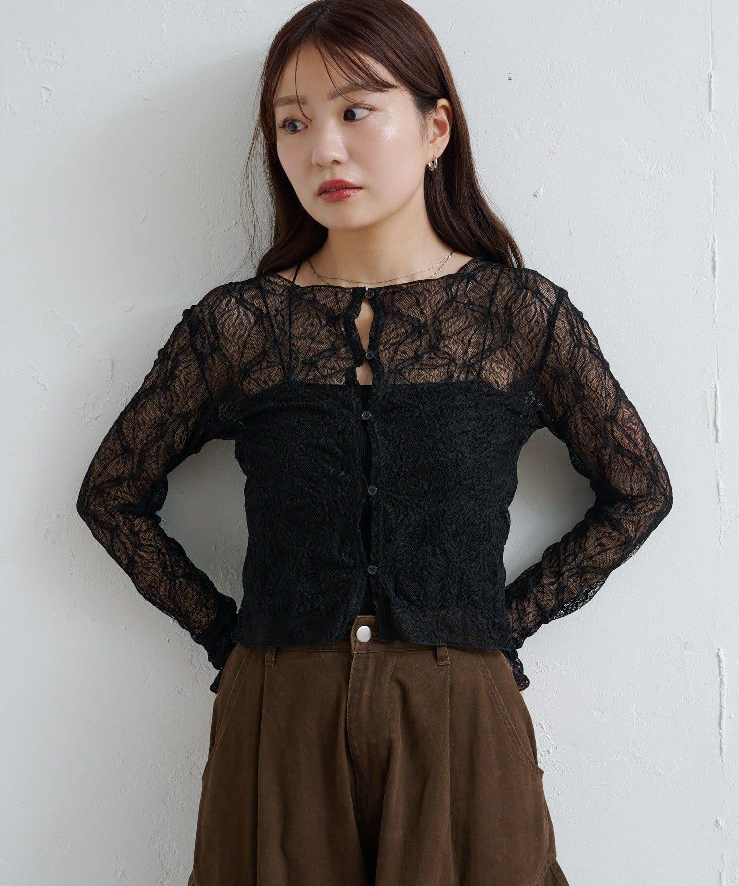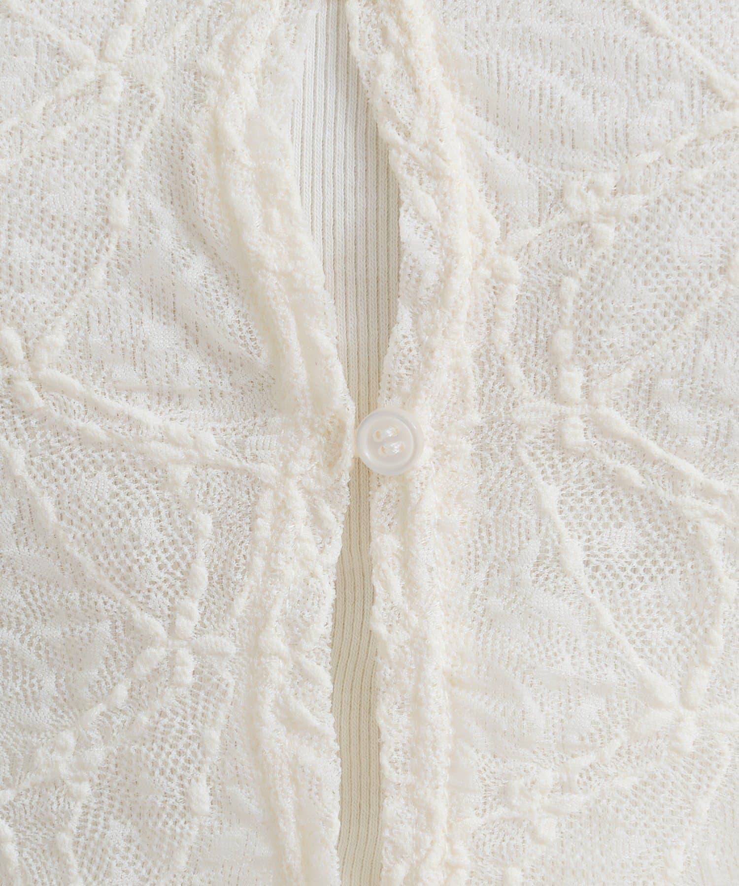 這款雙面透視開衫採用精緻的蕾絲面料,盡顯女性柔美氣質。