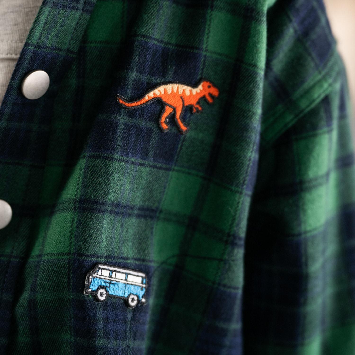 正面繡有恐龍和汽車圖案,增添了俏皮感。