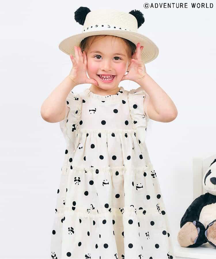 米白色的連衣裙上有一隻或坐或臥的大熊貓,以及遍佈的圓點圖案。