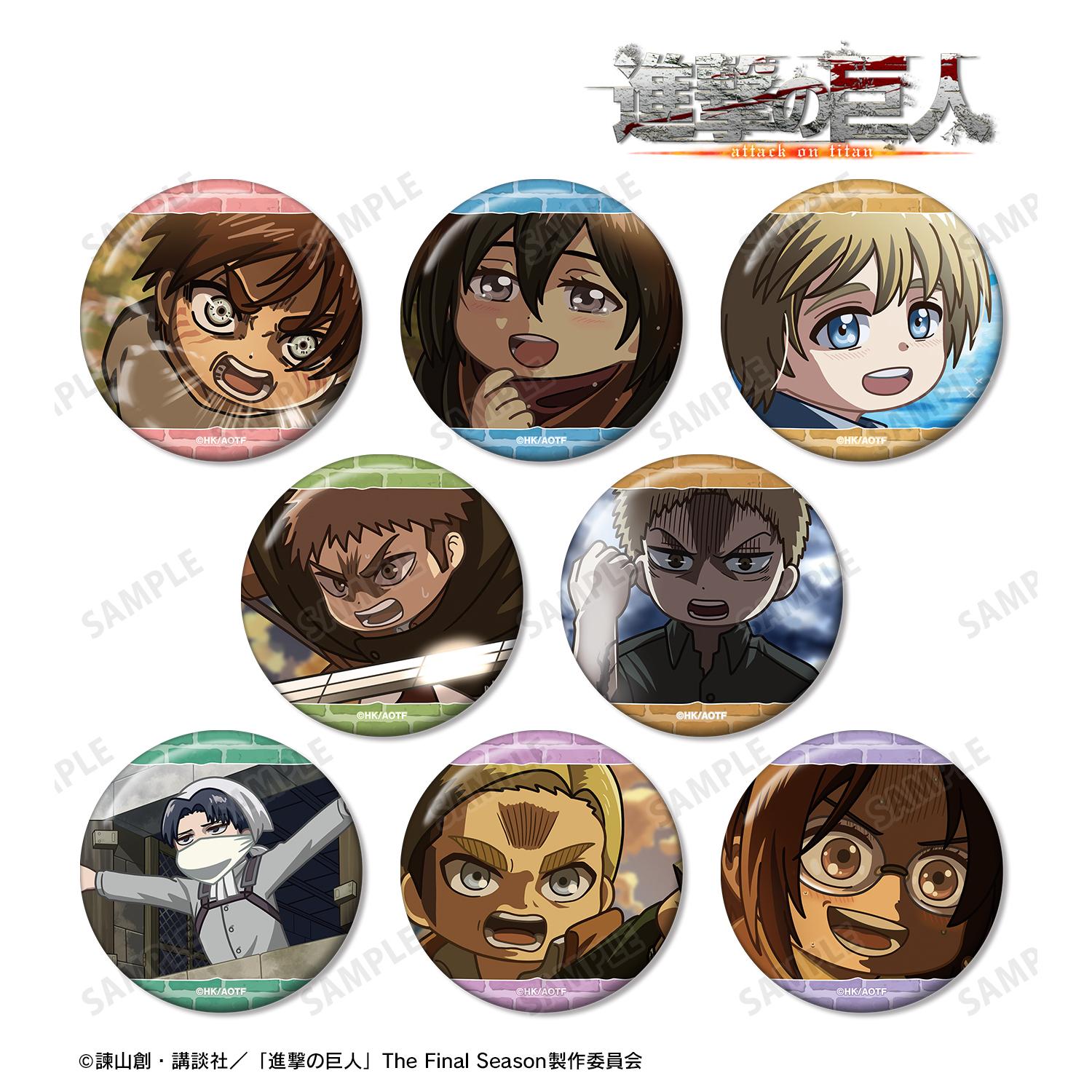 艾倫、三笠、阿明、讓、萊納、列維、埃爾文和漢吉的精彩畫面都被變形制作成了罐頭徽章。
