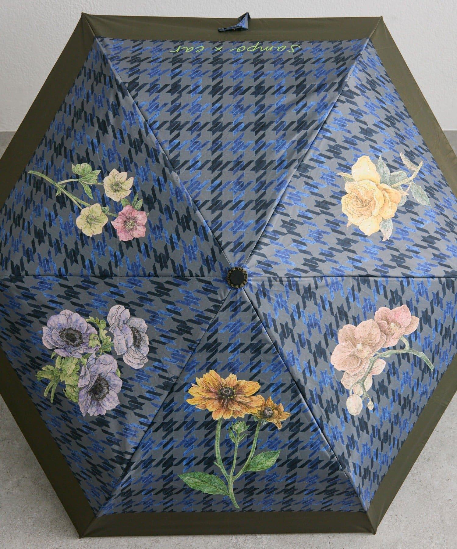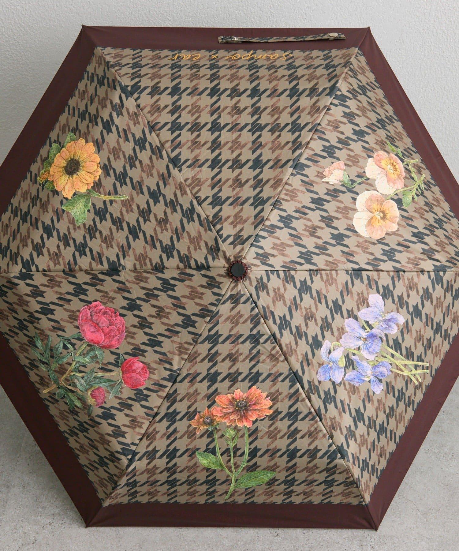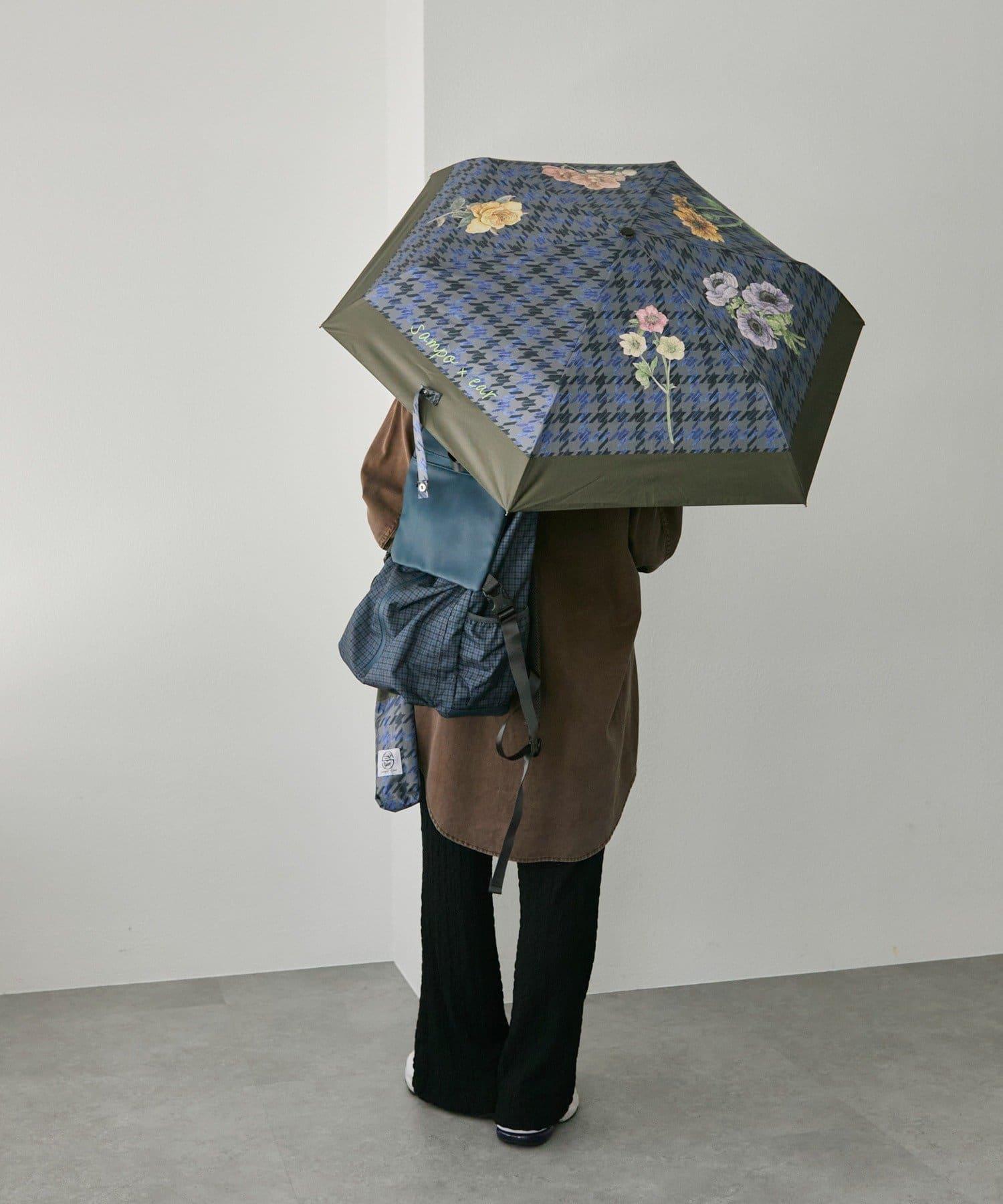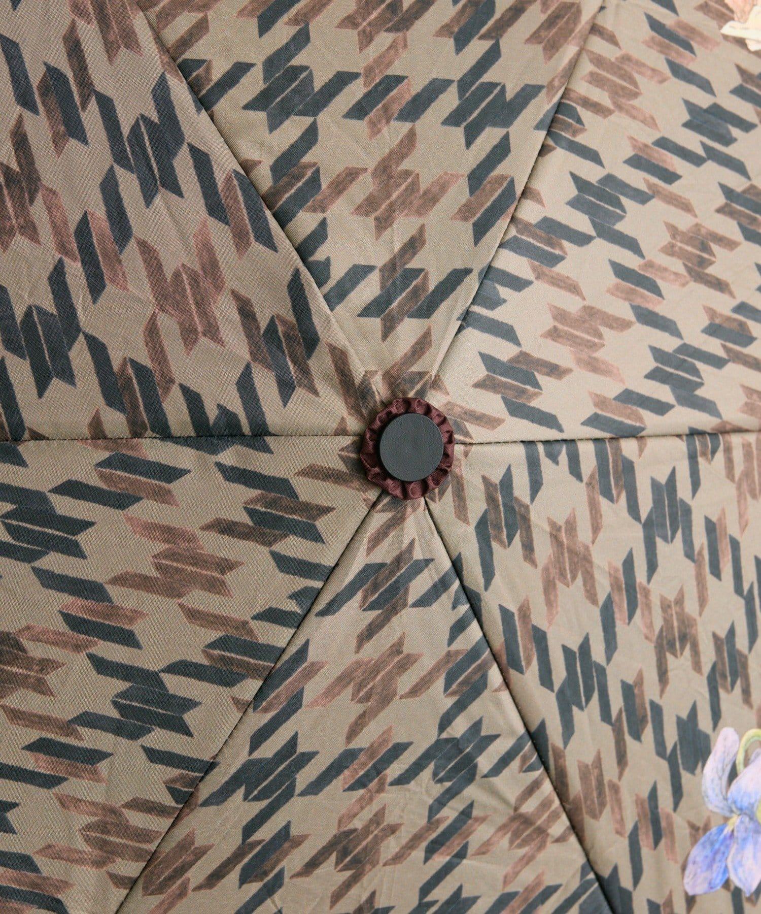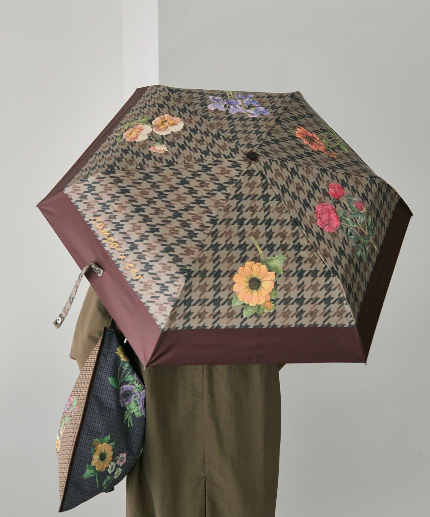 摺疊傘上交錯的格子和花朵圖案,晴雨兩用。
