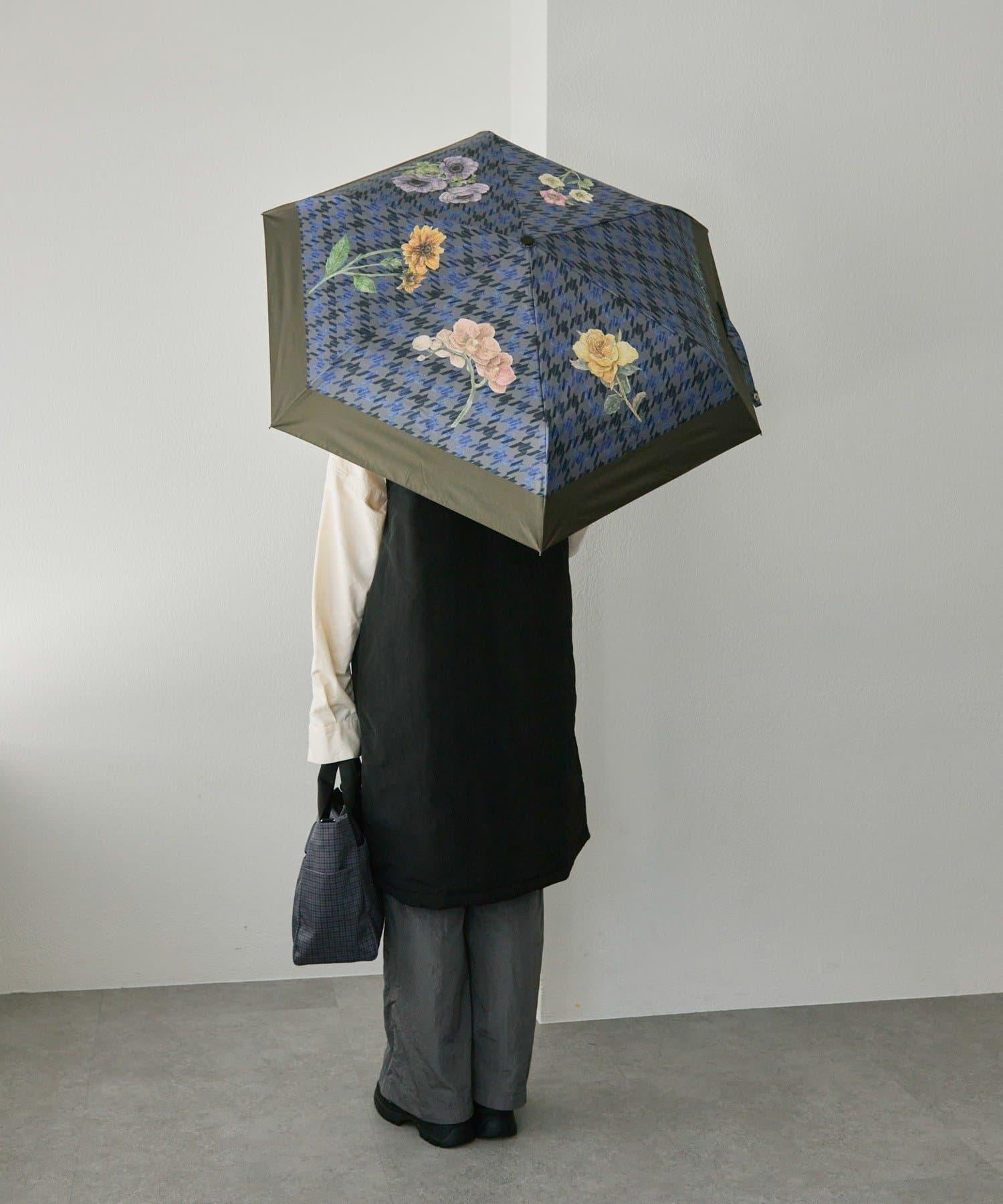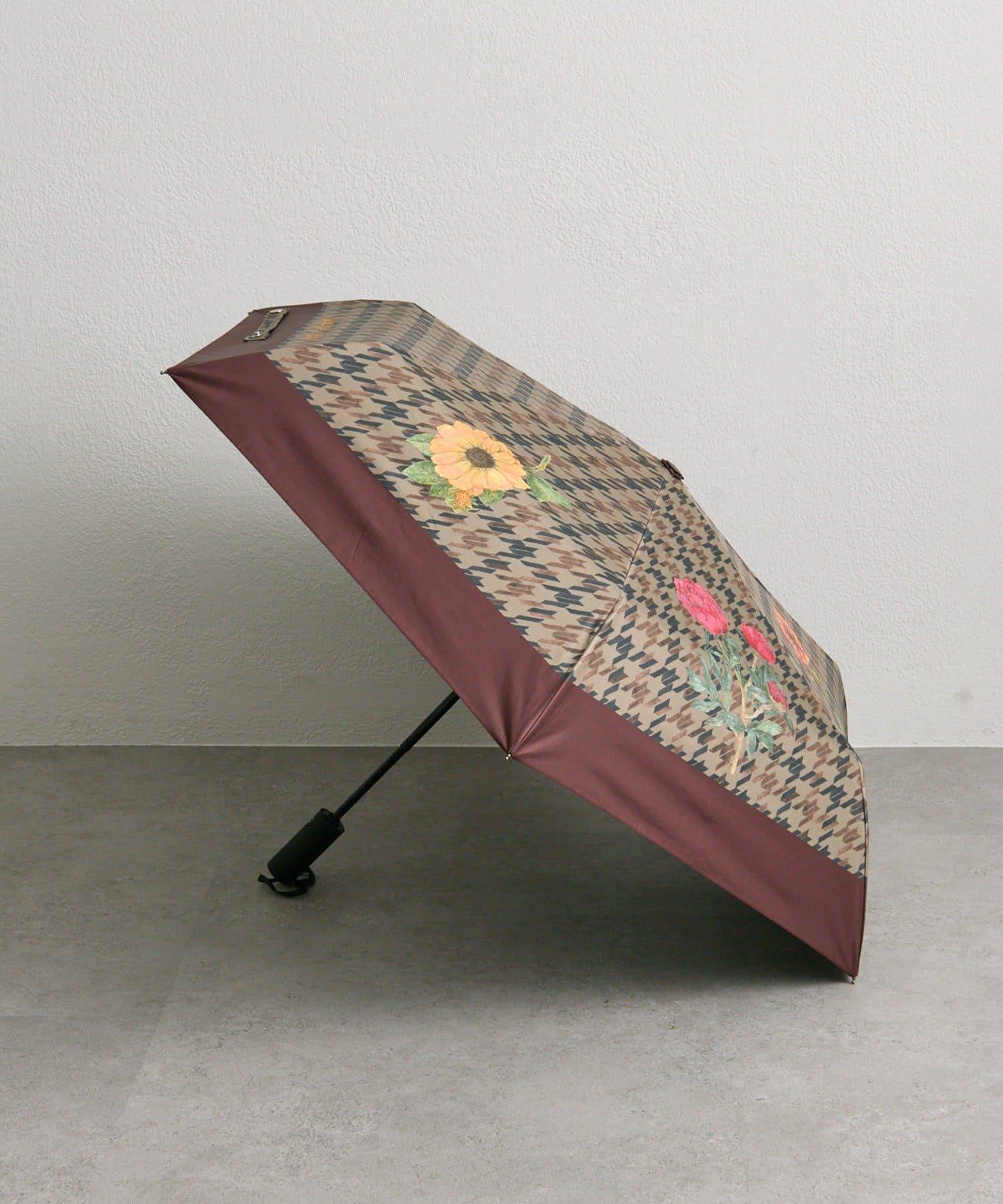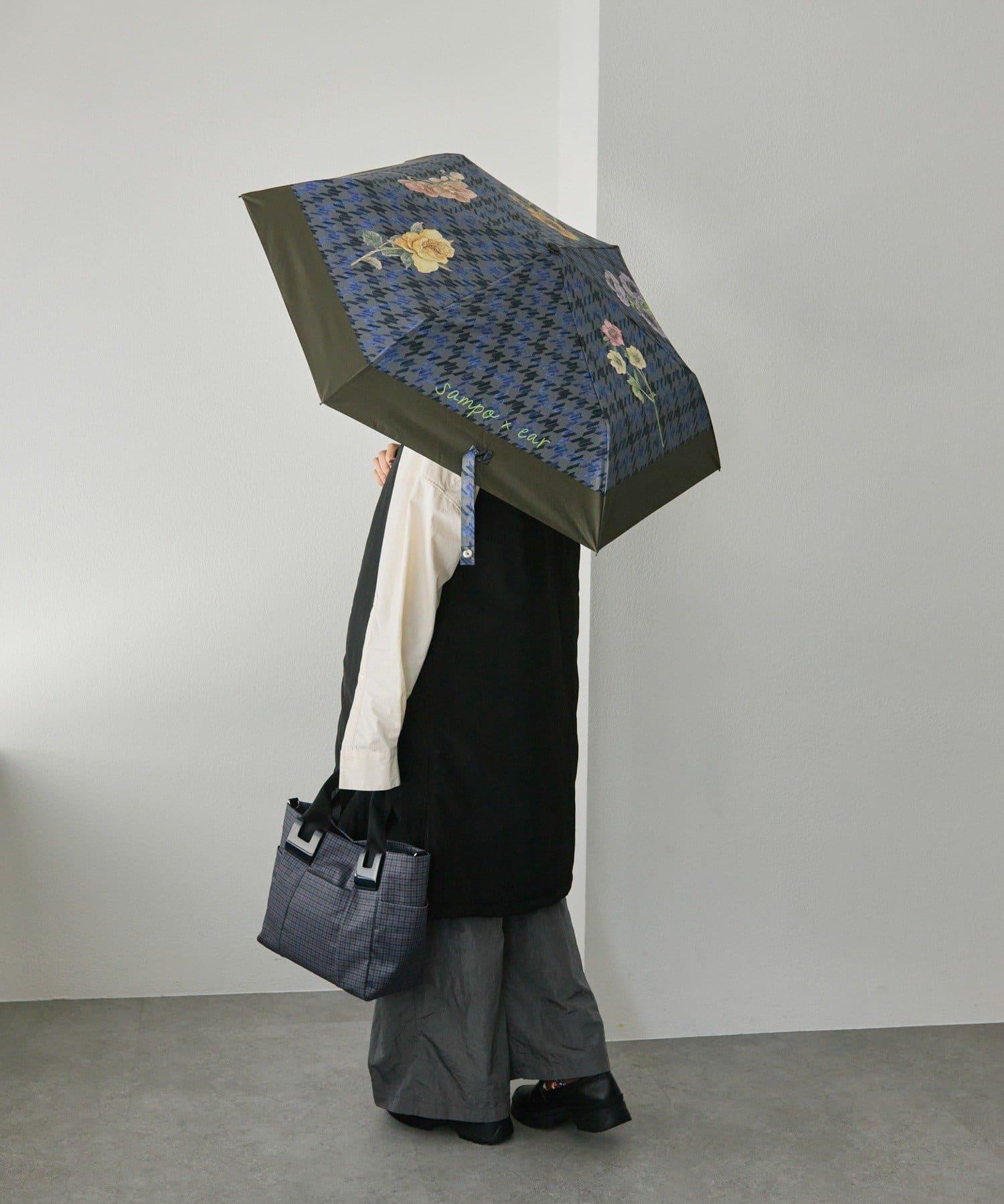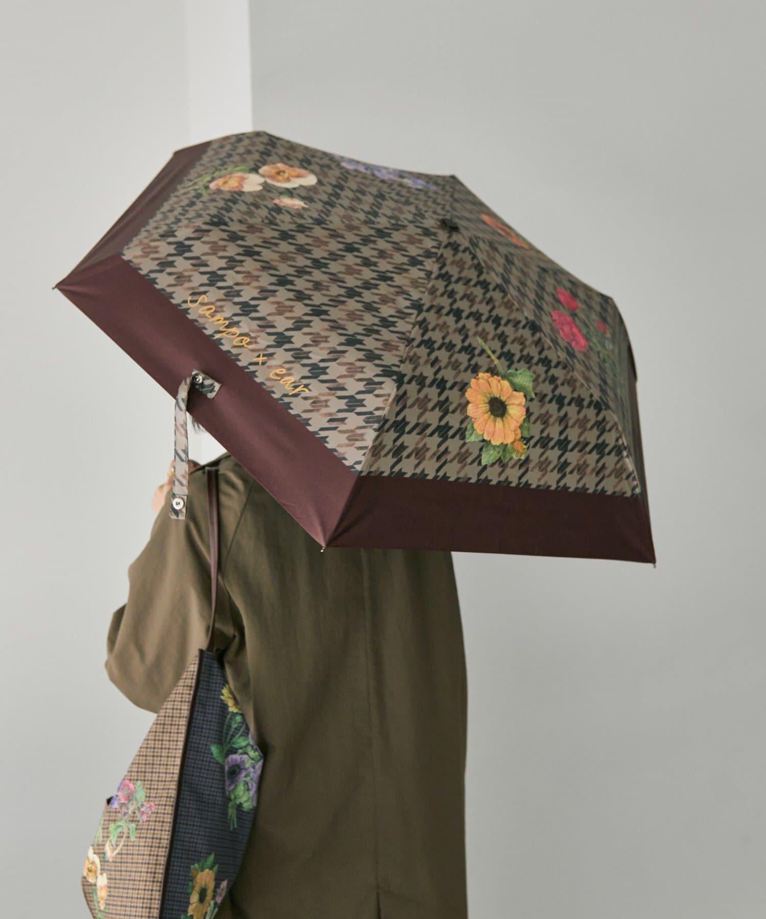 摺疊傘上交錯的格子和花朵圖案,晴雨兩用。