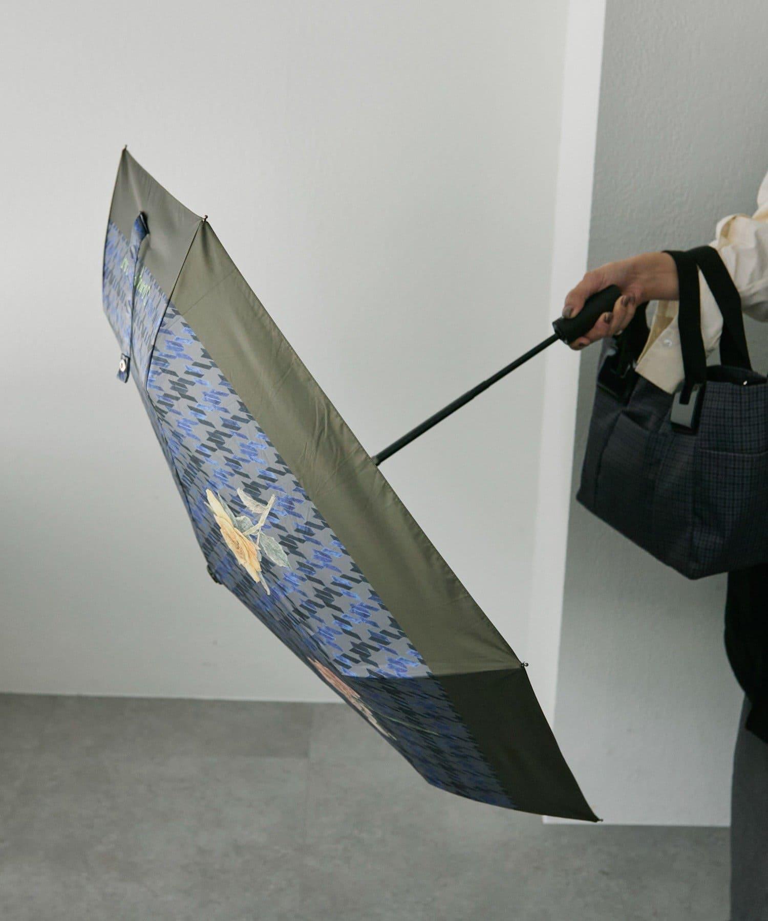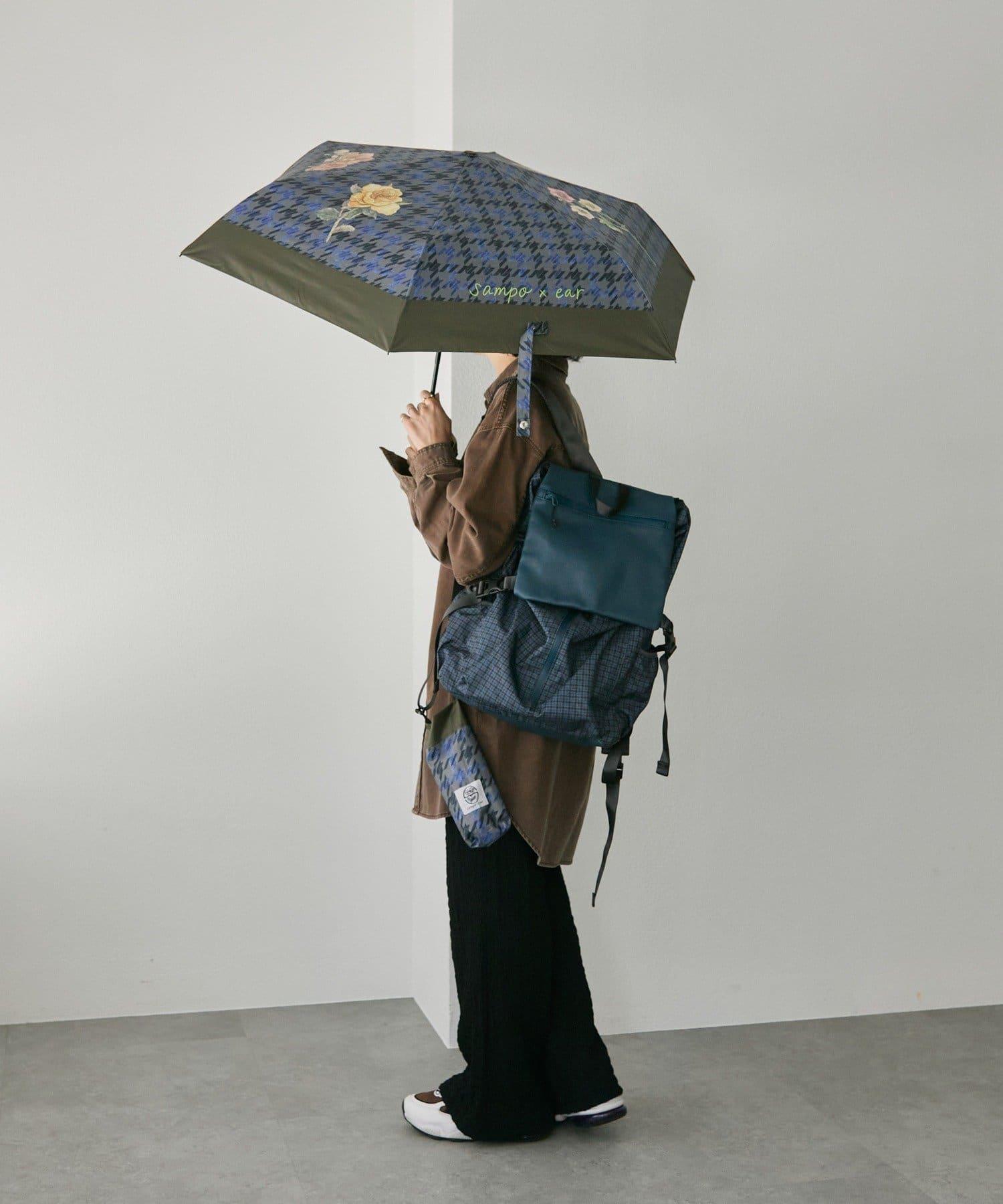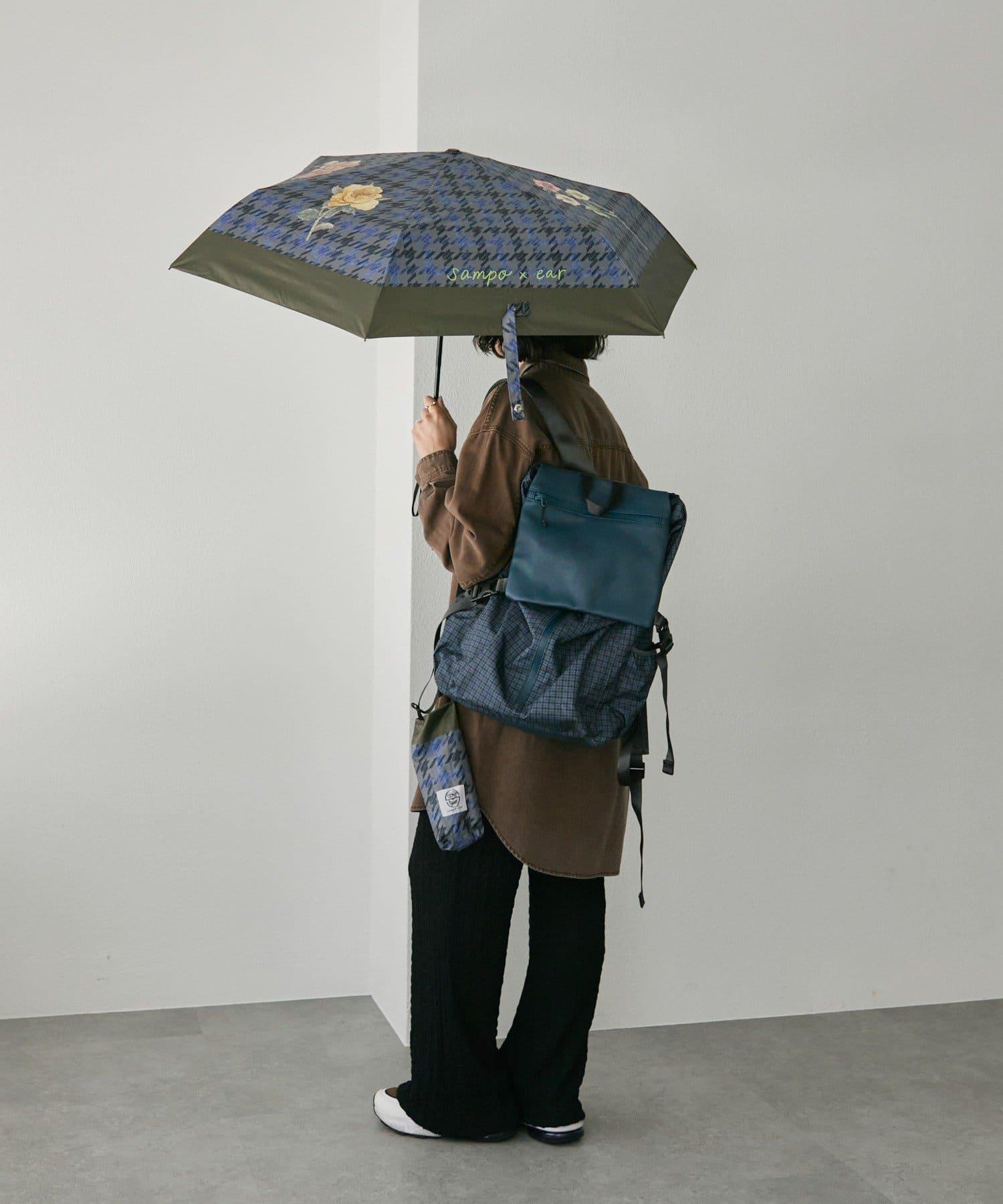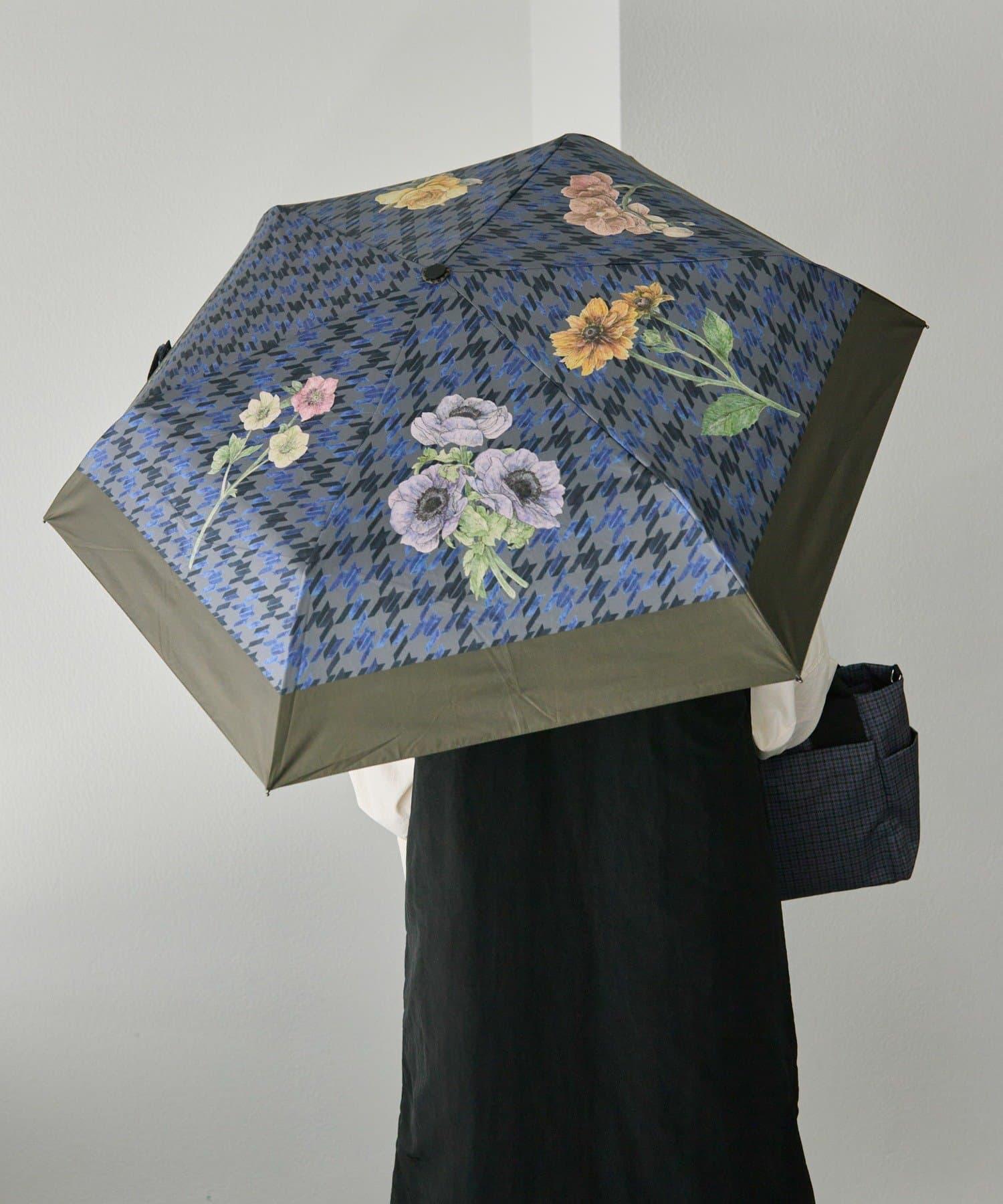 摺疊傘上交錯的格子和花朵圖案,晴雨兩用。