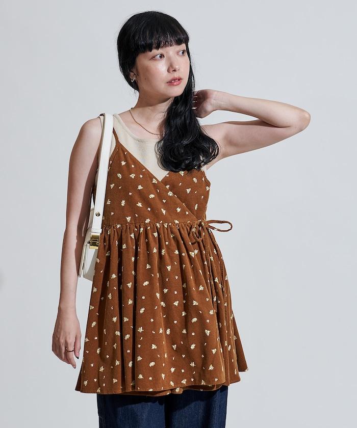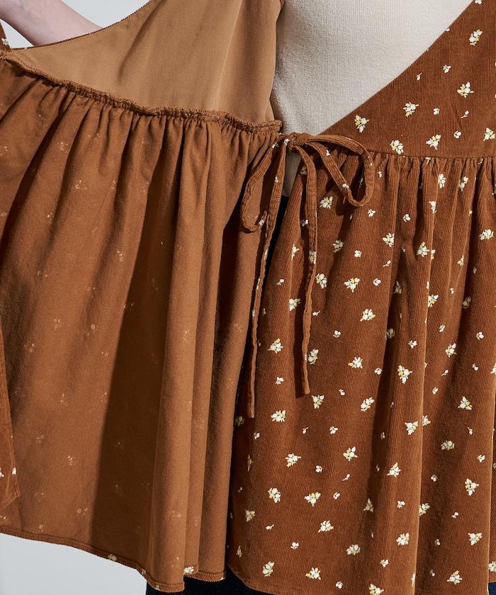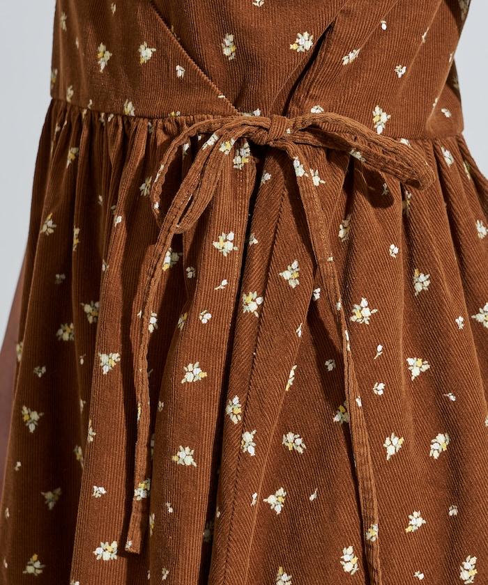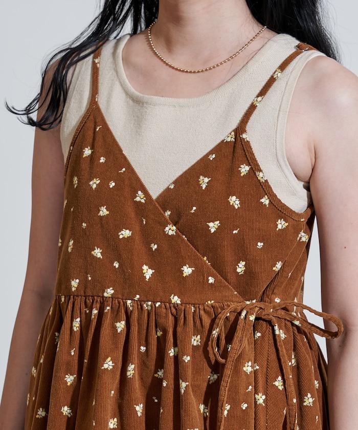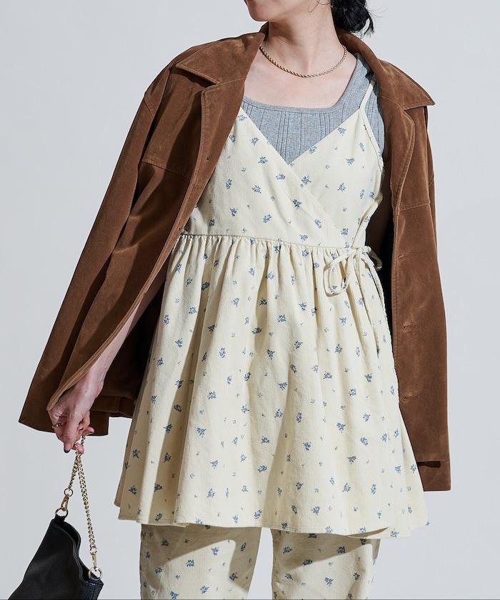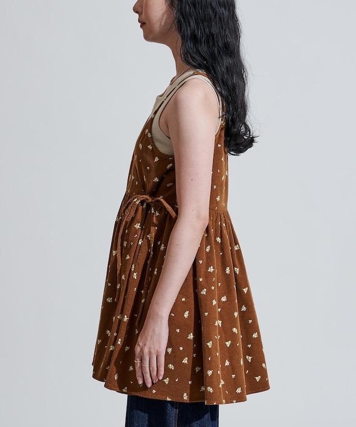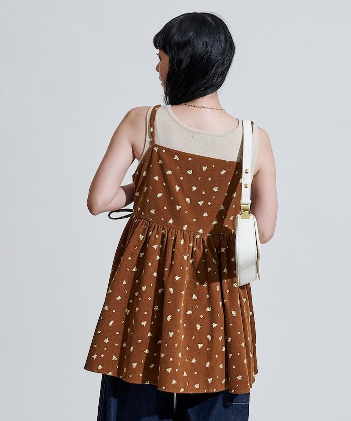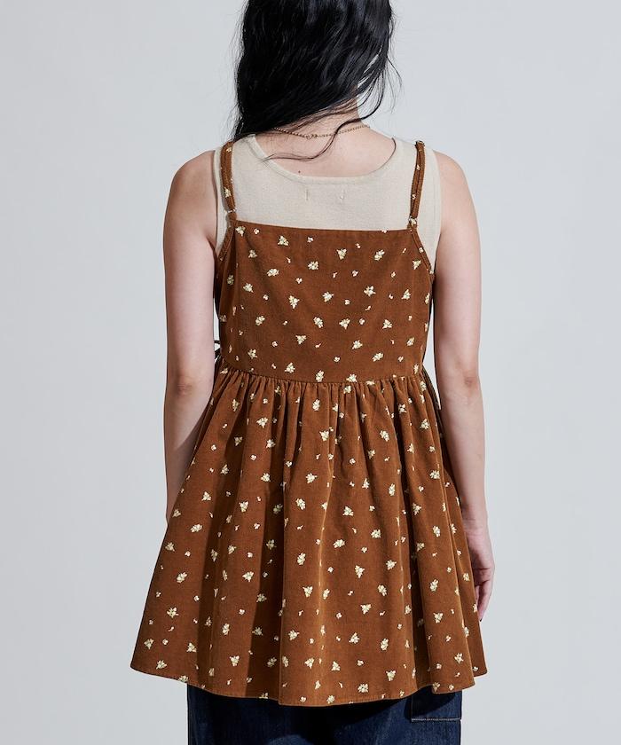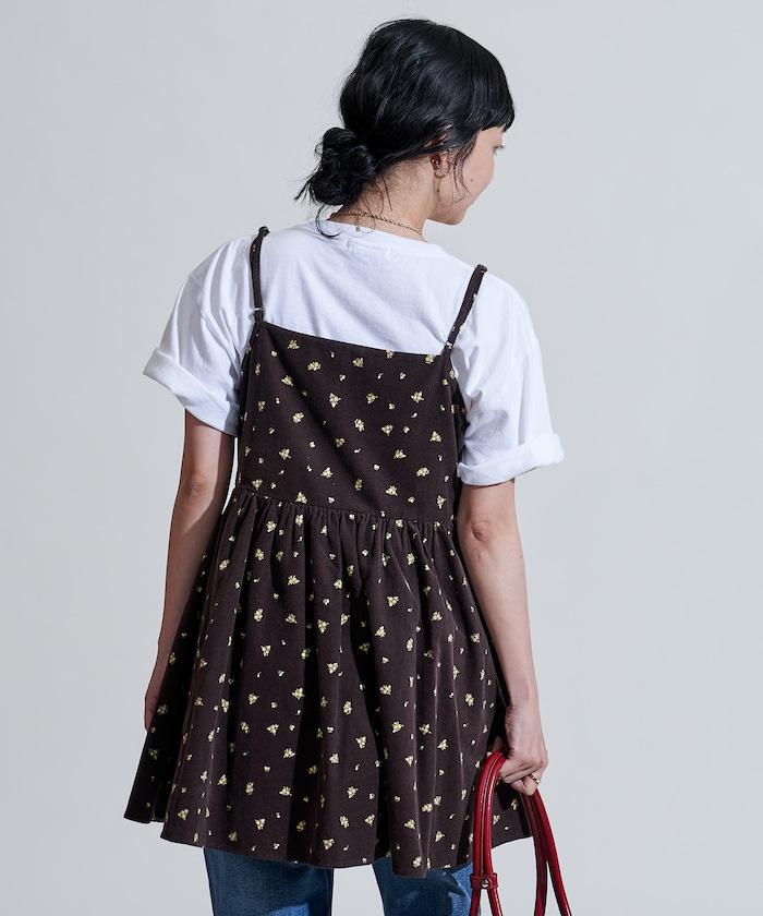 吊帶背心外衣,在休閒燈芯絨中加入甜美的小碎花圖案。