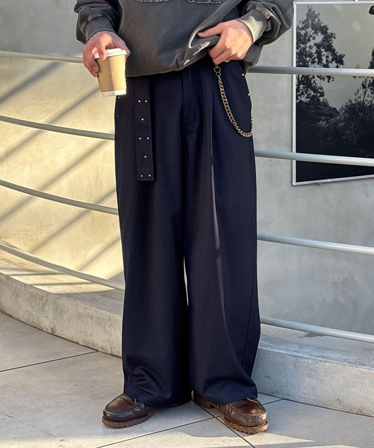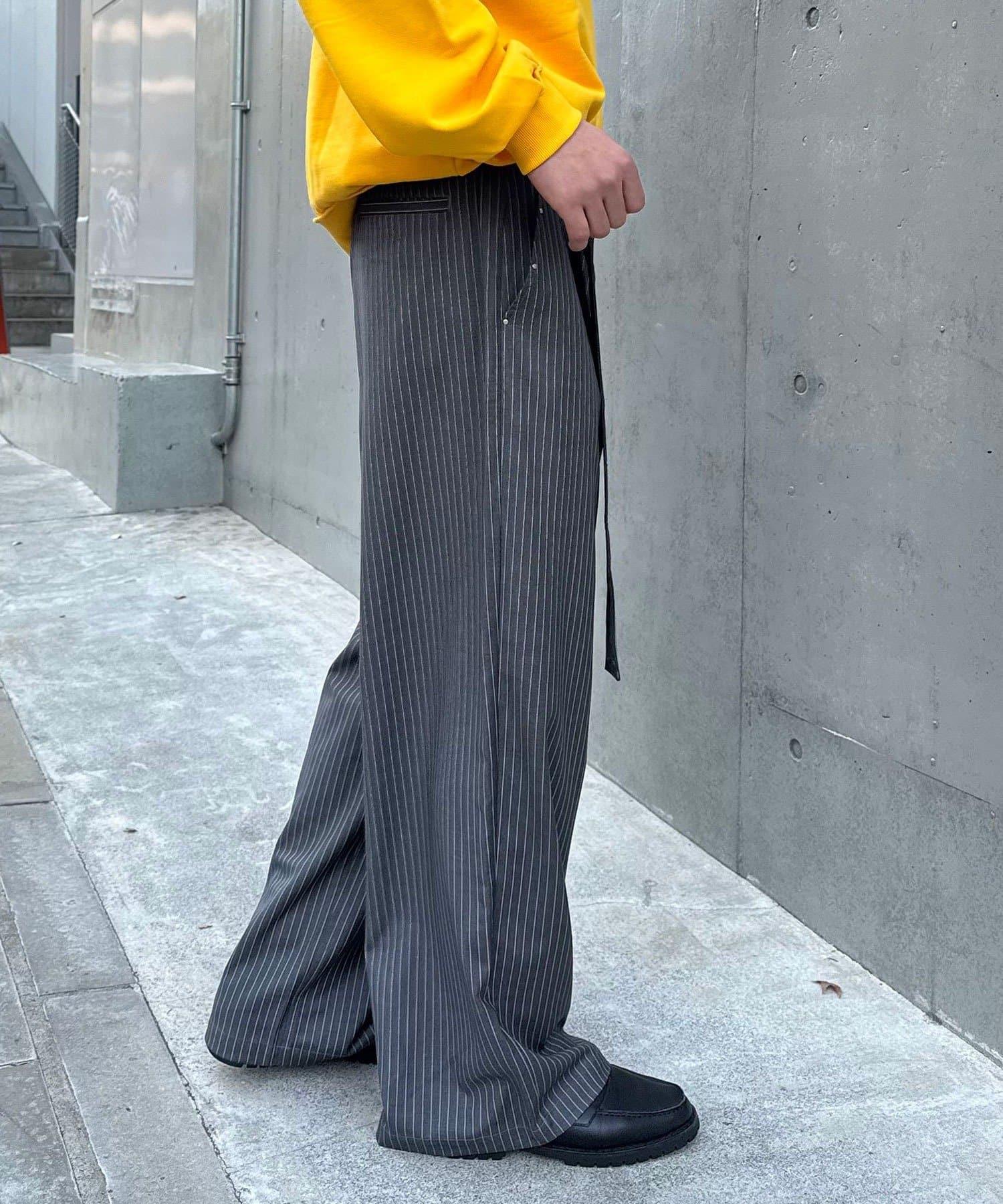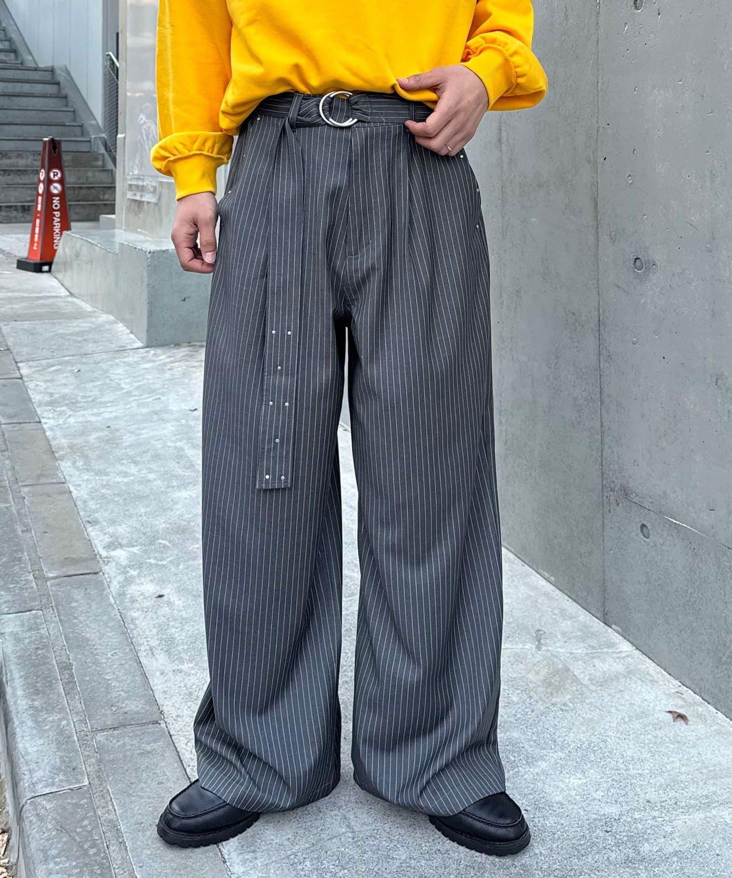 配腰帶細條紋裝飾寬鬆西裝褲