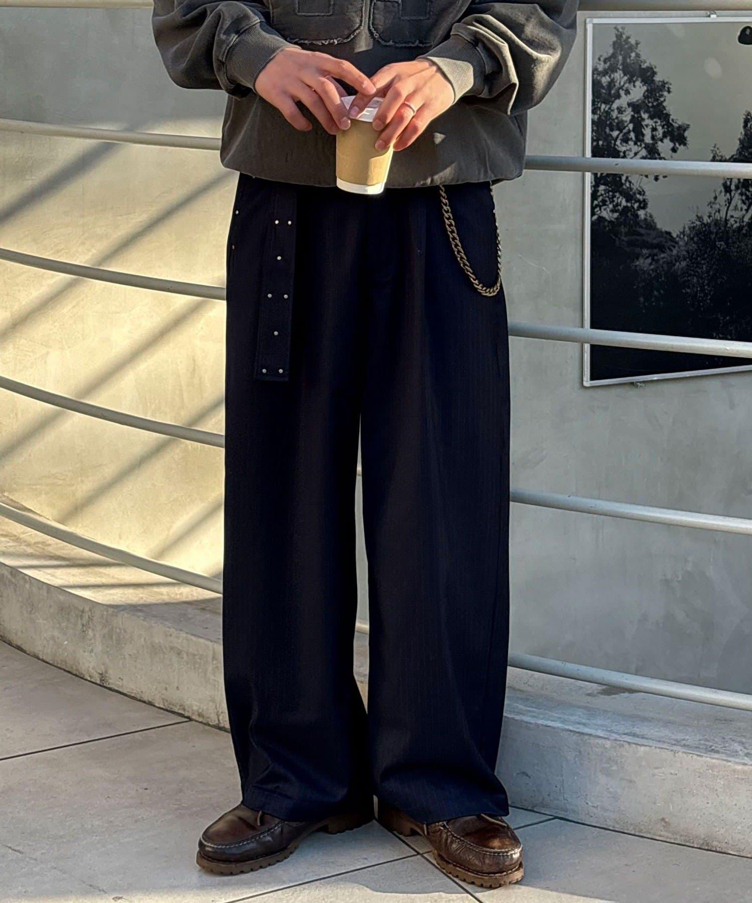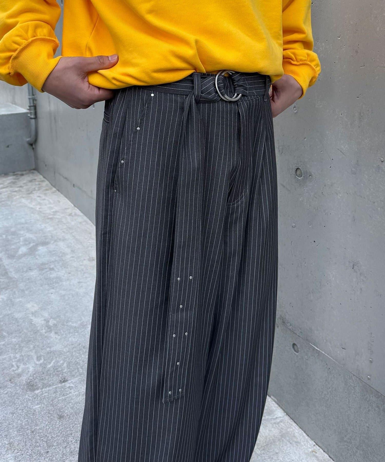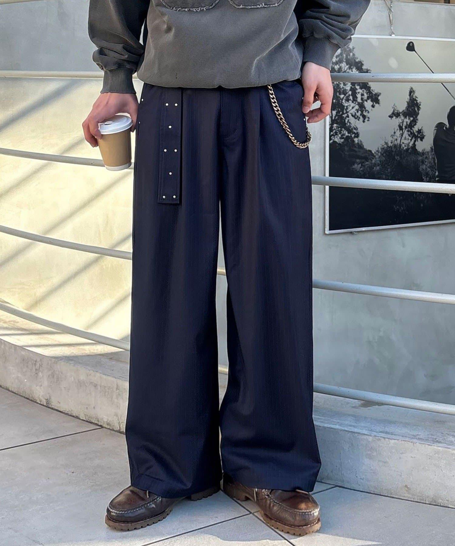 配腰帶細條紋裝飾寬鬆西裝褲
