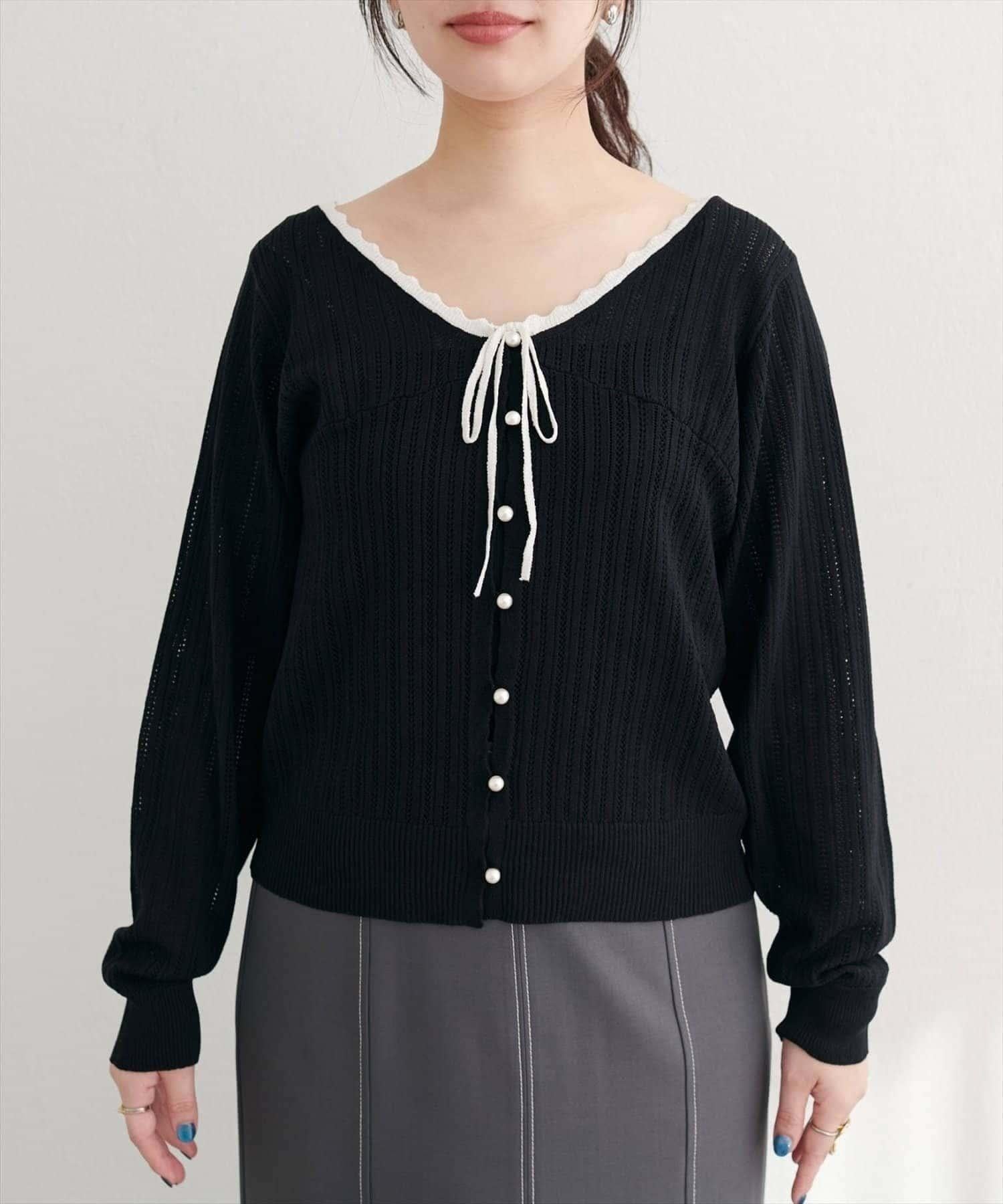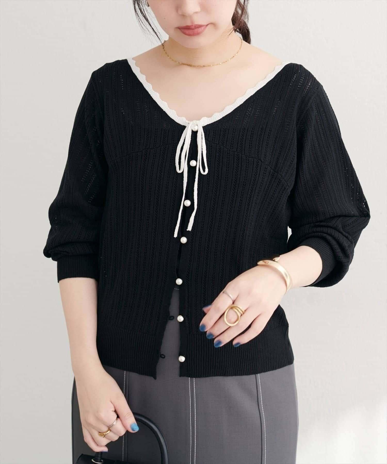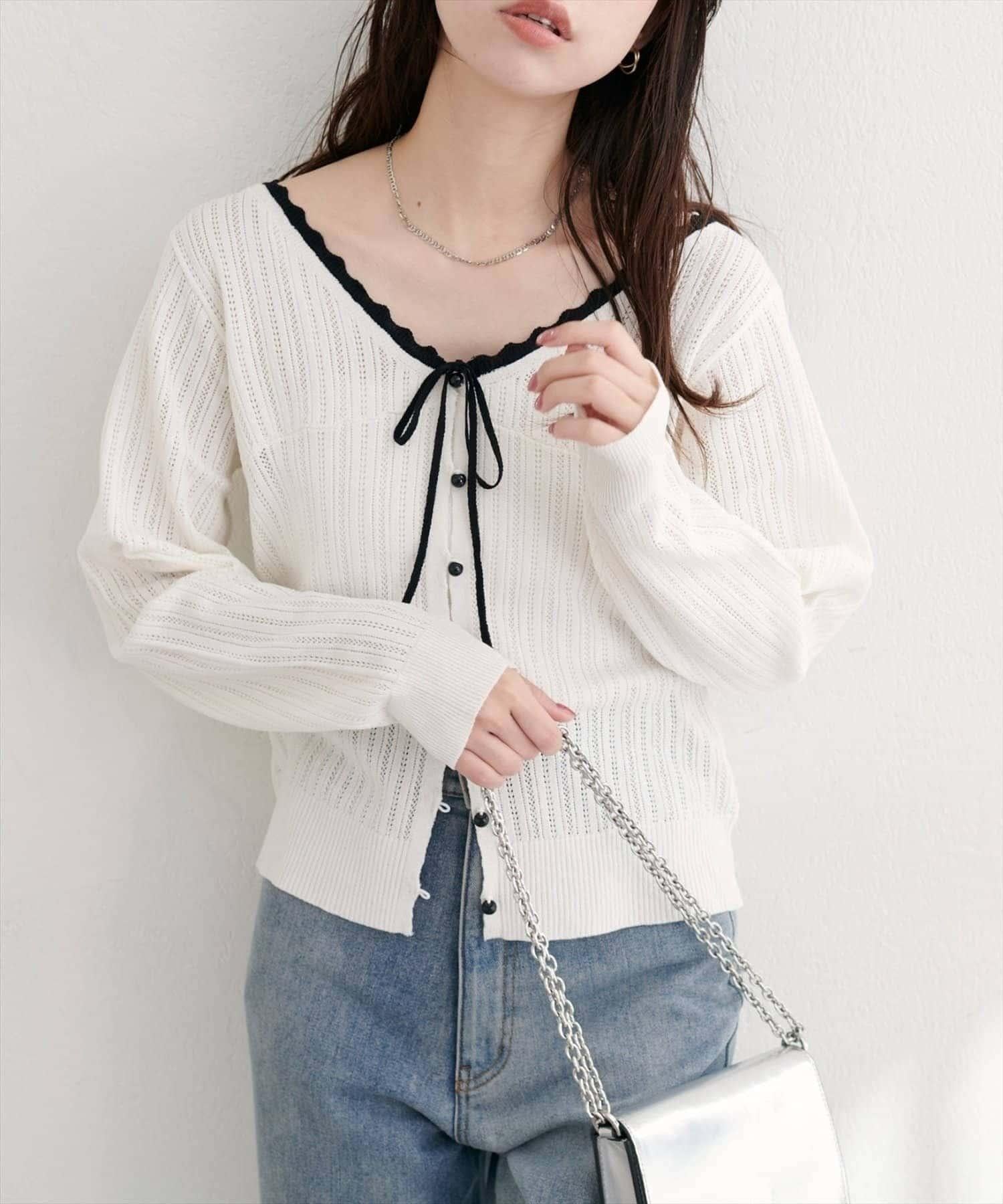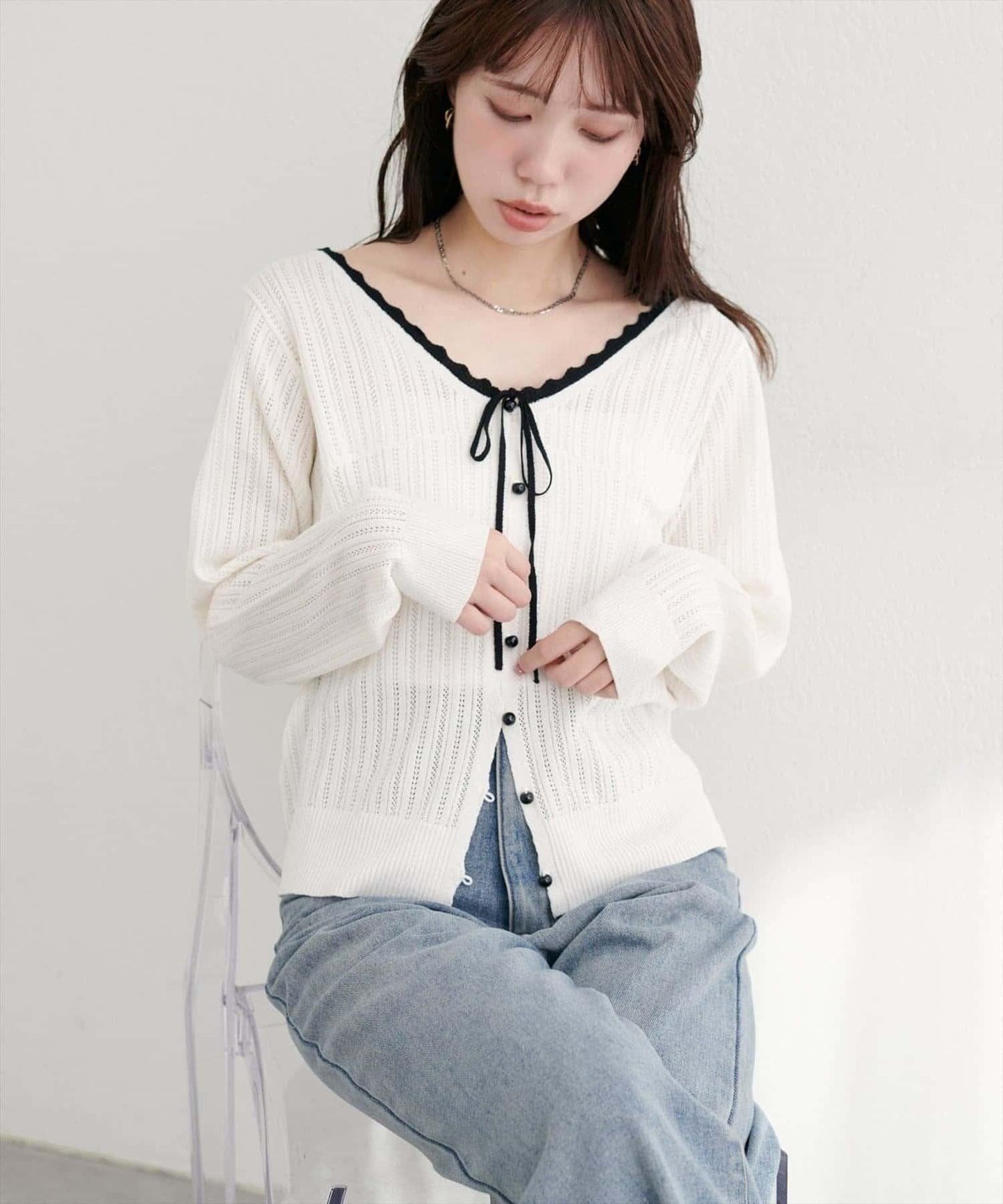 胸前飾有緞帶和蕾絲邊的開襟羊毛衫,更顯成人的可愛。