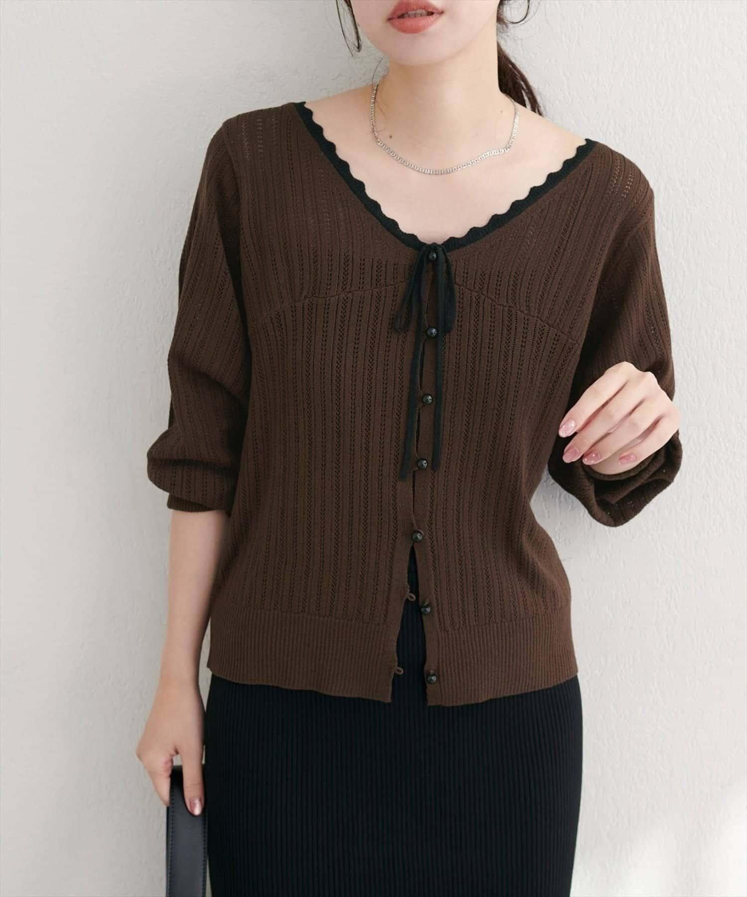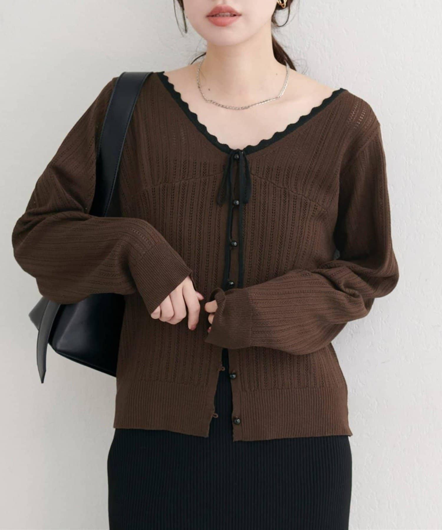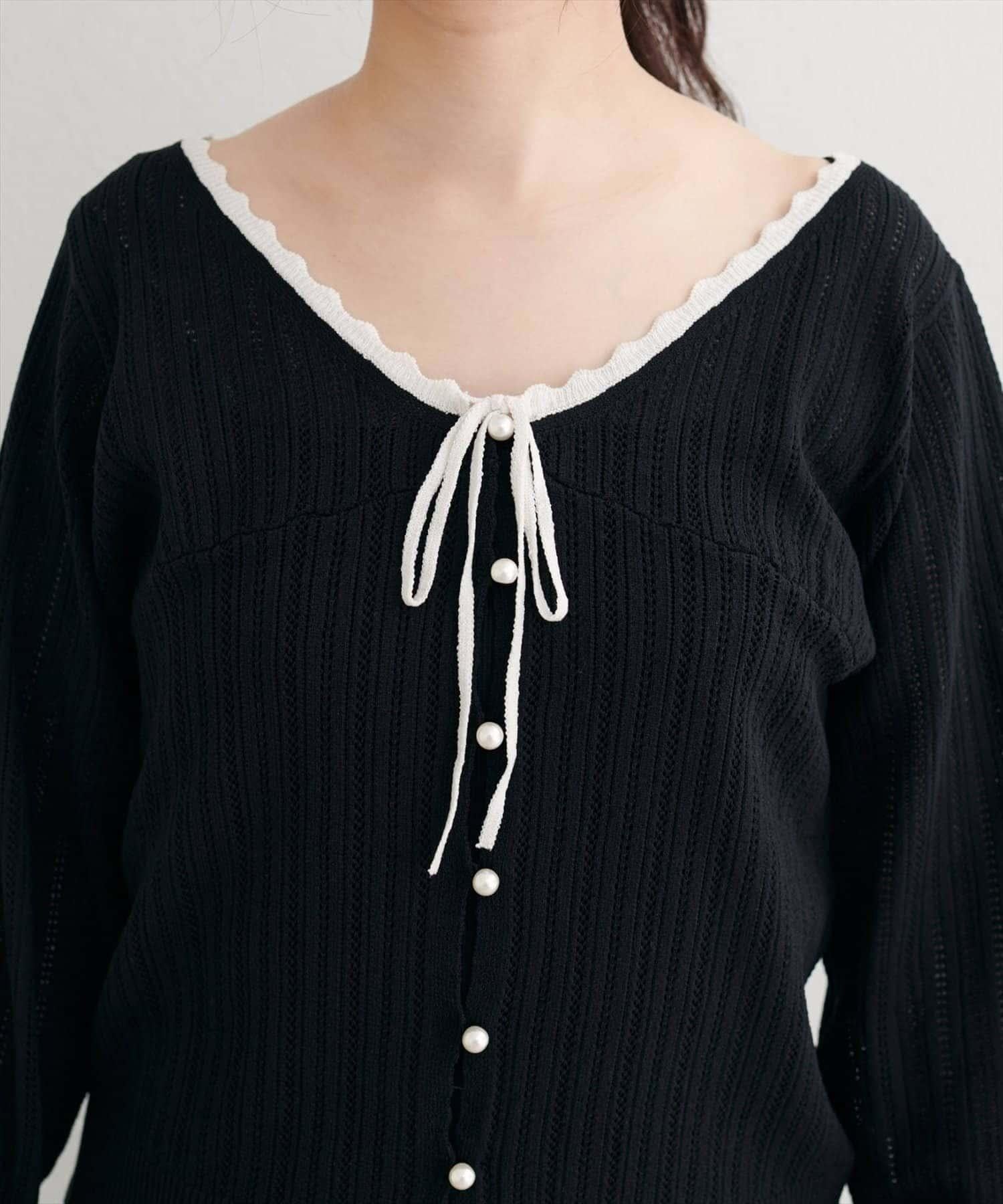 胸前飾有緞帶和蕾絲邊的開襟羊毛衫,更顯成人的可愛。
