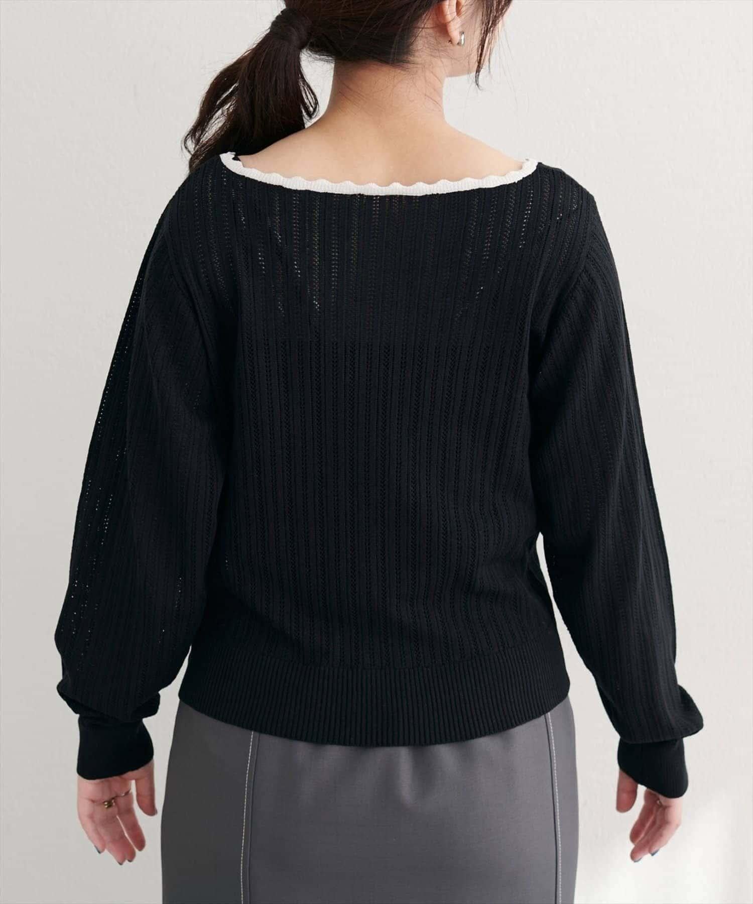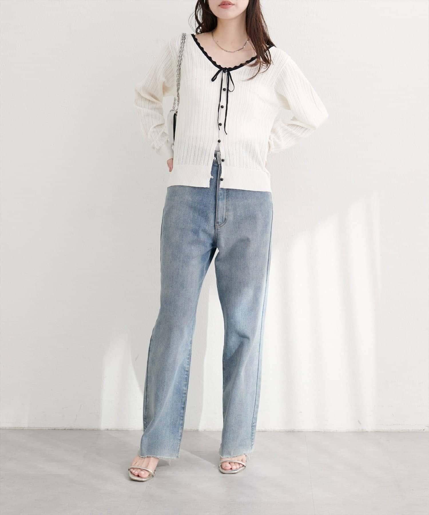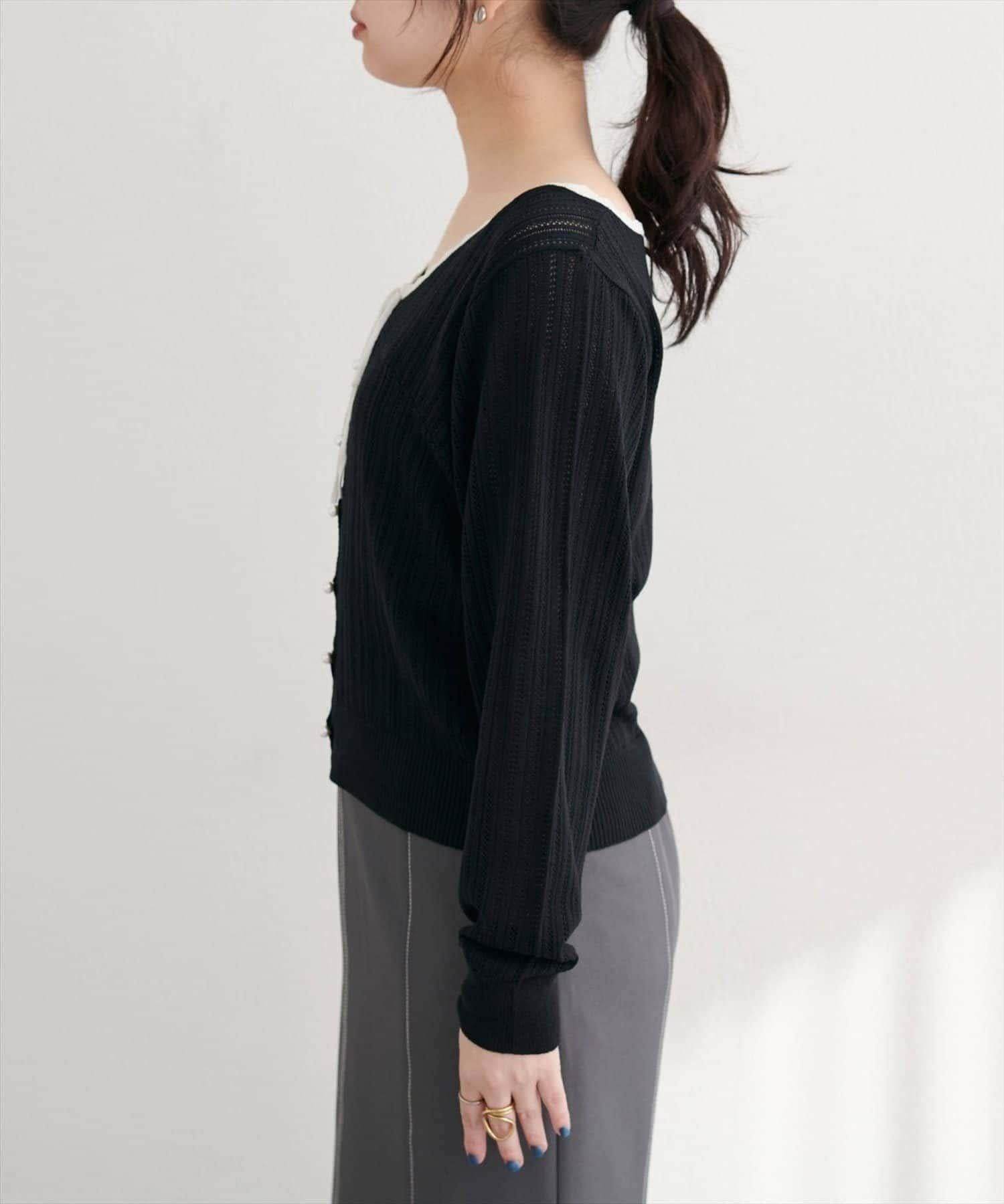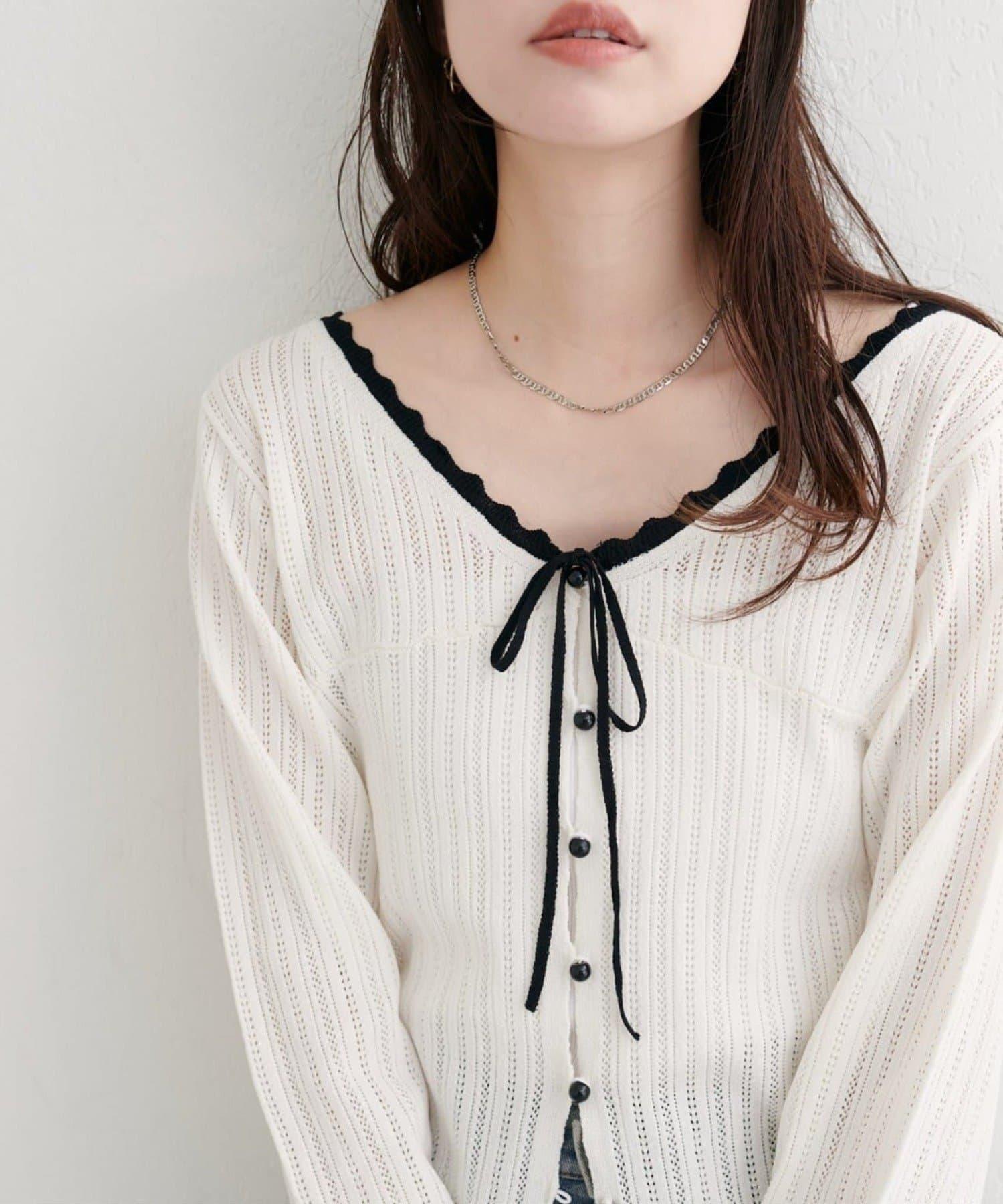 胸前飾有緞帶和蕾絲邊的開襟羊毛衫,更顯成人的可愛。
