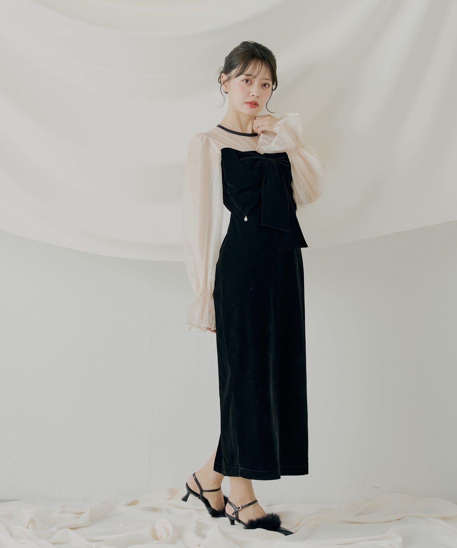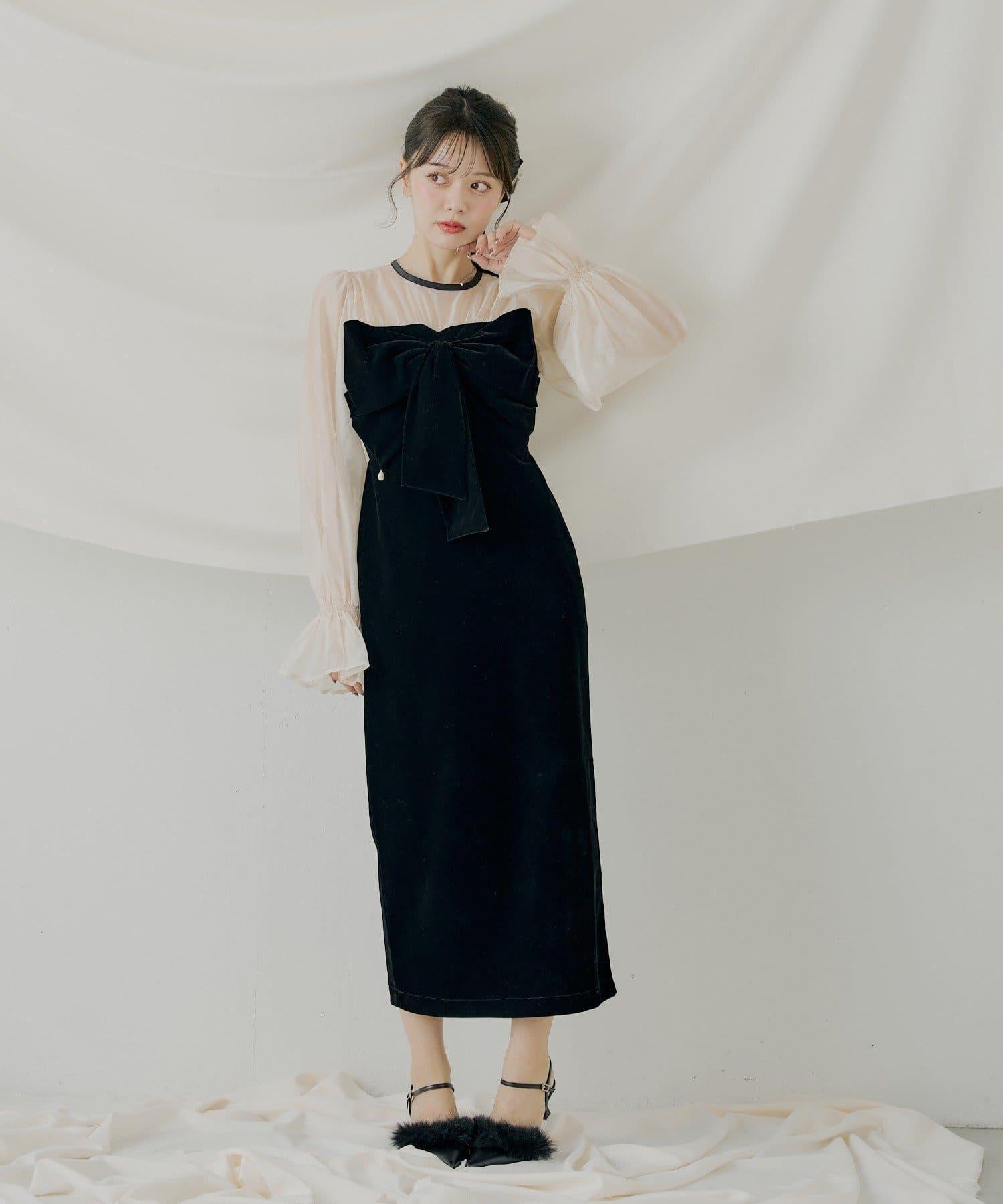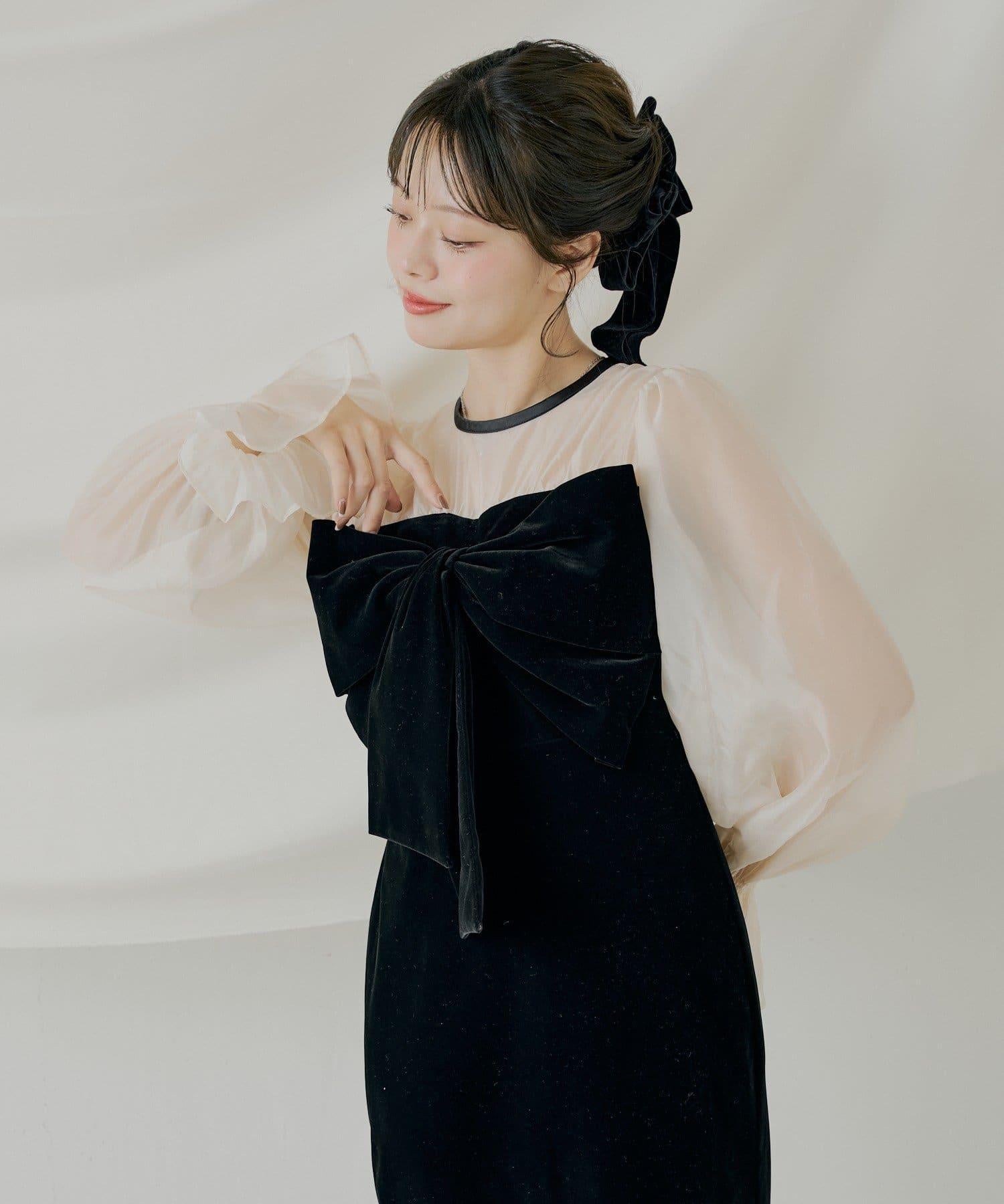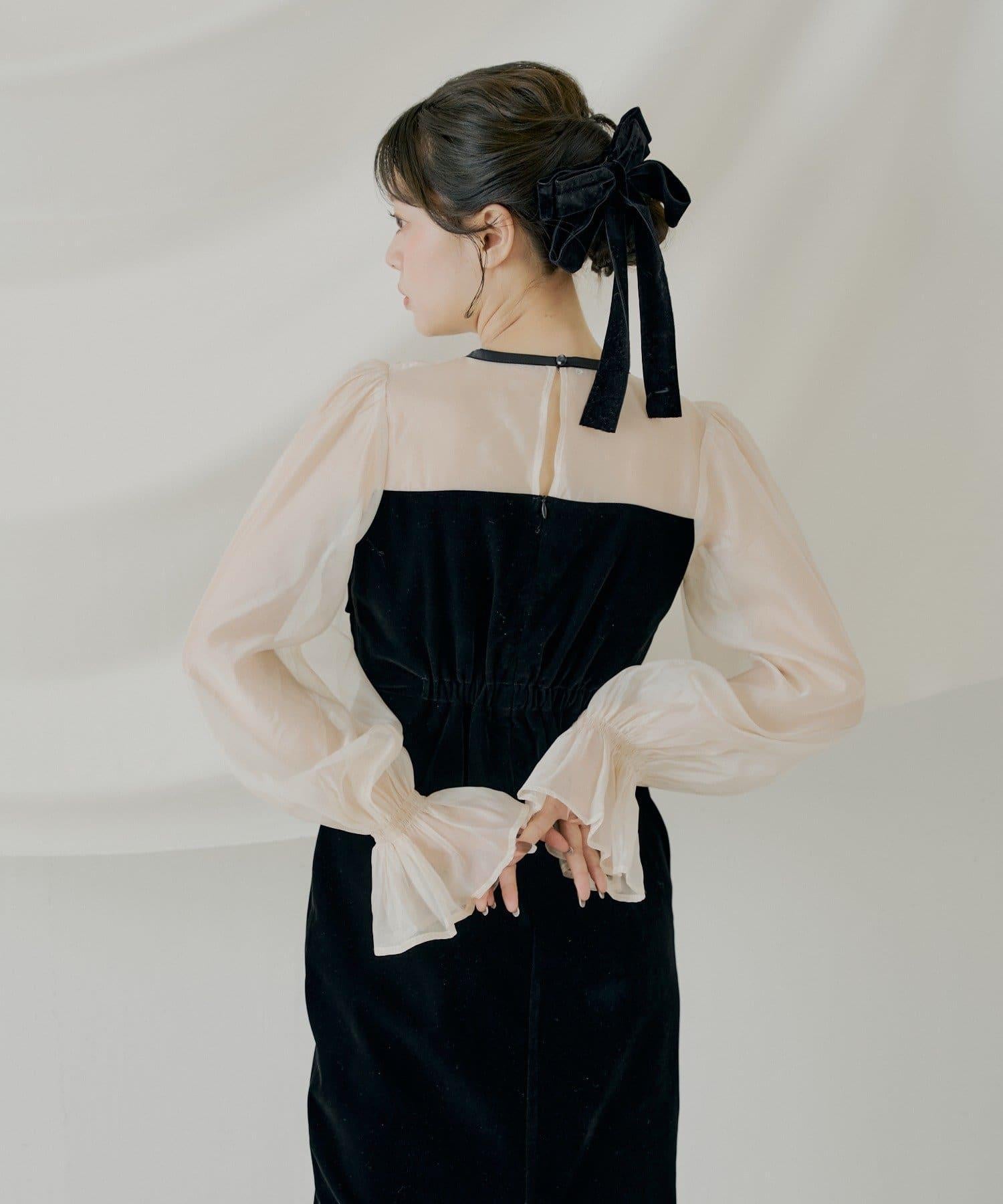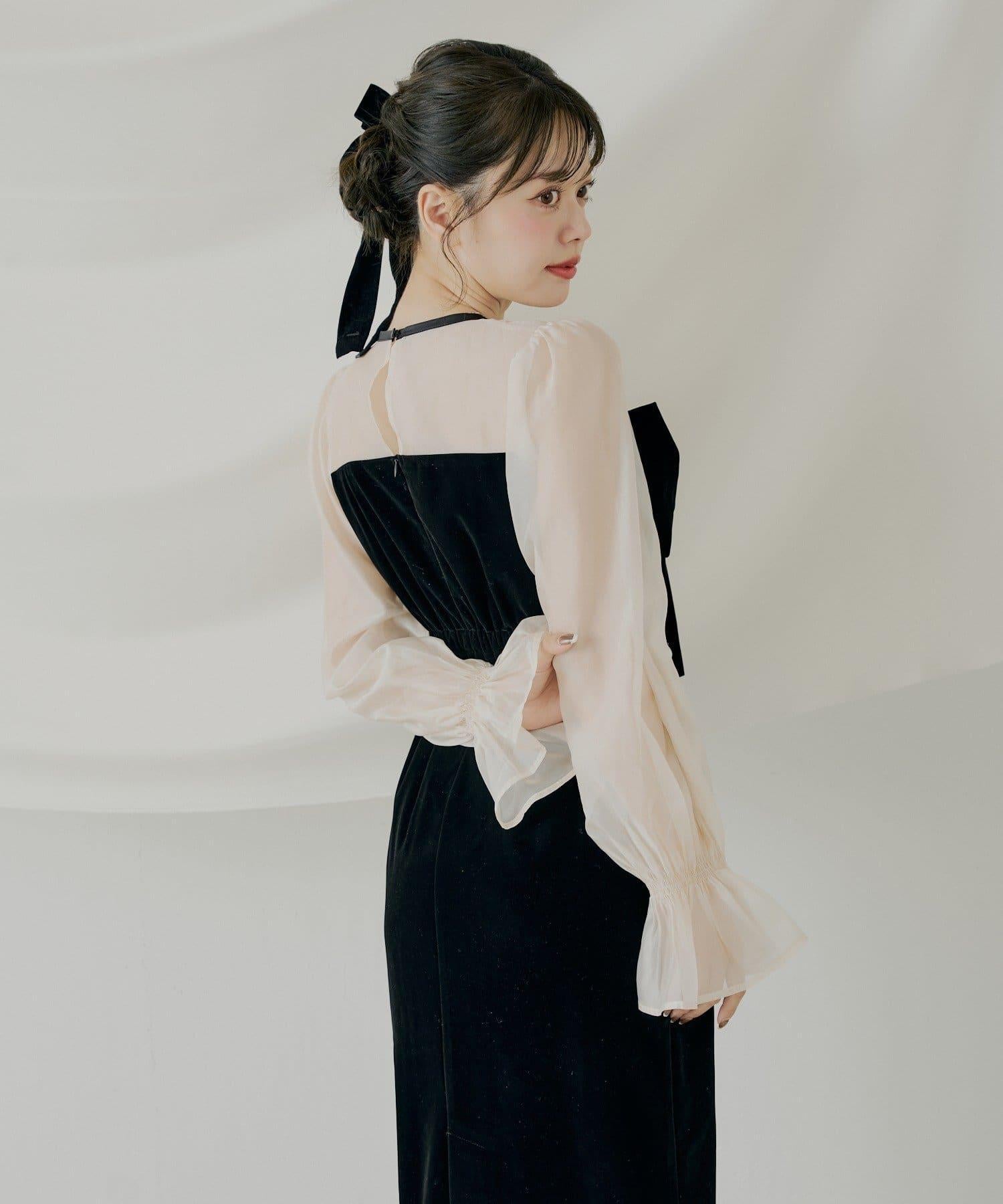 配色透視蝴蝶結天鵝絨連衣裙【SALON by Chico】