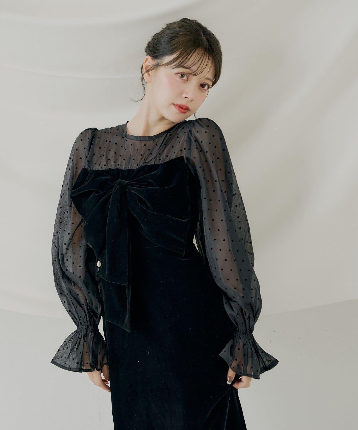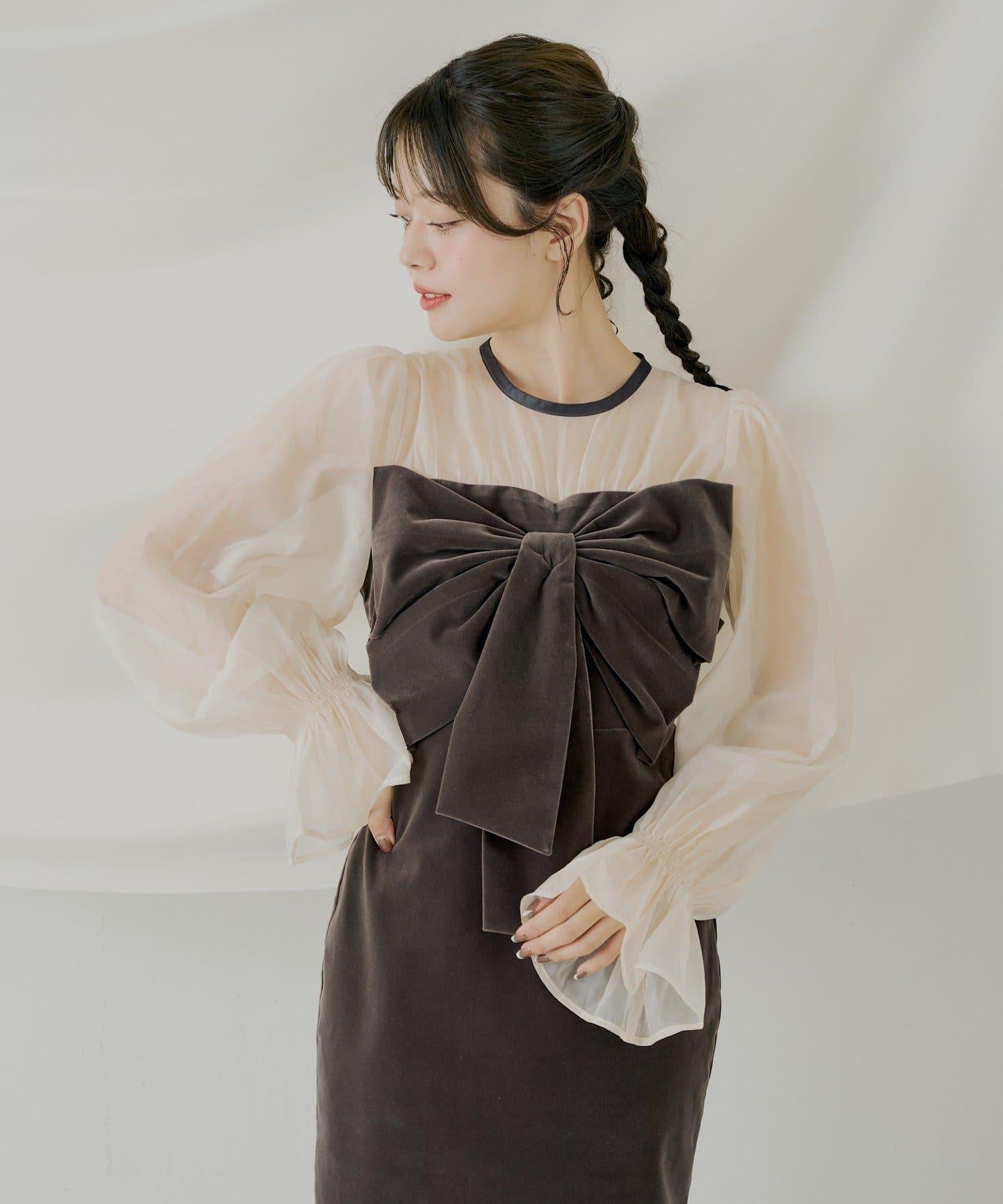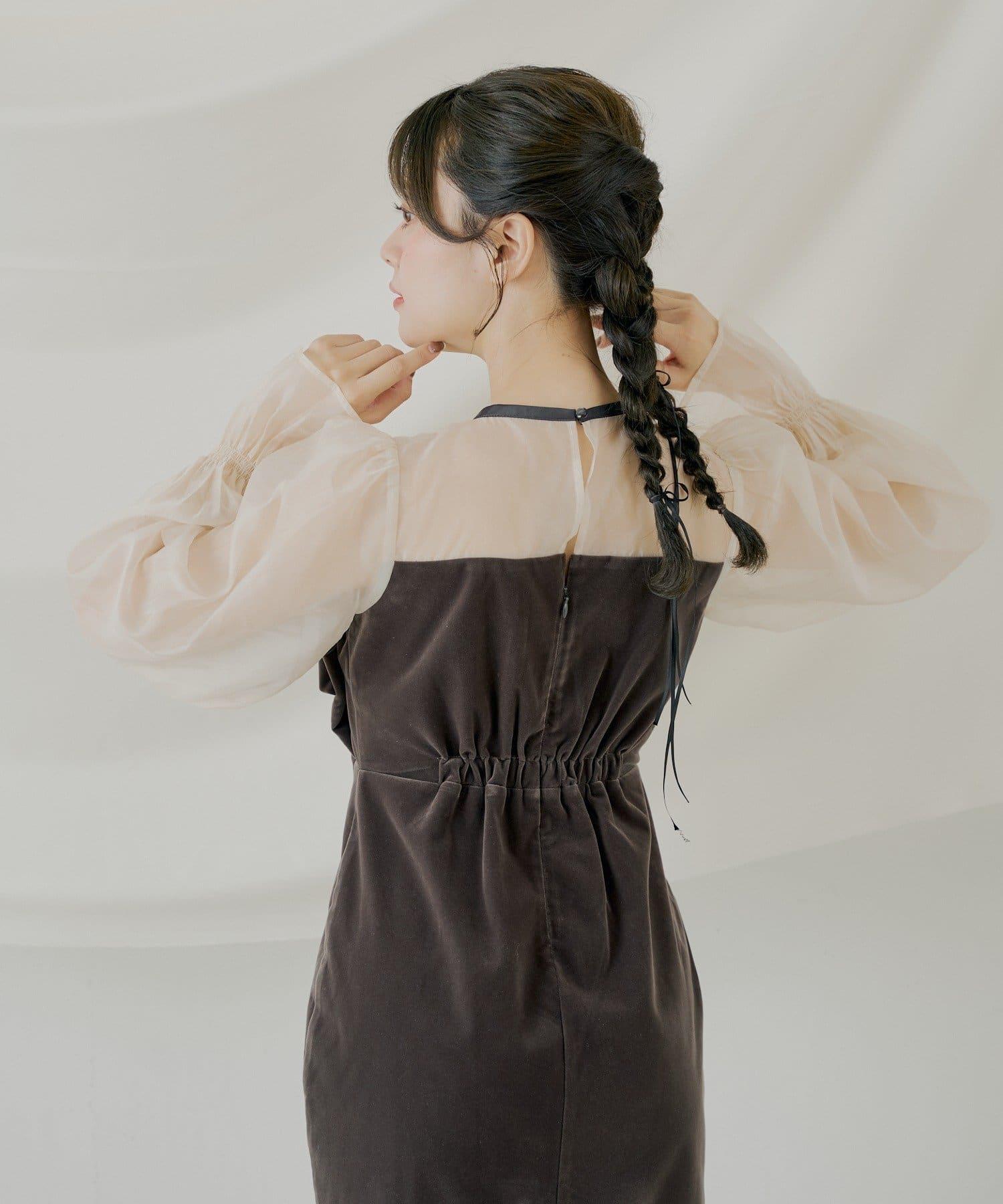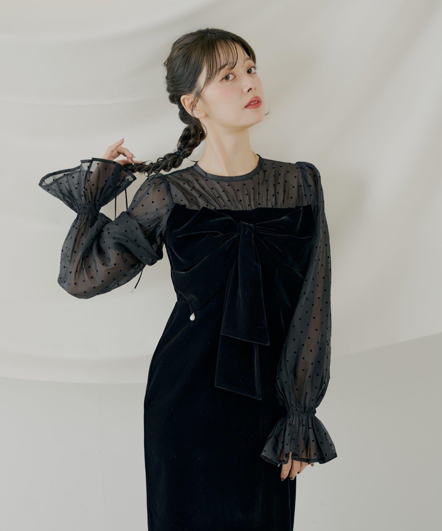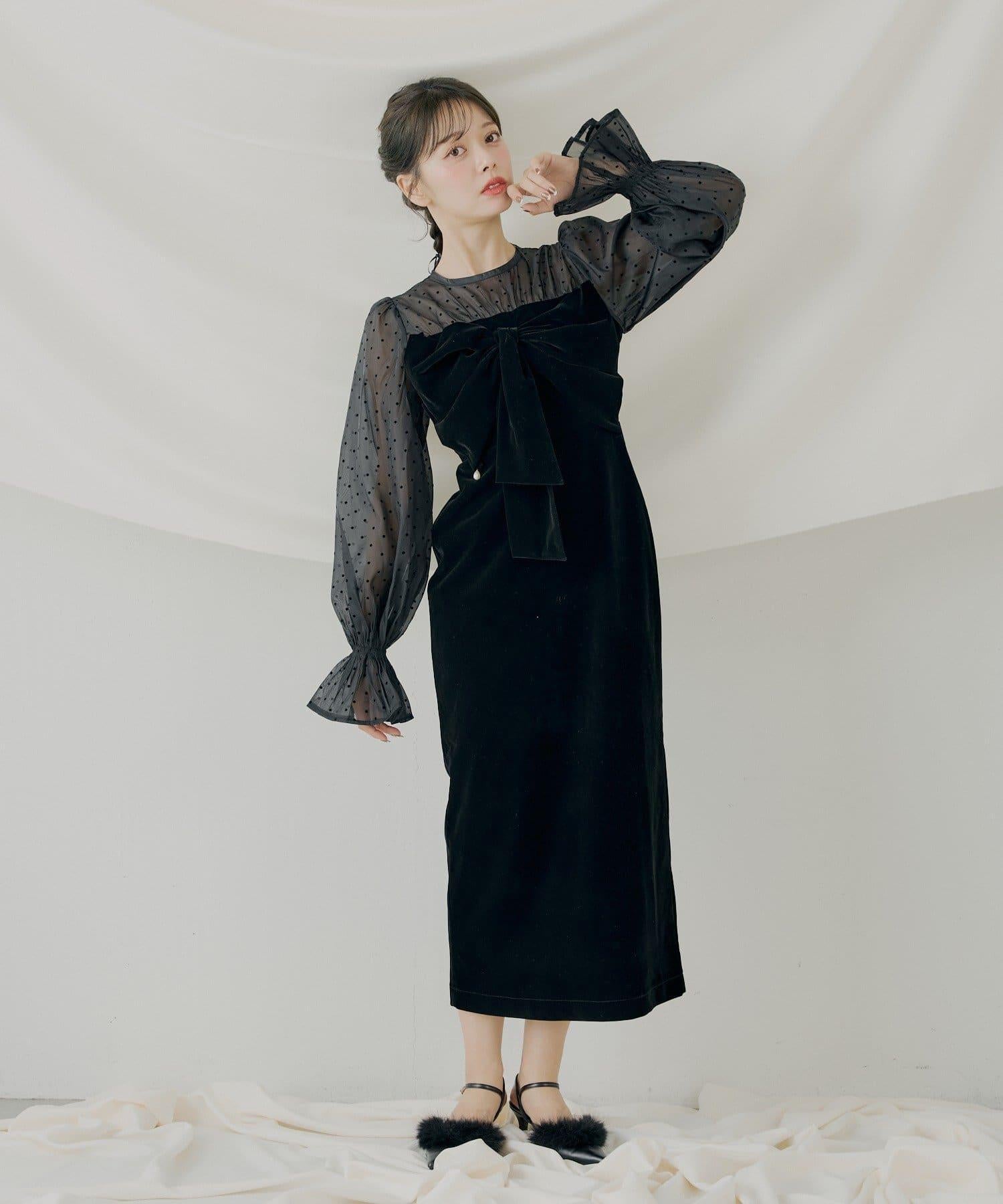 配色透視蝴蝶結天鵝絨連衣裙【SALON by Chico】