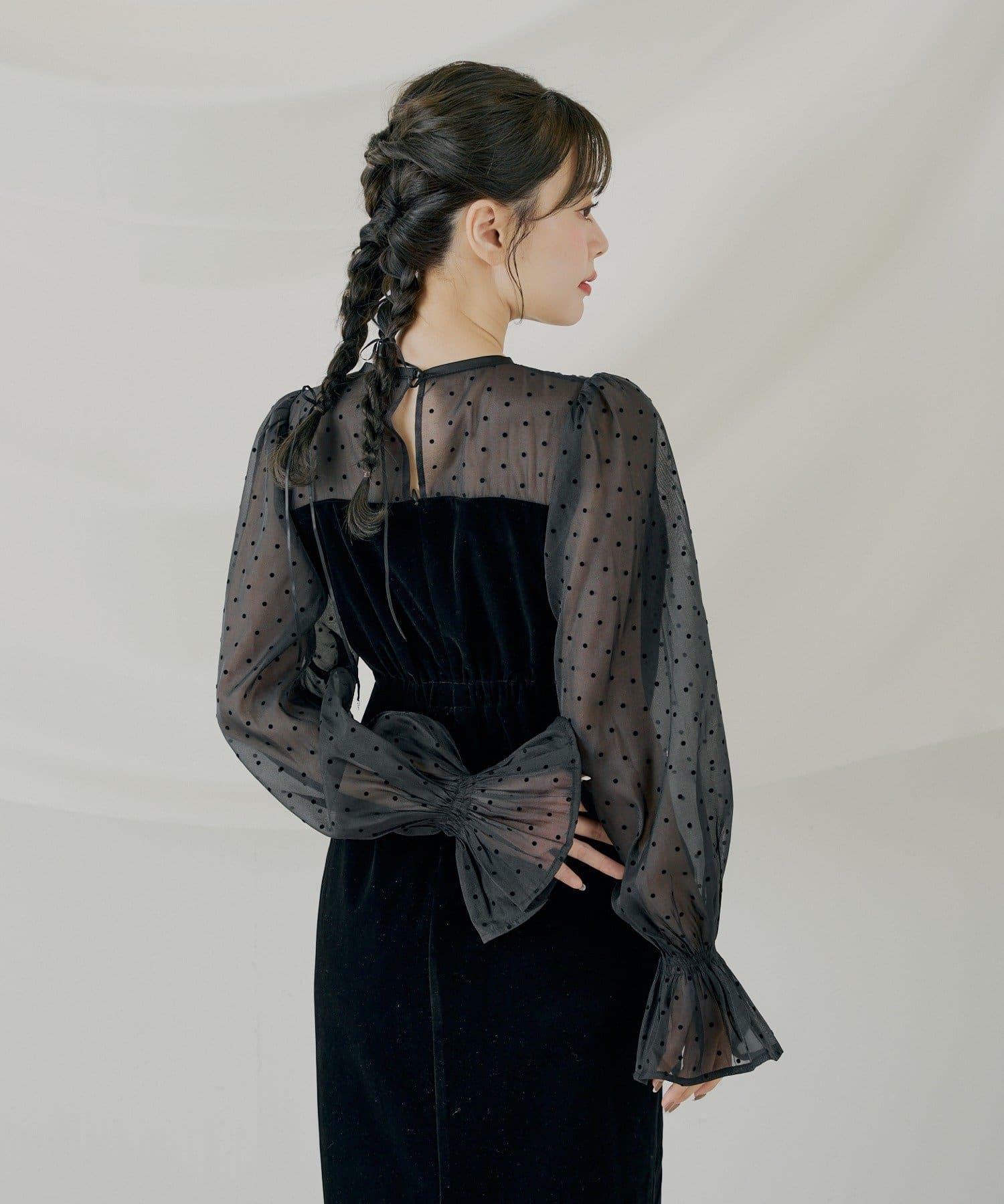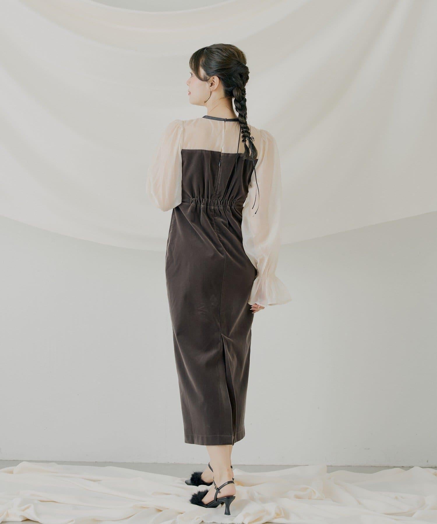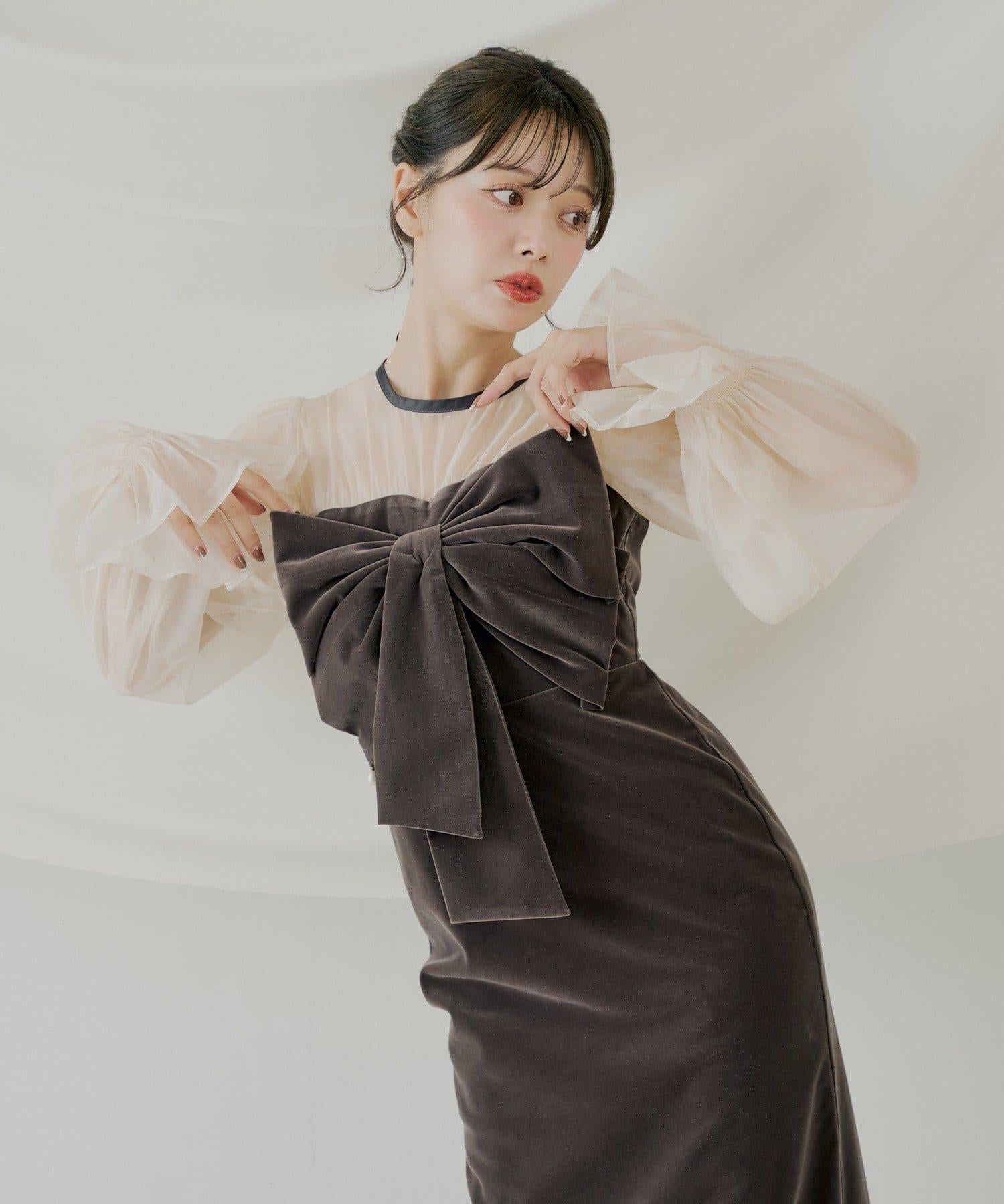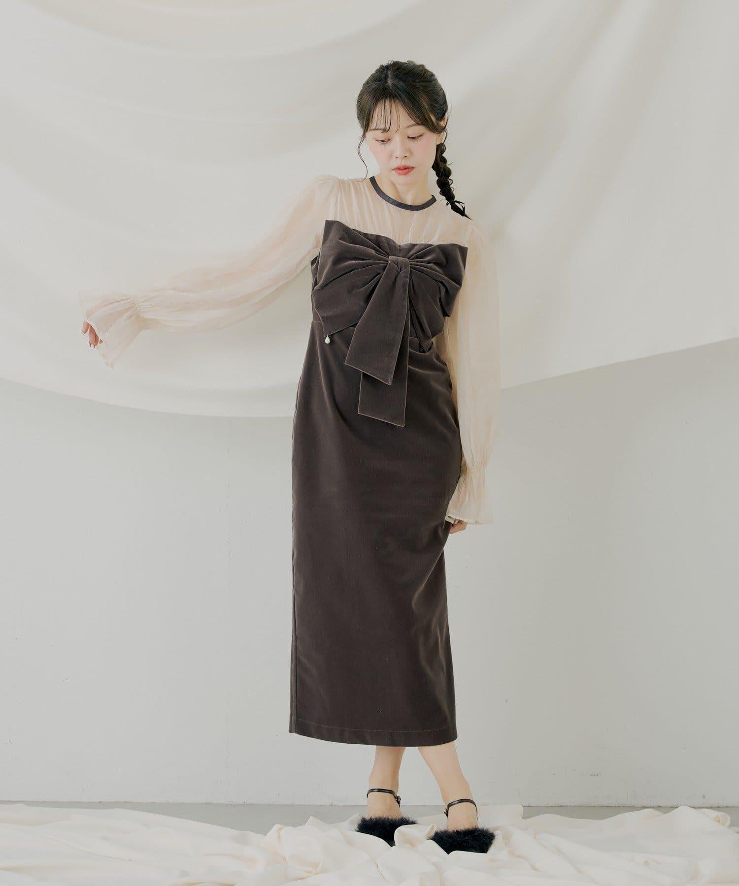 配色透視蝴蝶結天鵝絨連衣裙【SALON by Chico】