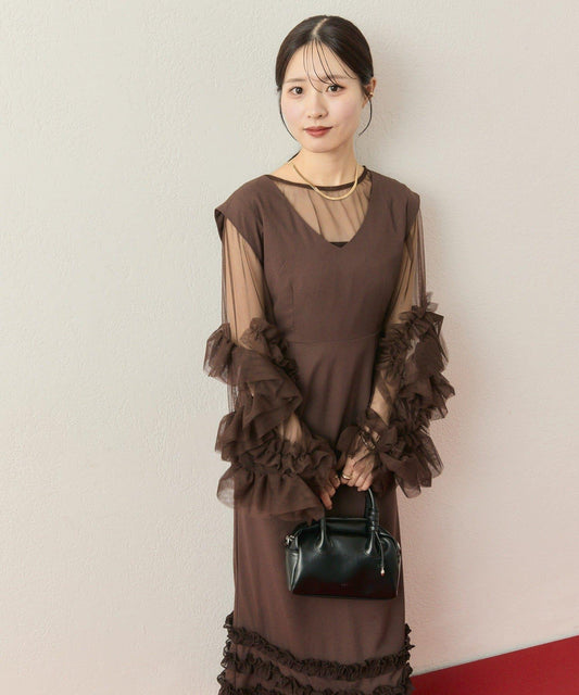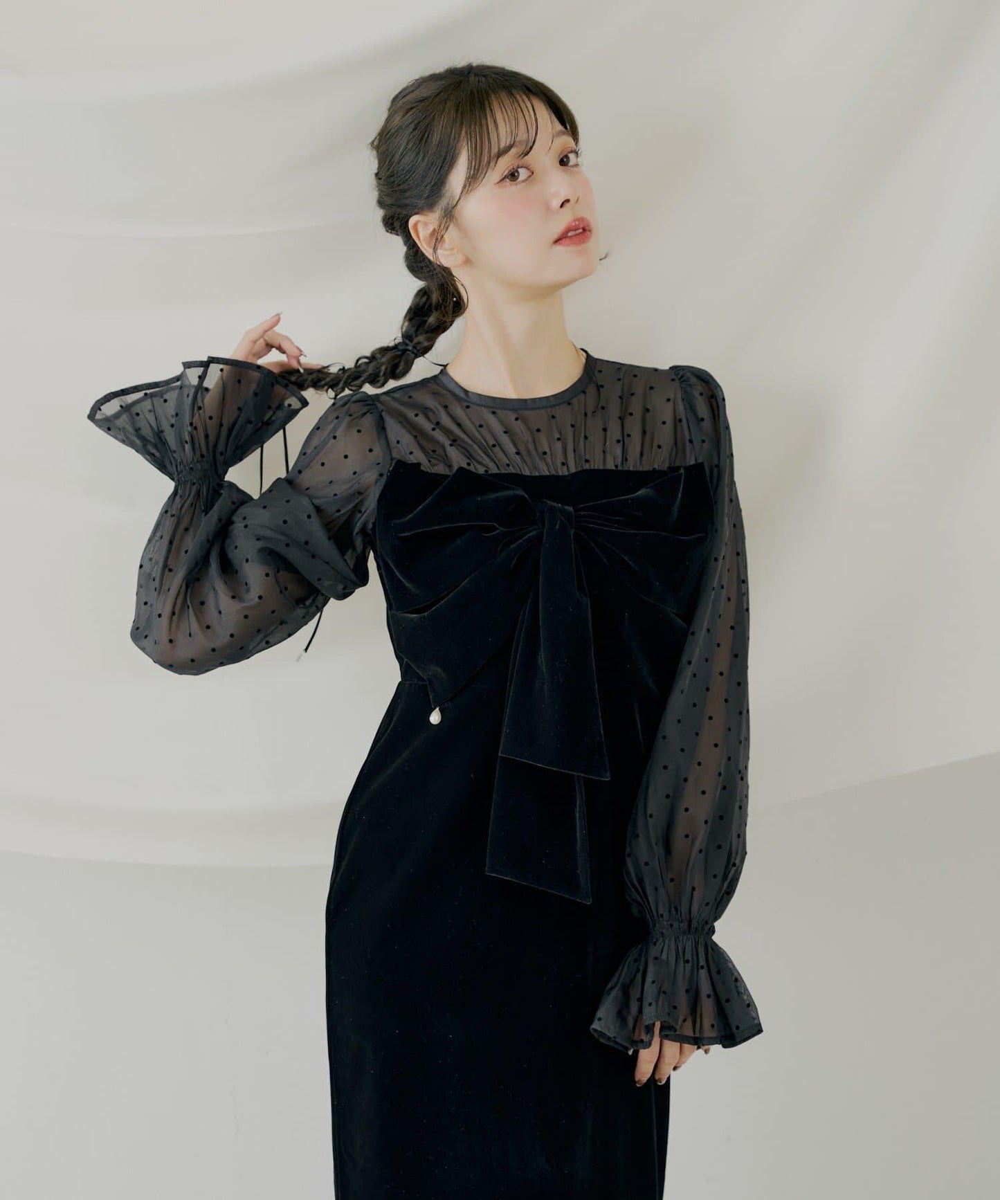 透視袖子由絲絨製成,具有光澤感,給人一種優雅奢華的感覺。