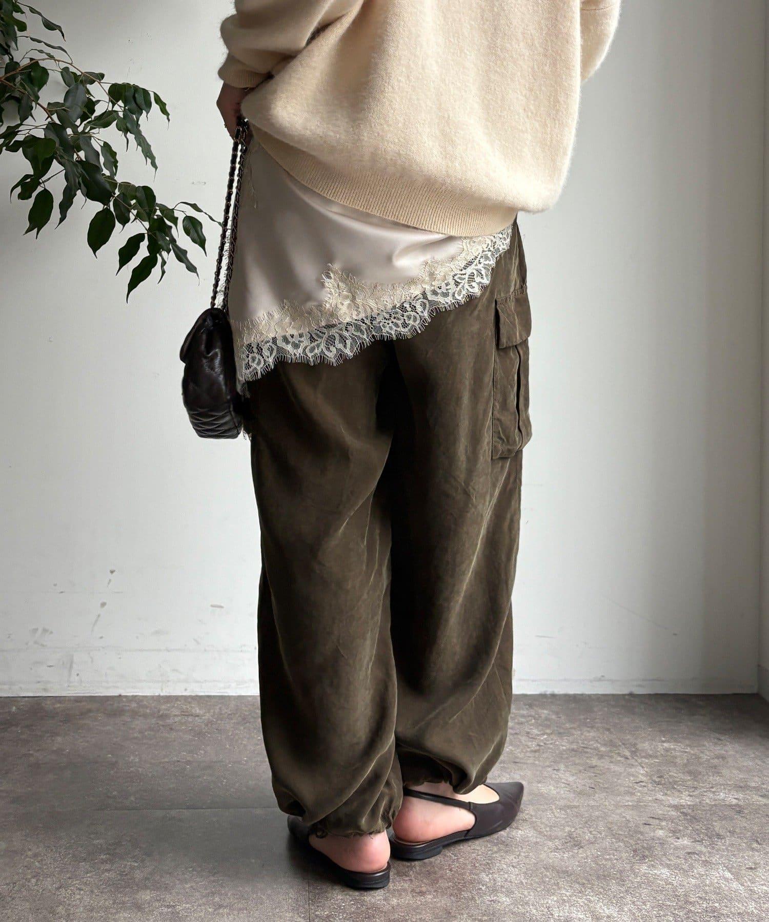 腰部背面有鬆緊帶,方便使用。下襬處的抽繩讓您可以通過收緊繩索來享受輪廓的變化。