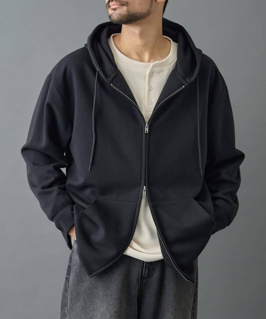 這是我們之前發佈的重量級拉鍊連帽衫的升級版。保留了保暖襯裡,但袋鼠口袋改為側袋,設計更加簡潔。有一些連帽衫的面料和保暖襯裡都比較厚實,但在日本的氣候條件下穿起來往往很不舒服,因此這種面料的連帽衫穿起來會很舒適。在隆冬季節,它還可以作為大衣的內層。(A.H)