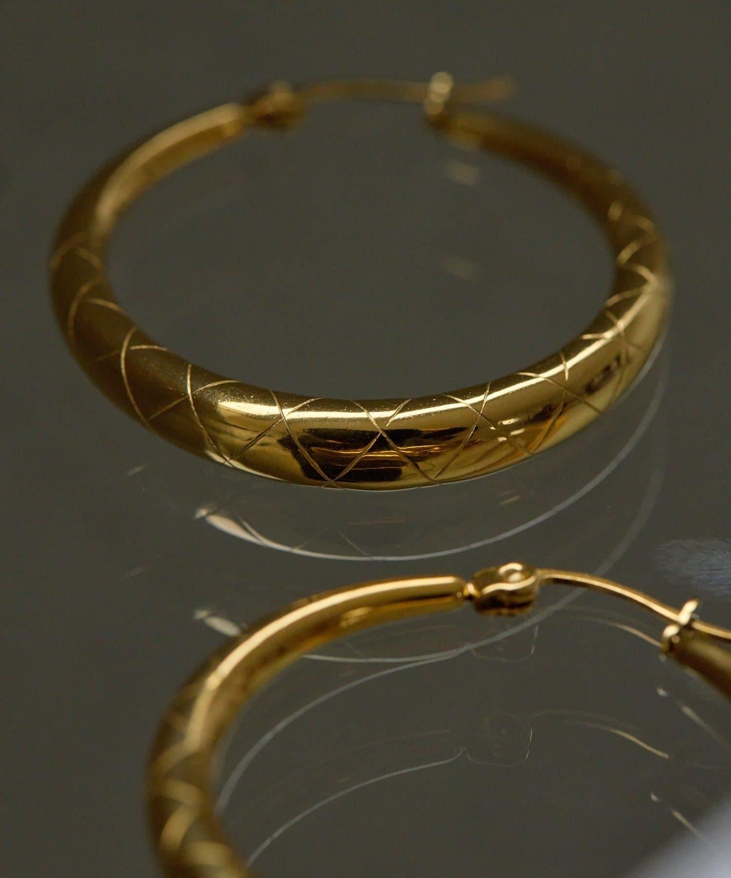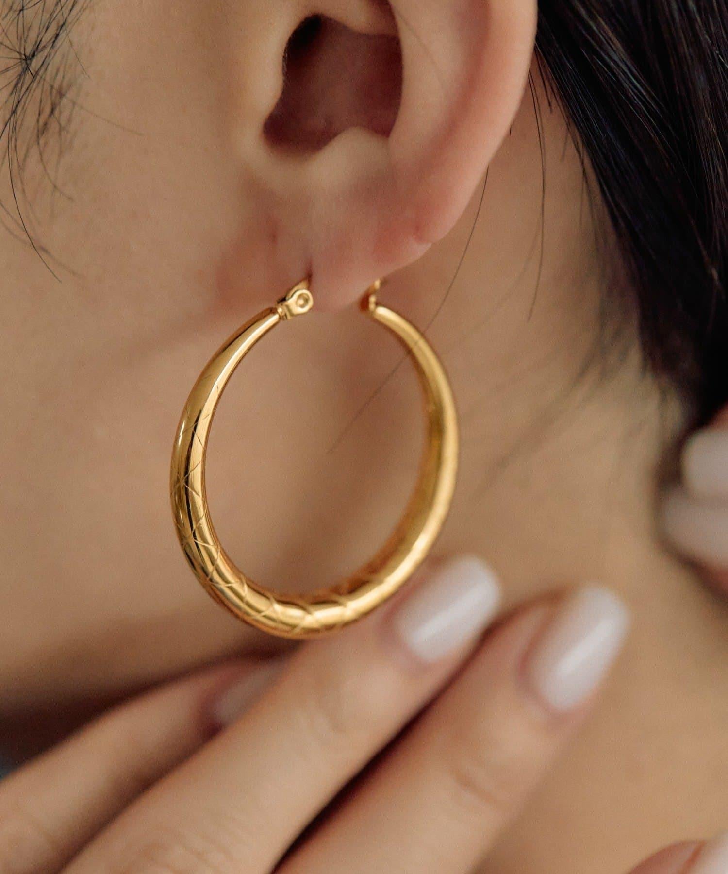 環形耳環上有細微的絎縫圖案。