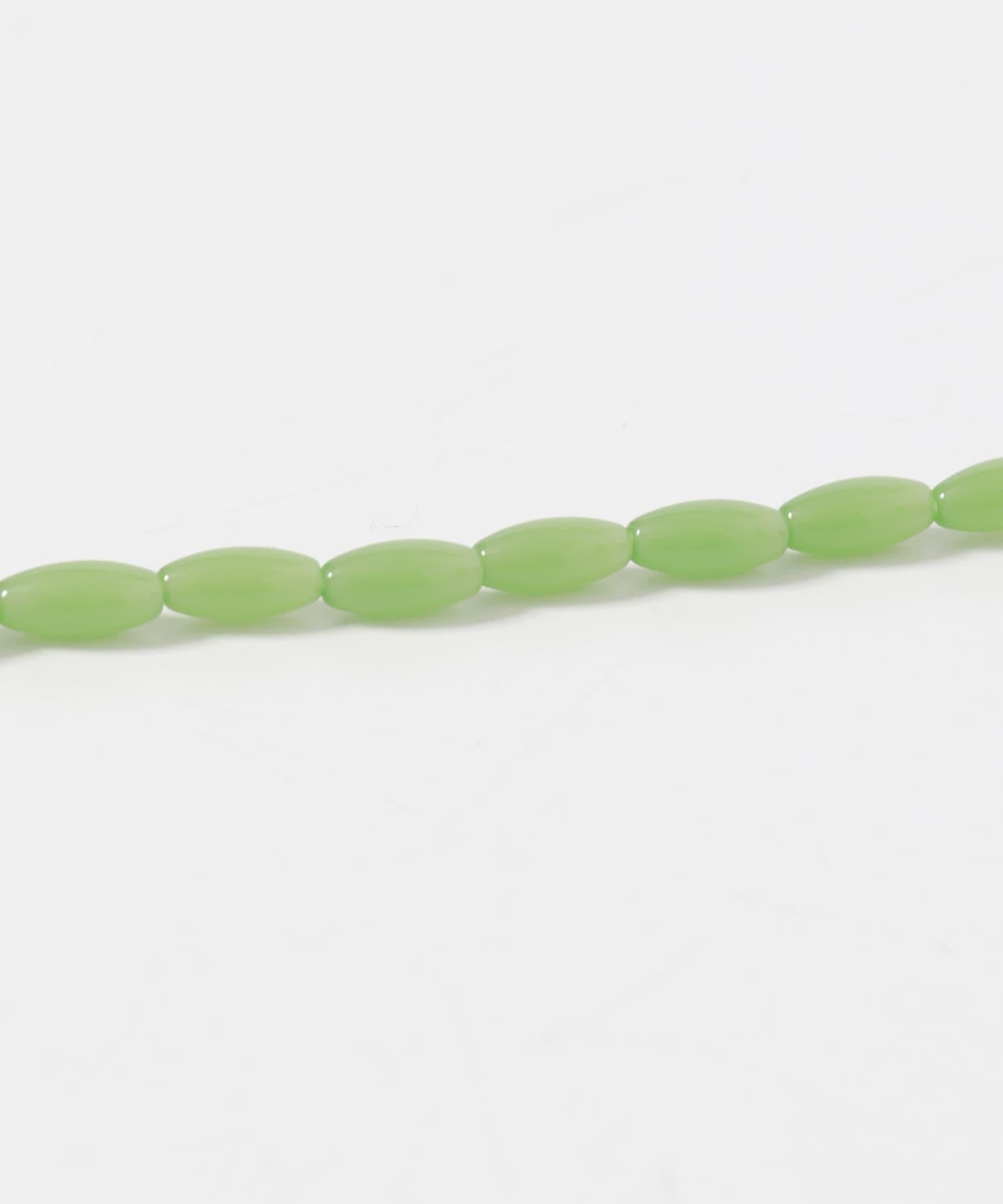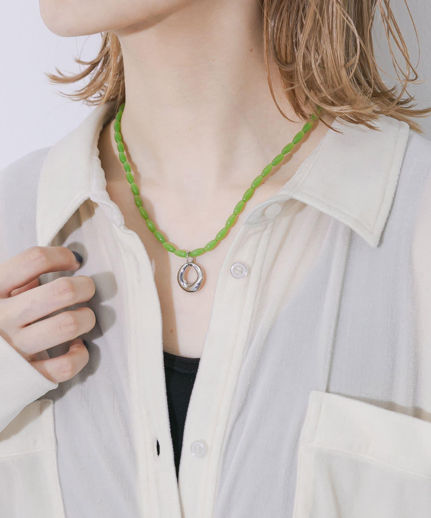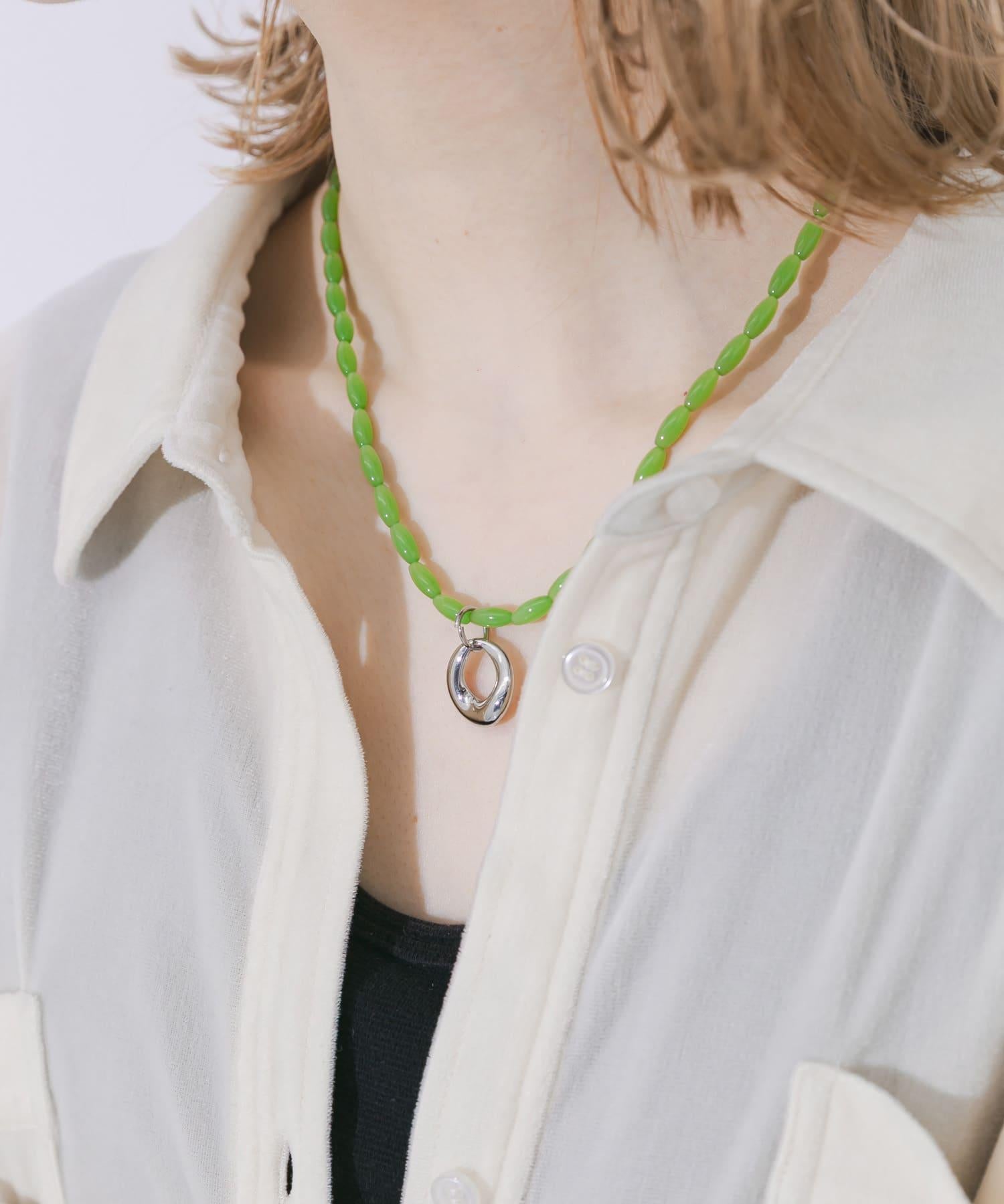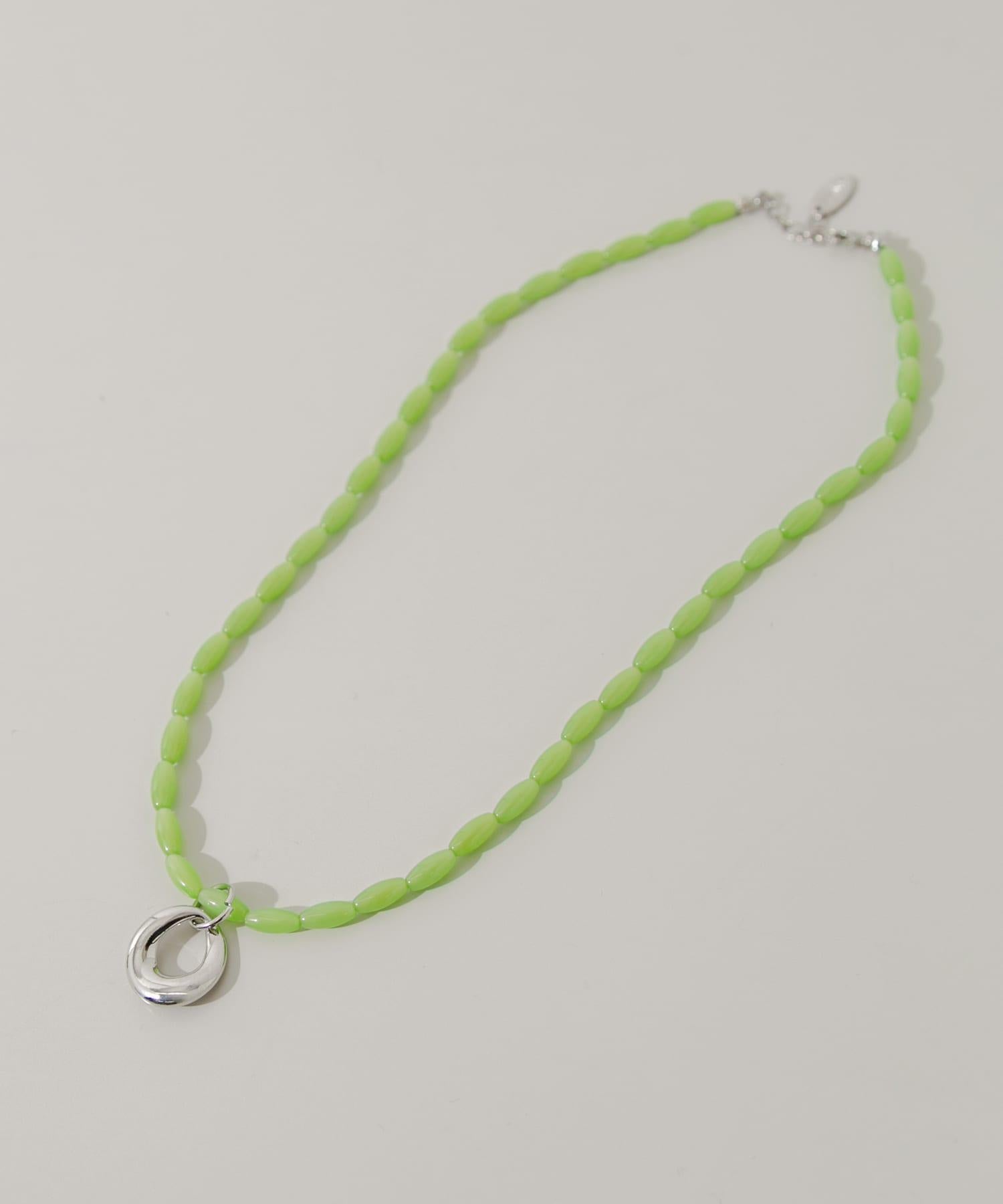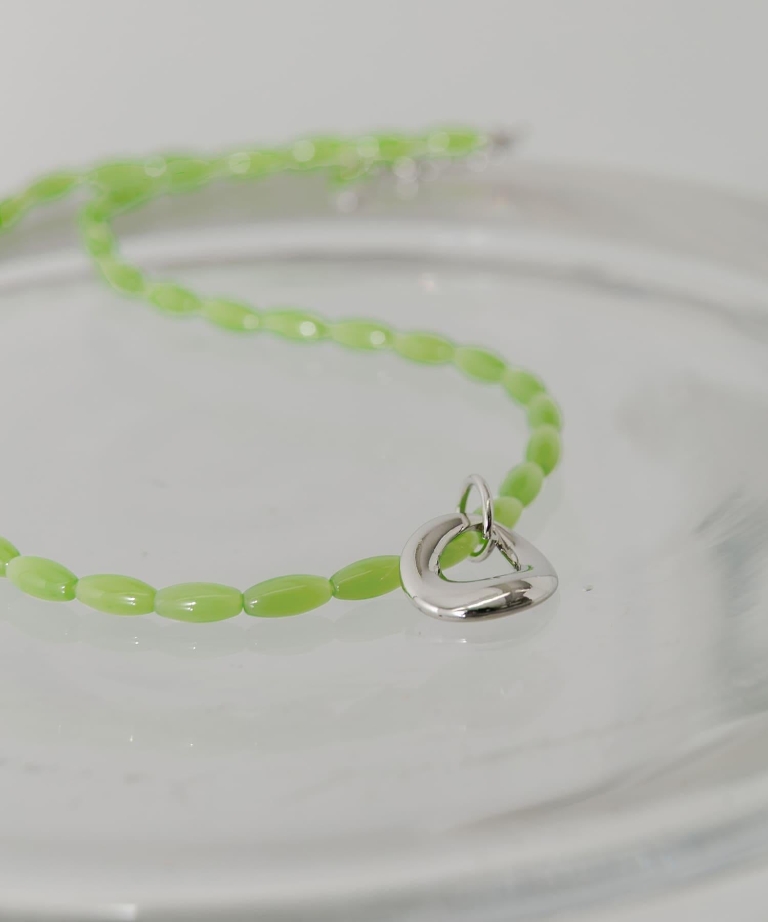 這條項鍊將醒目的亮綠色珠子與銀色吊飾結合在一起。