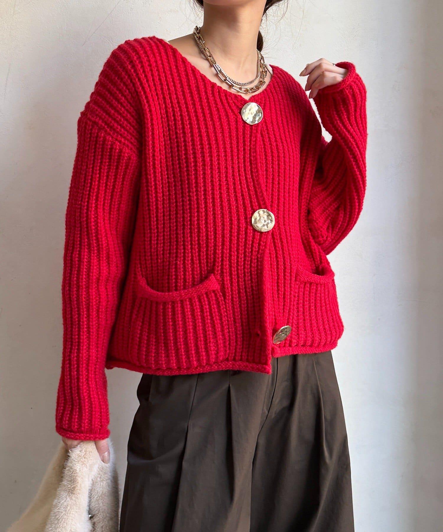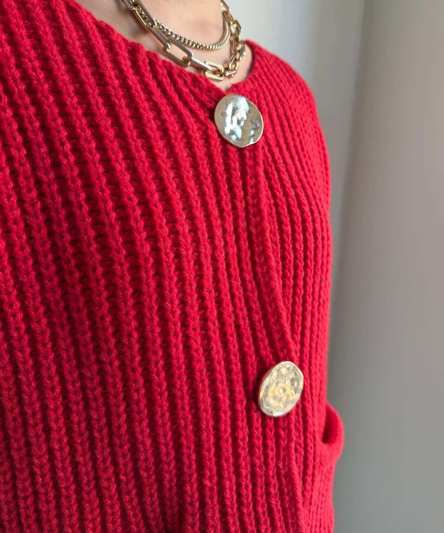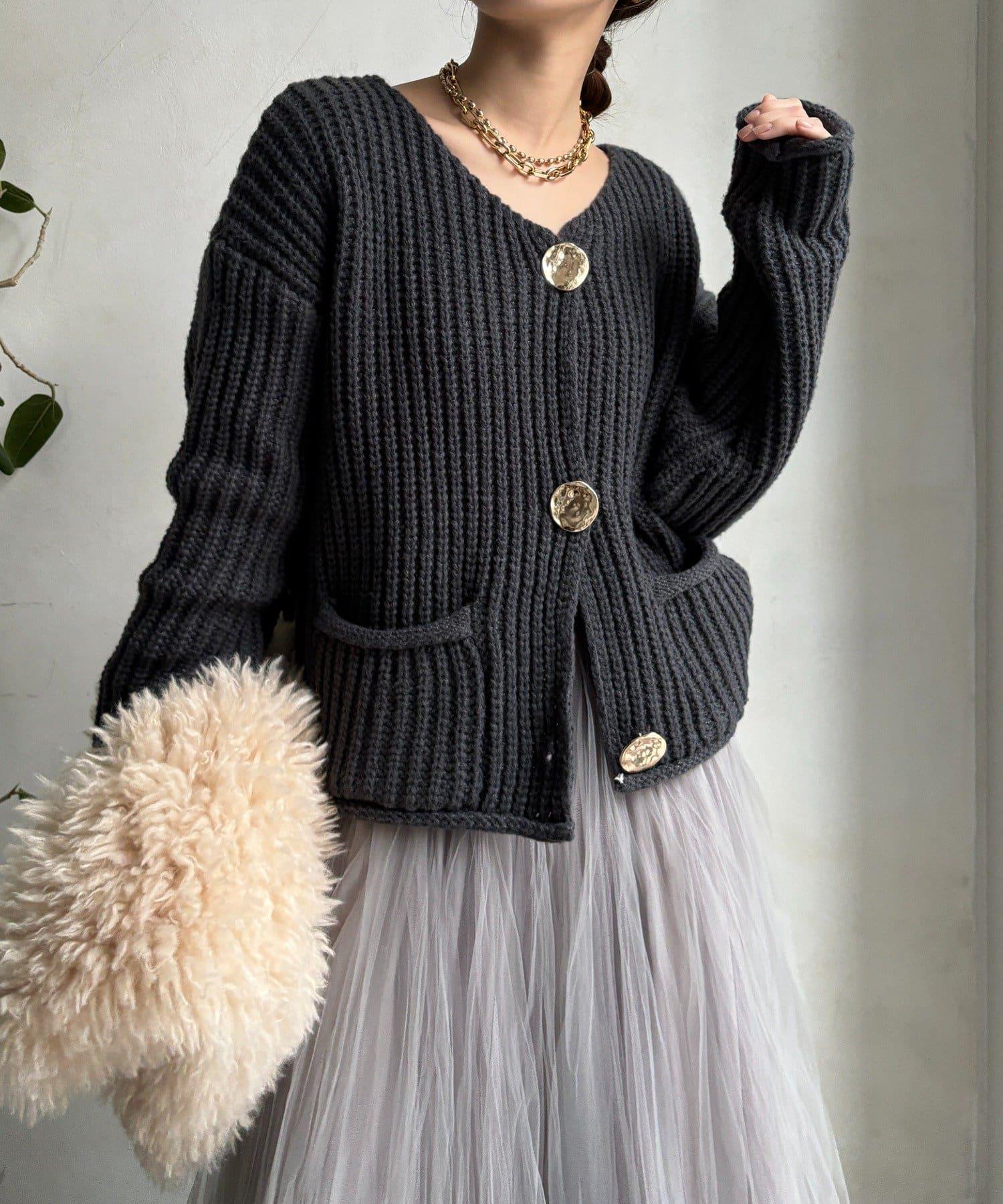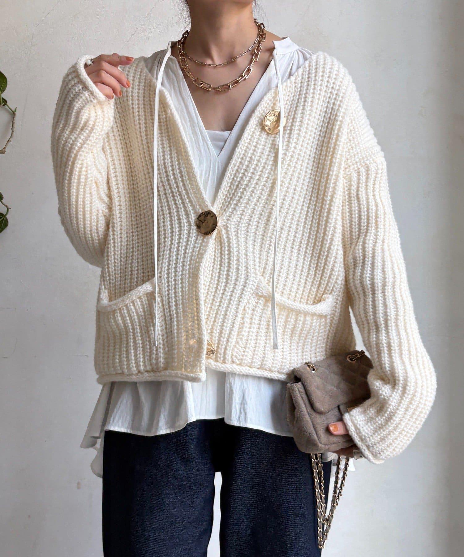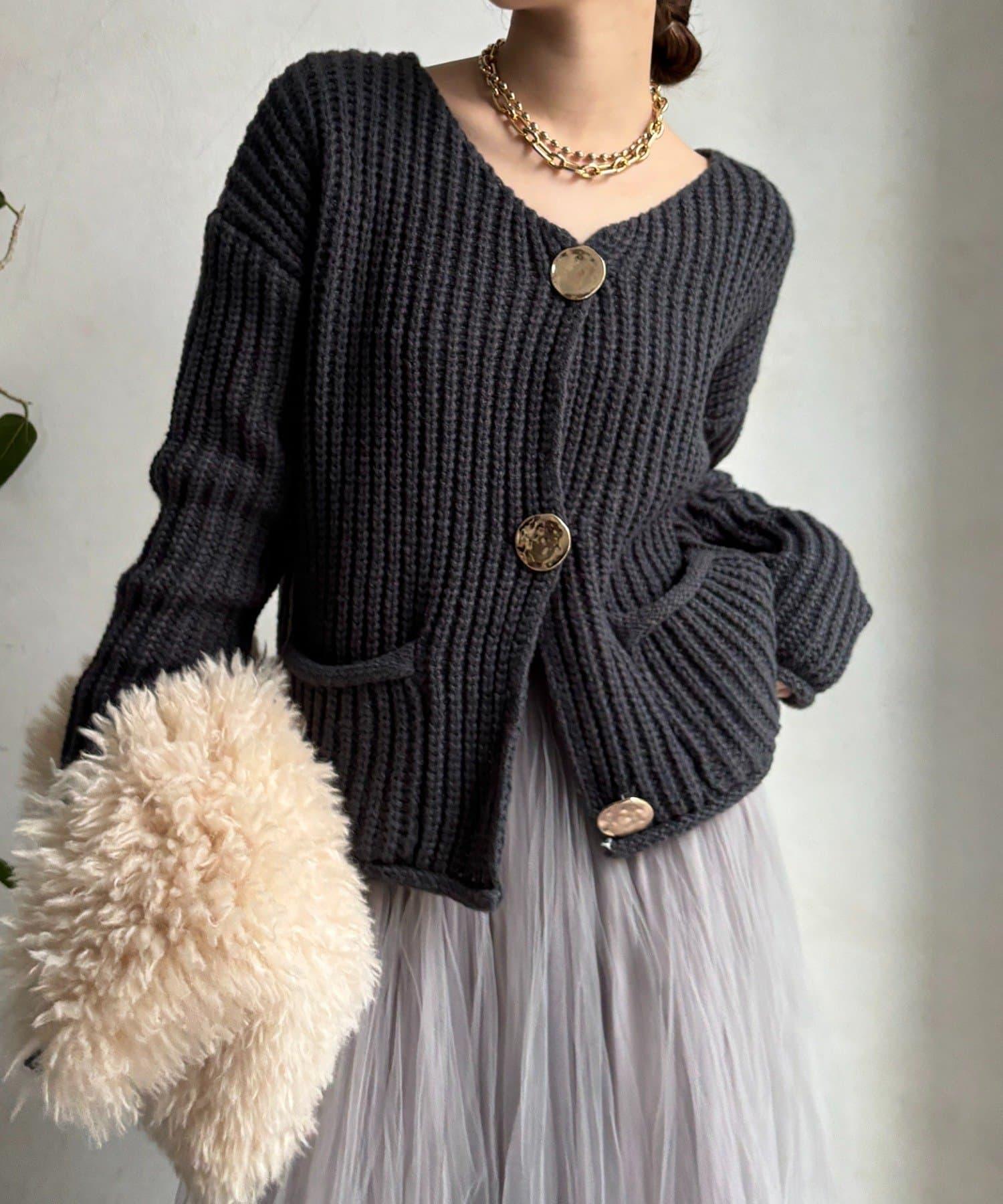 低針距開衫搭配金屬大紐扣,給人留下深刻印象。