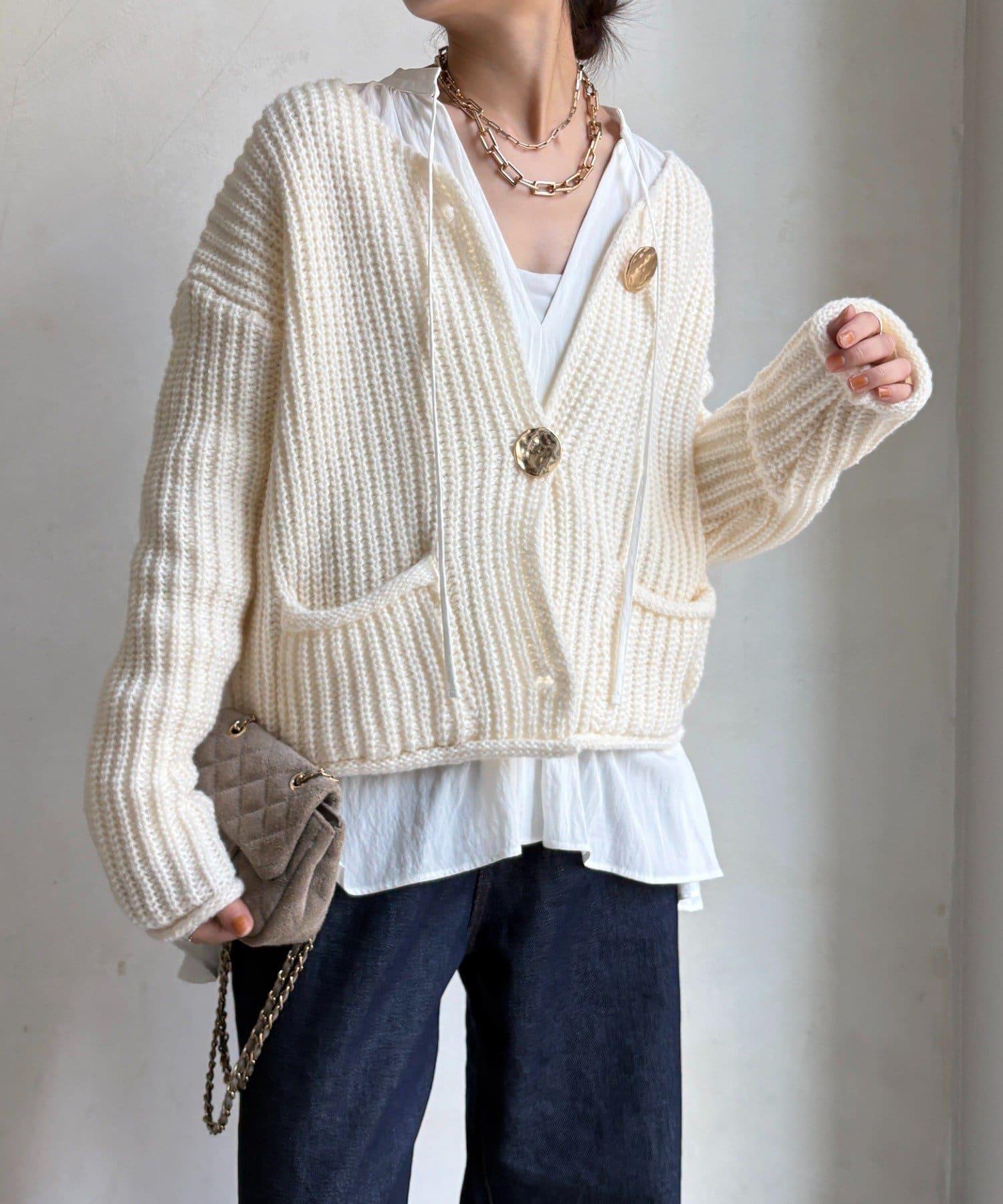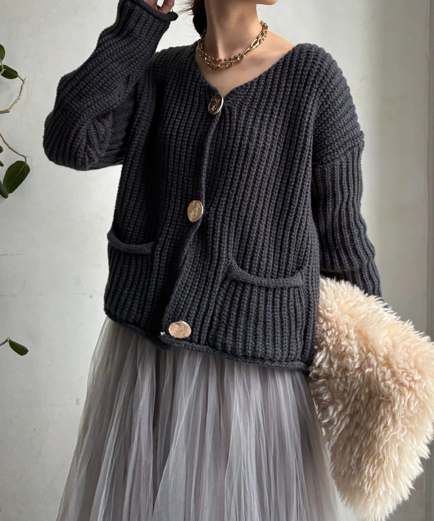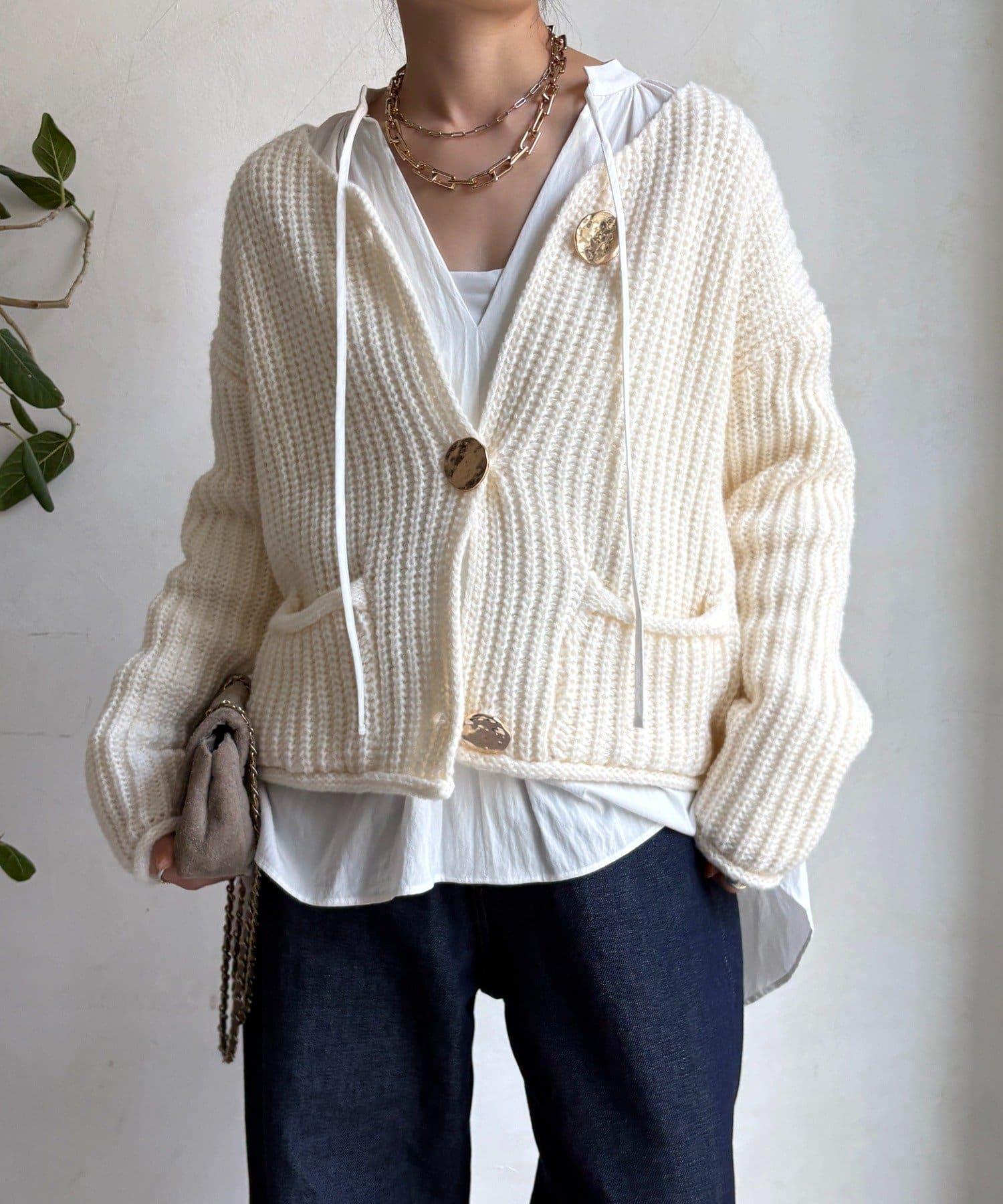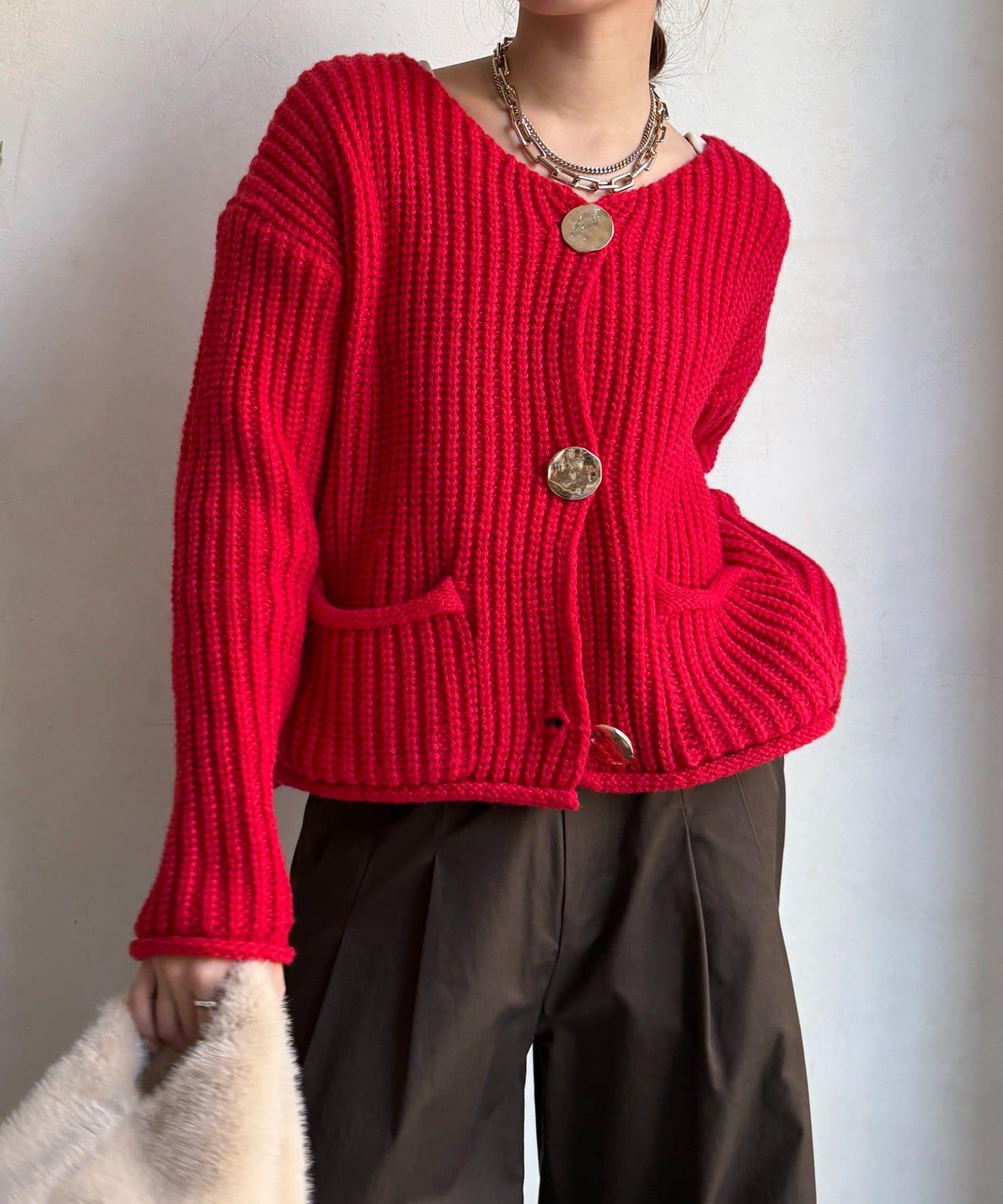 低針距開衫搭配金屬大紐扣,給人留下深刻印象。