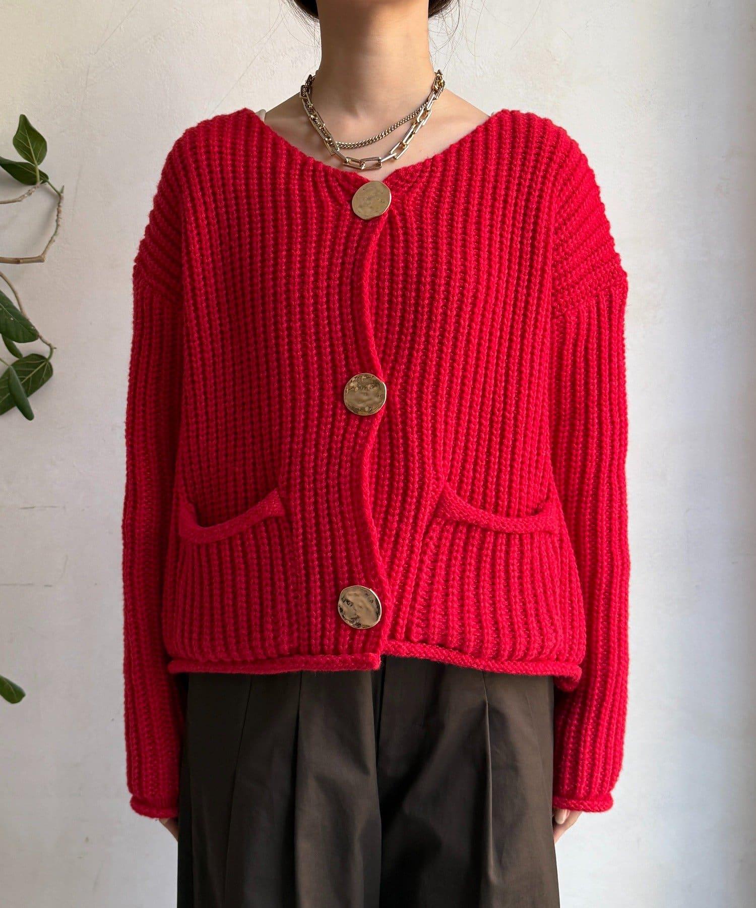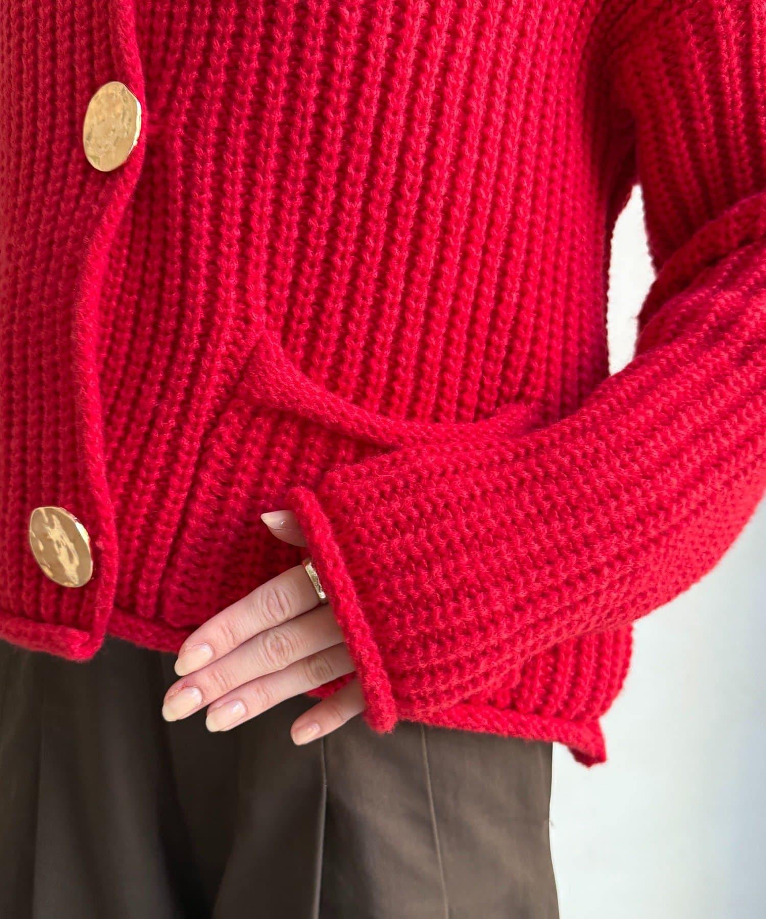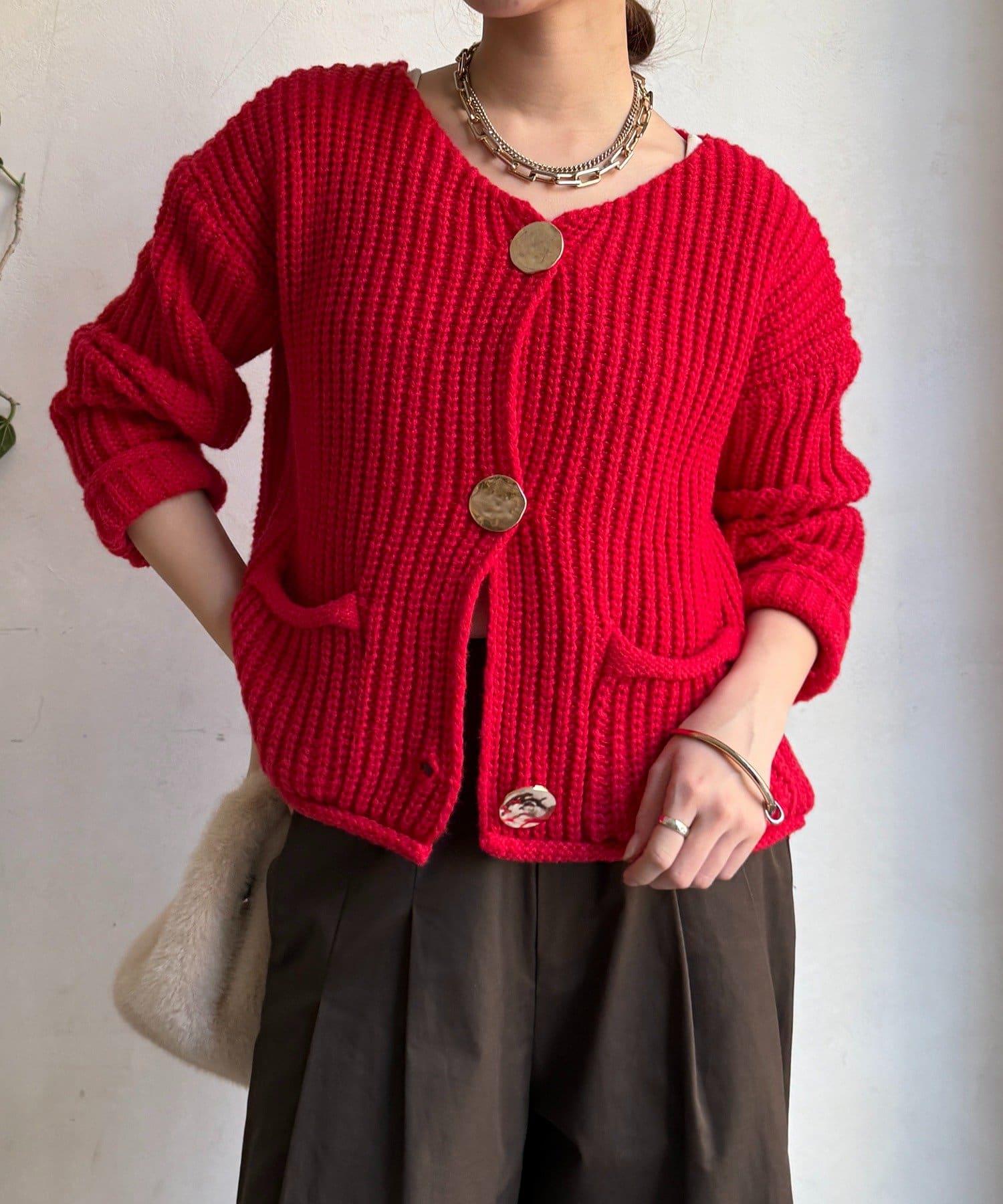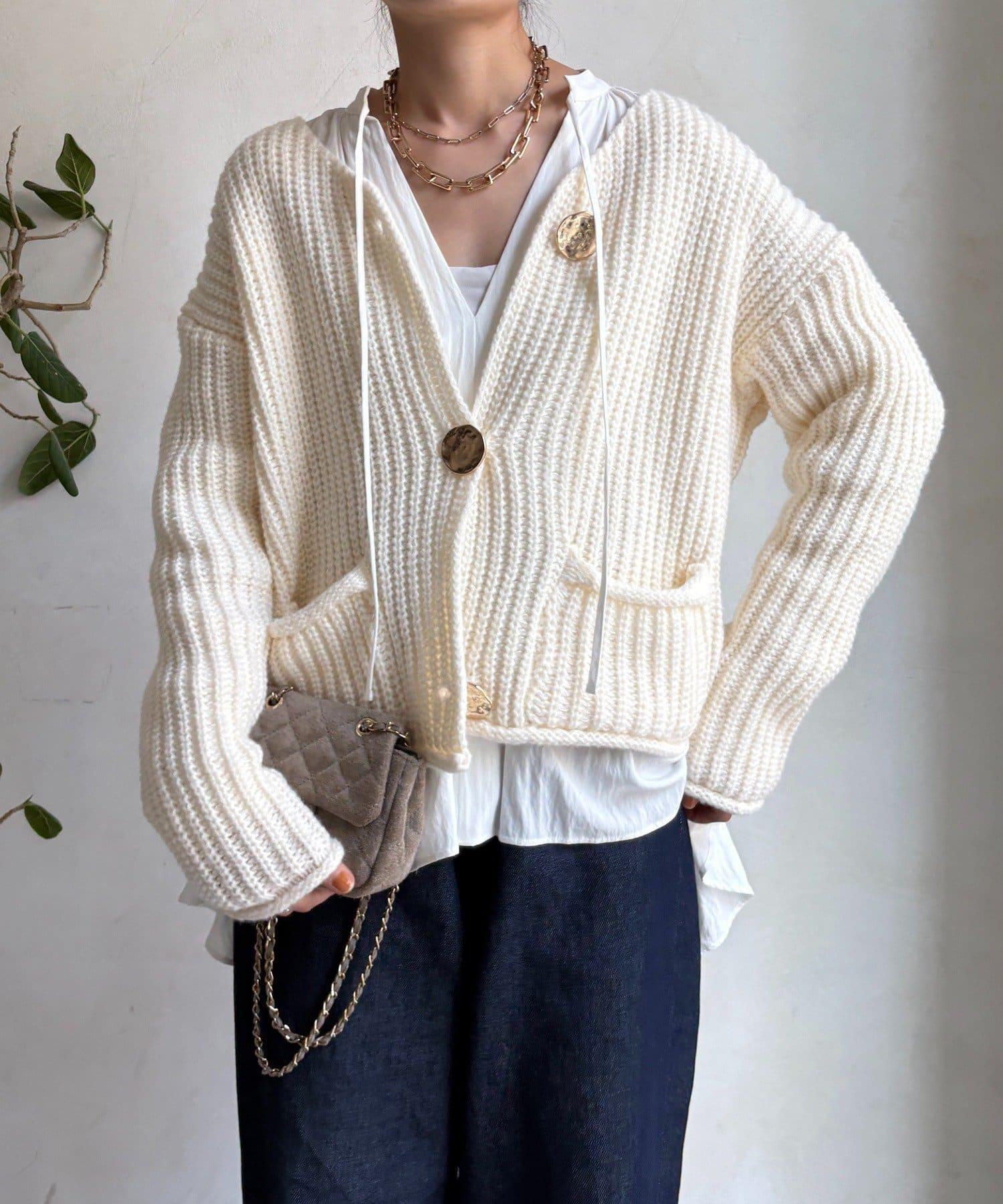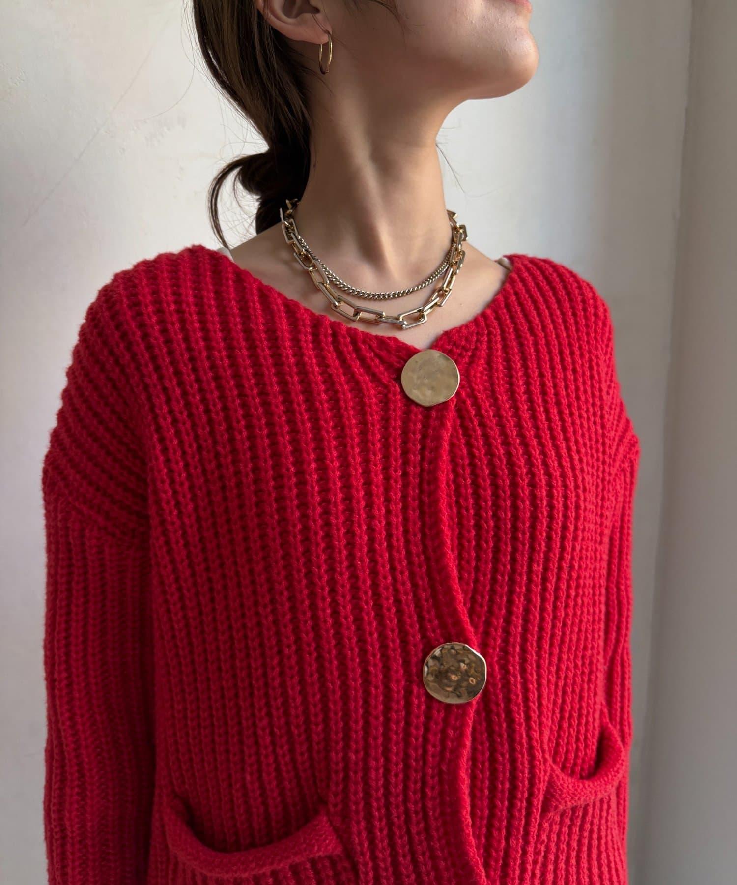 低針距開衫搭配金屬大紐扣,給人留下深刻印象。