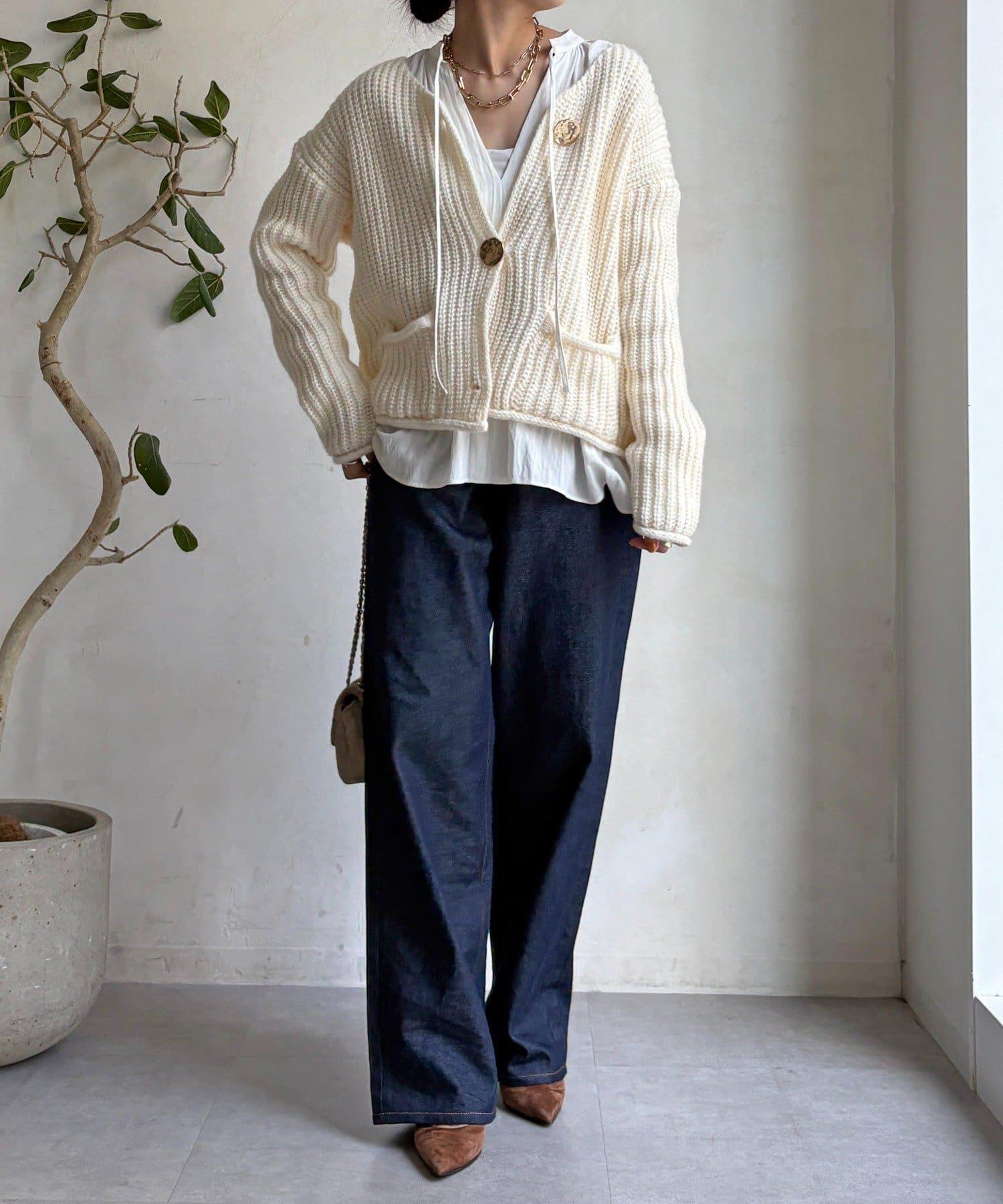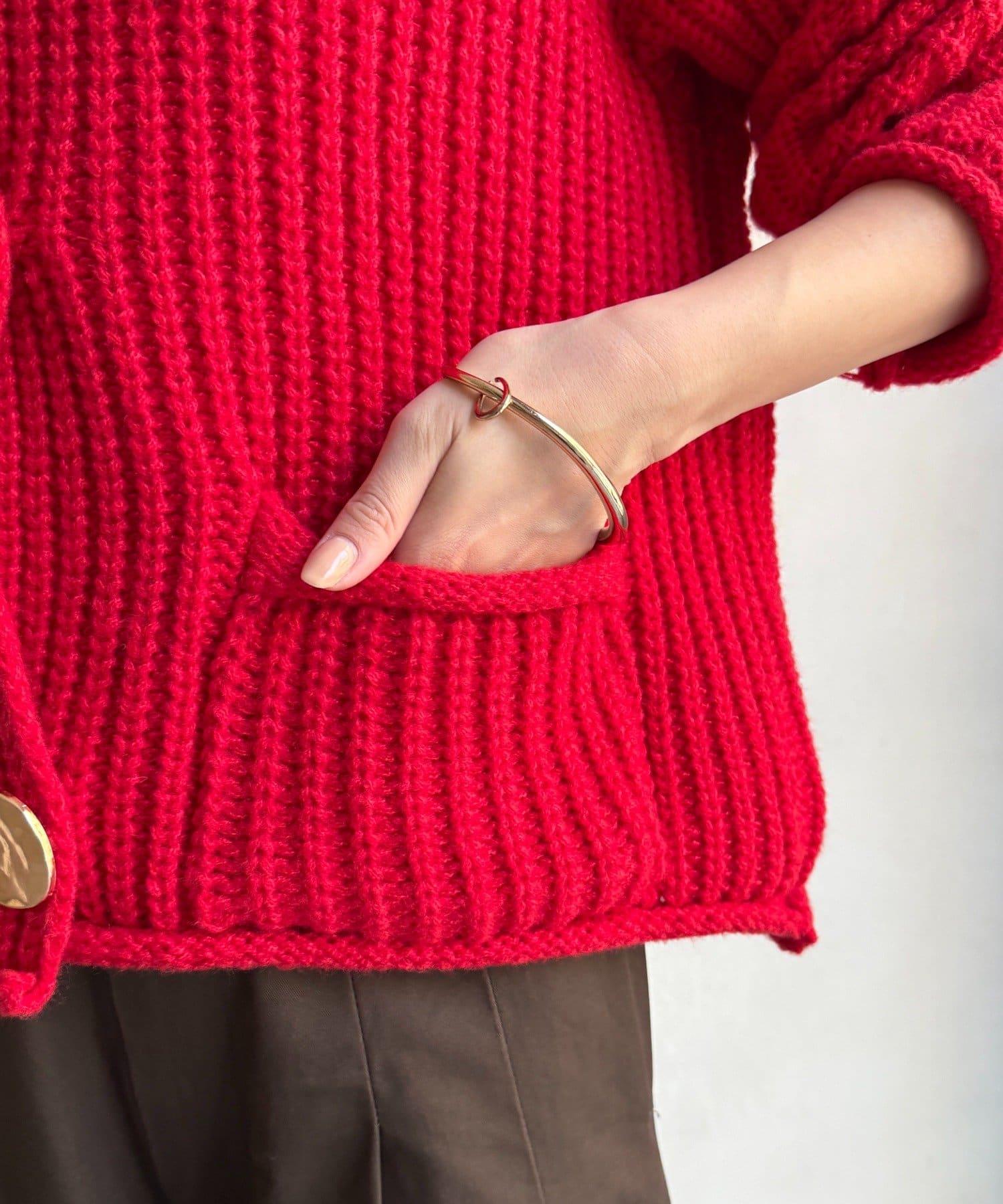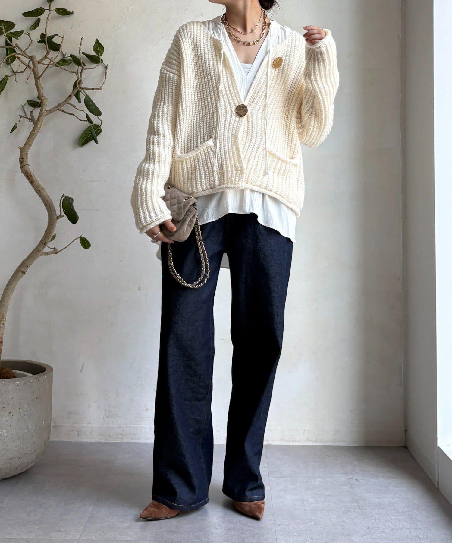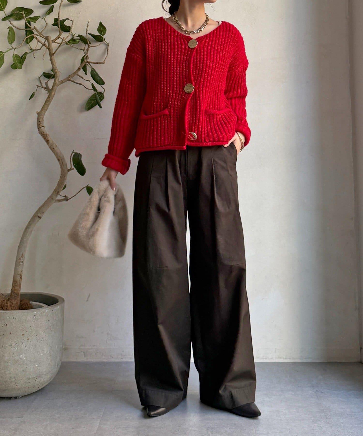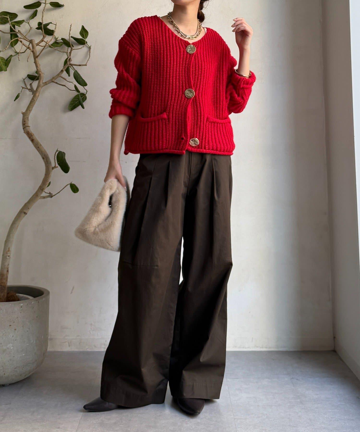低針距開衫搭配金屬大紐扣,給人留下深刻印象。
