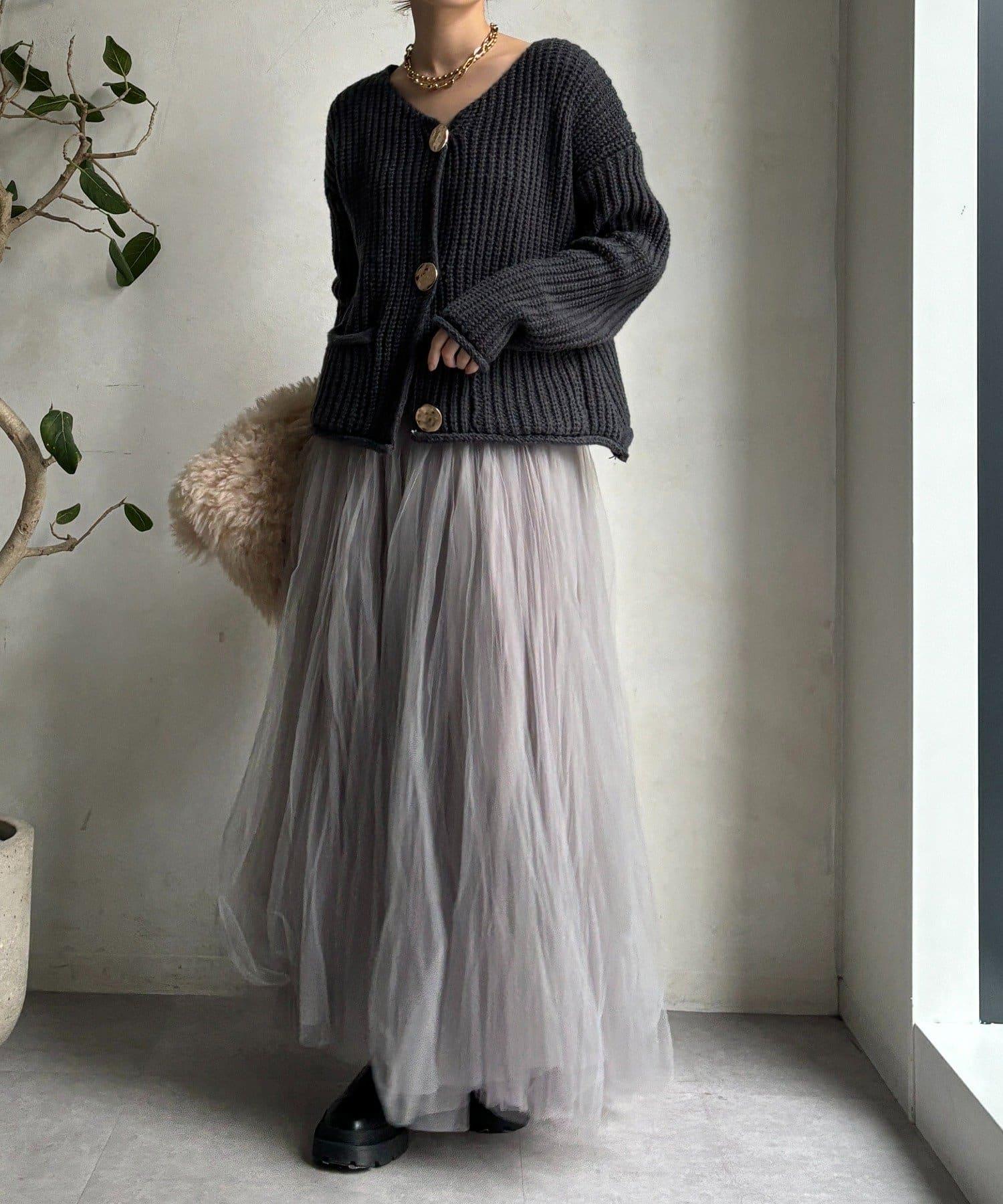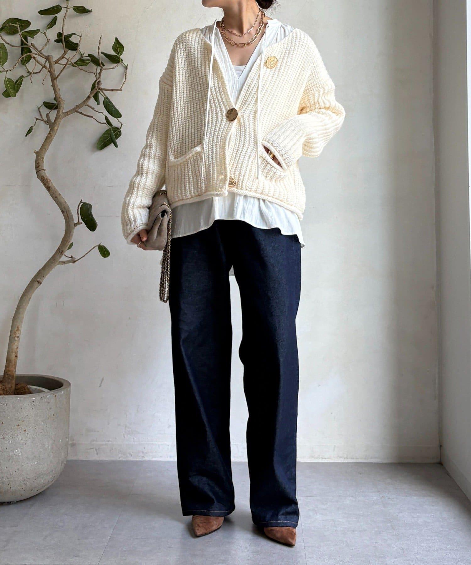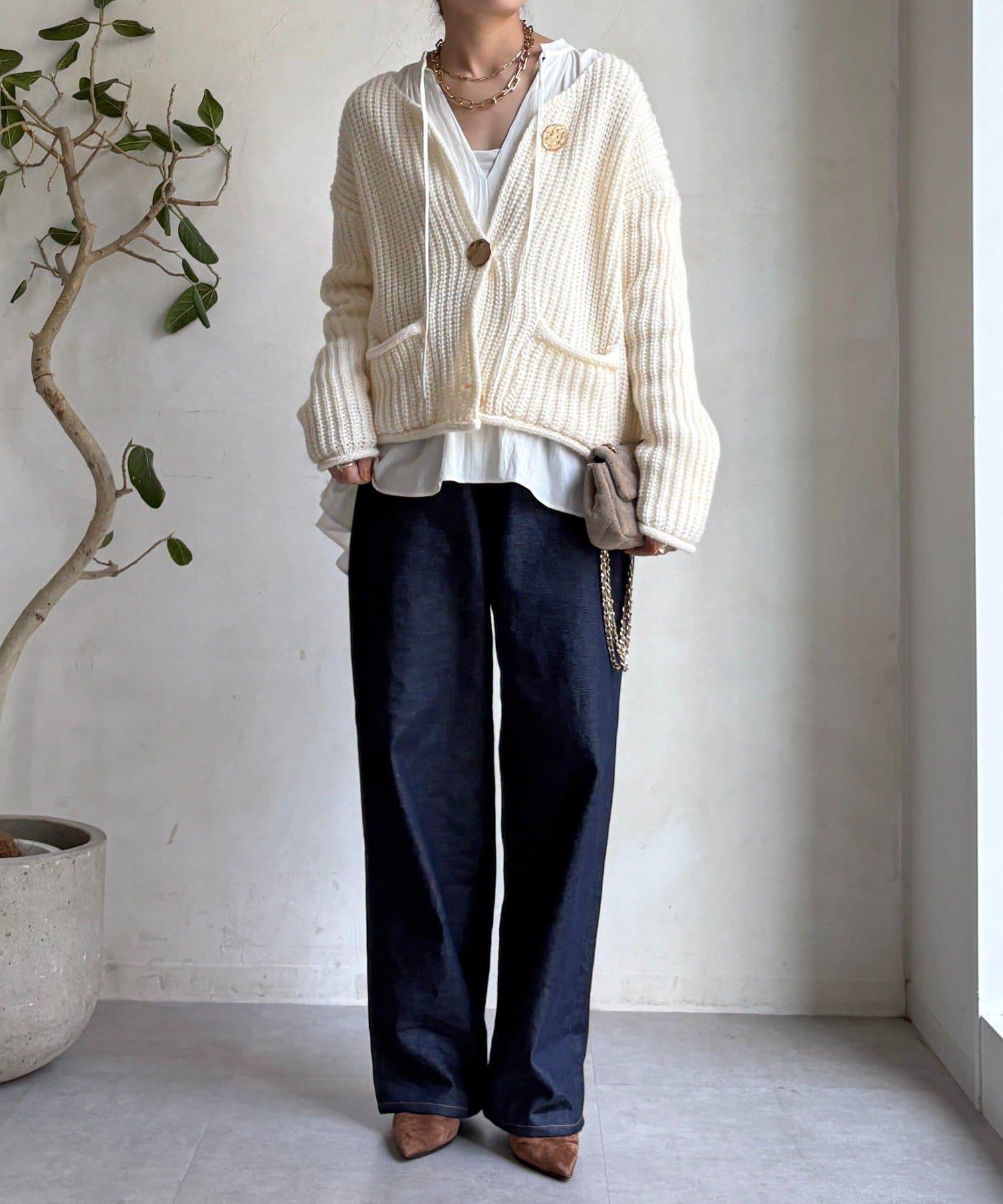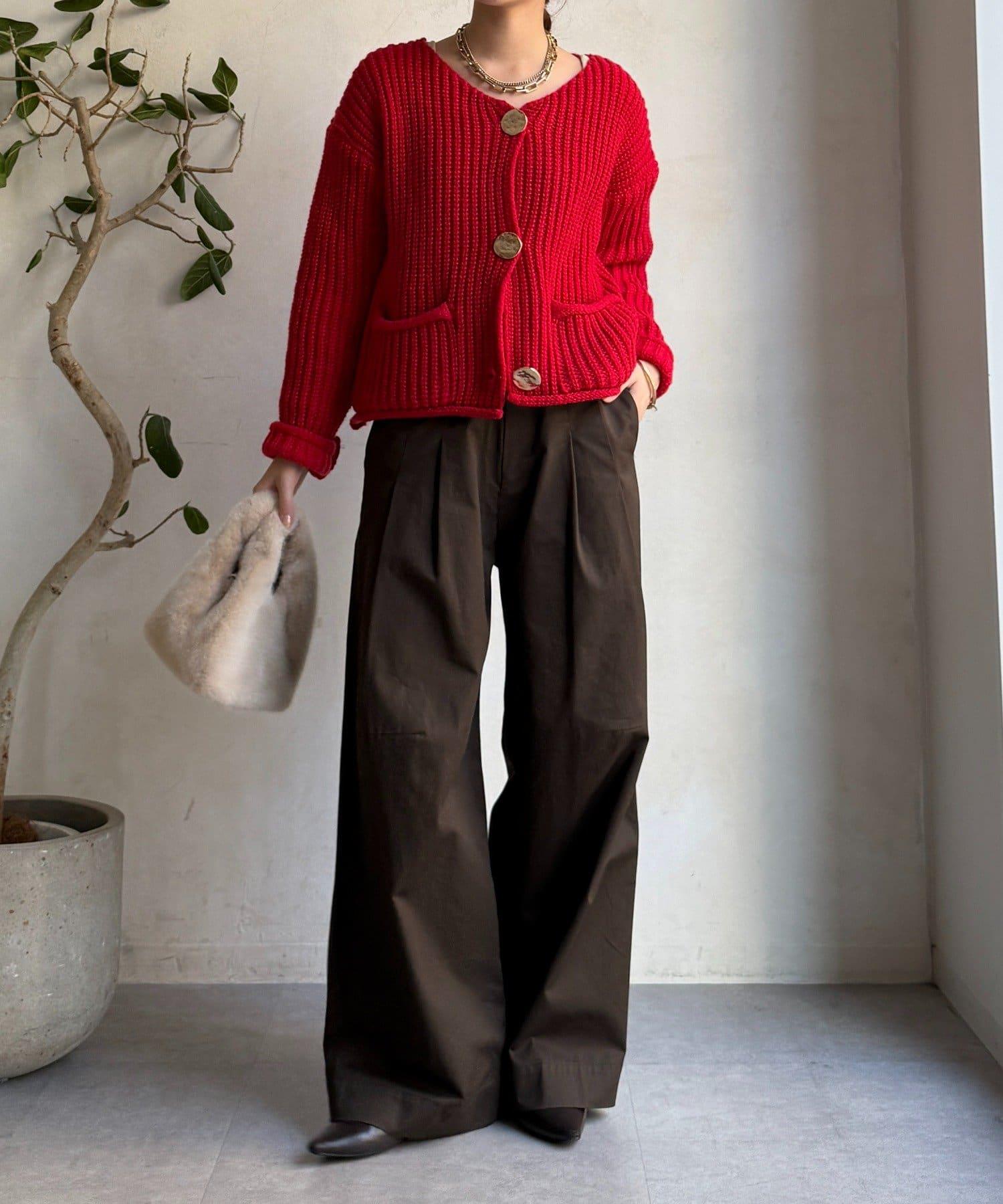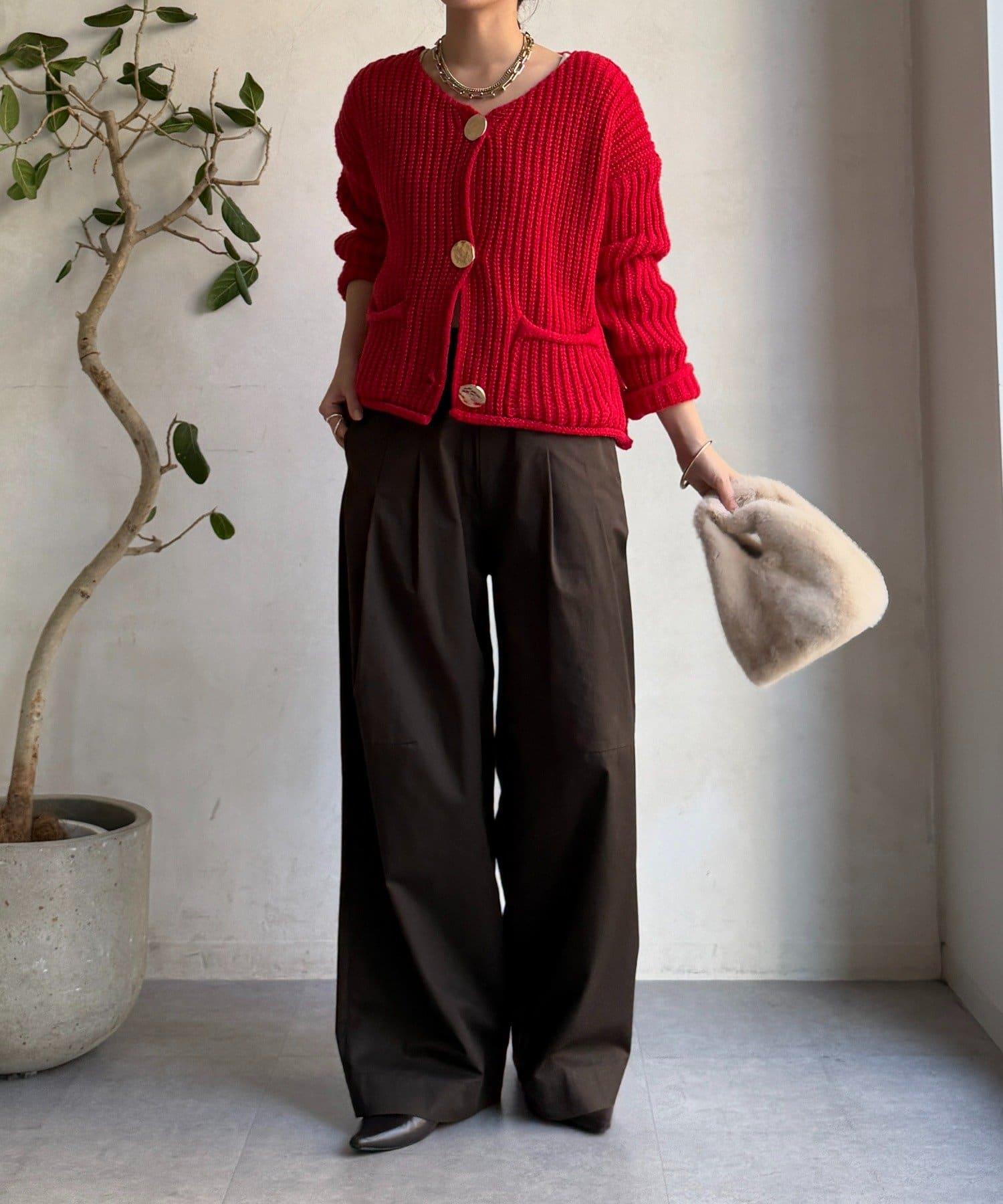 低針距開衫搭配金屬大紐扣,給人留下深刻印象。