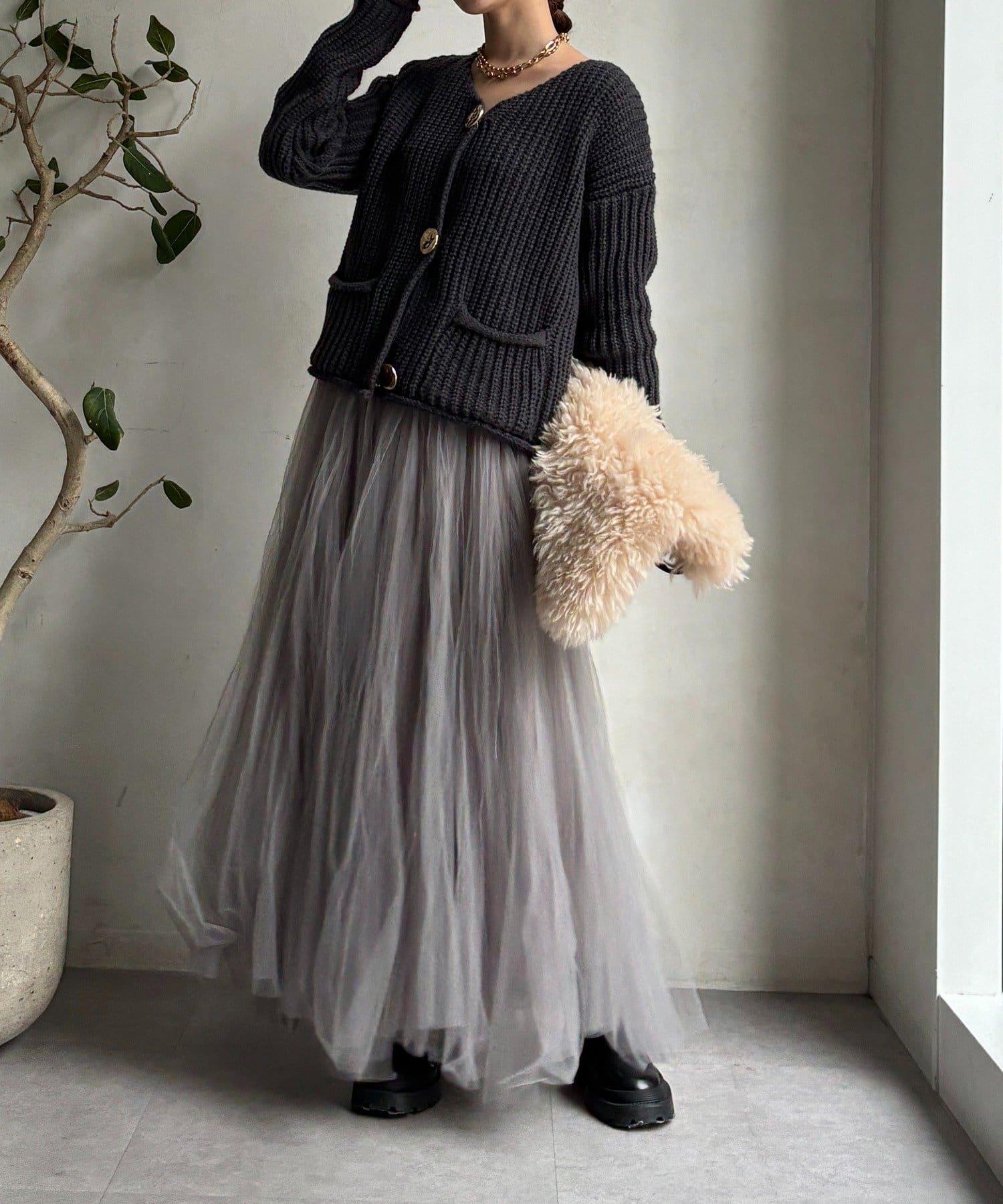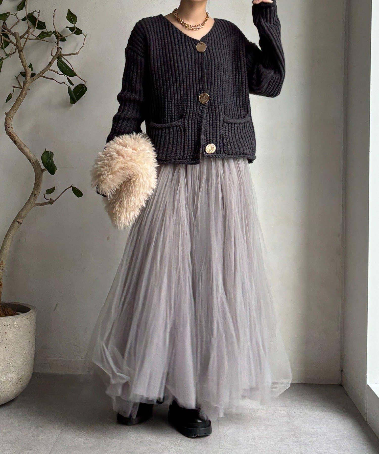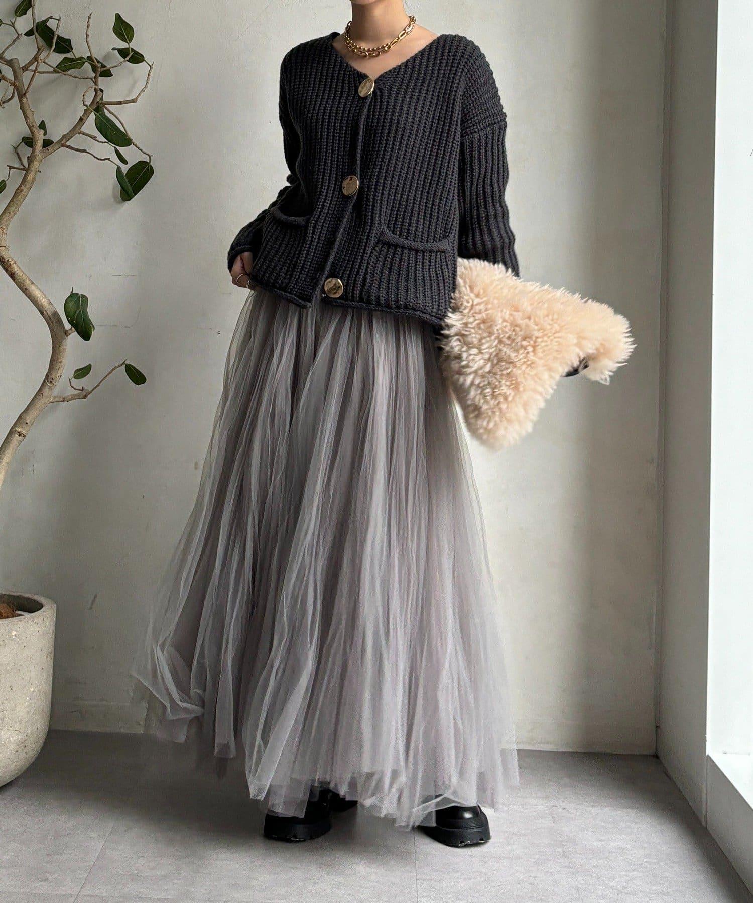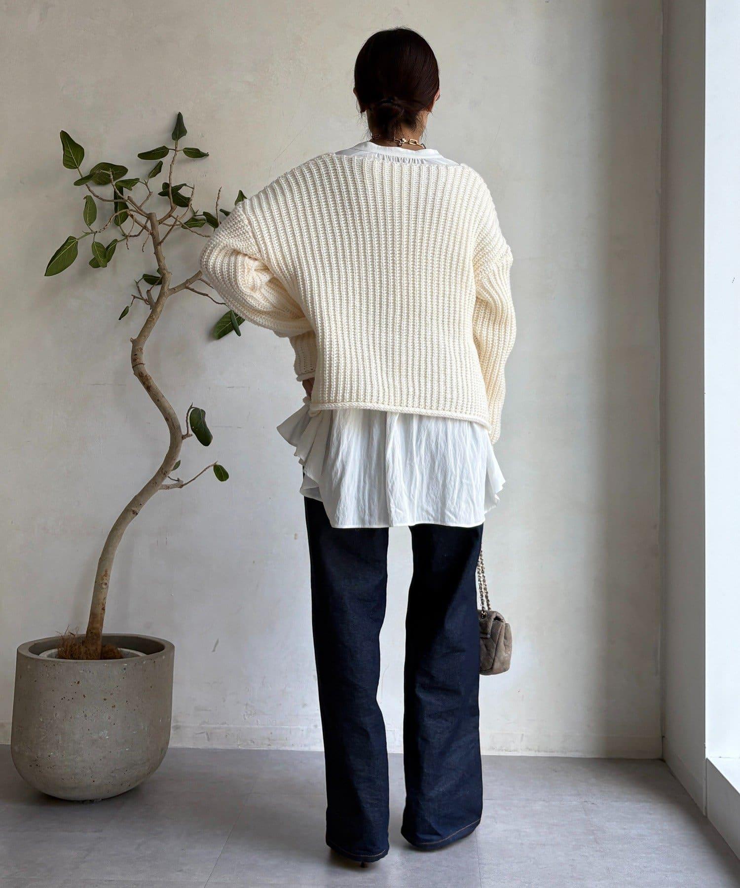 低針距開衫搭配金屬大紐扣,給人留下深刻印象。