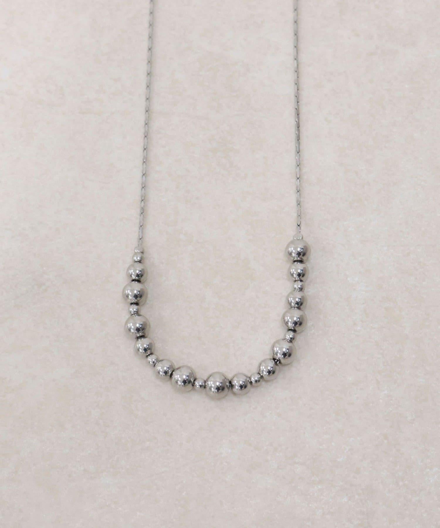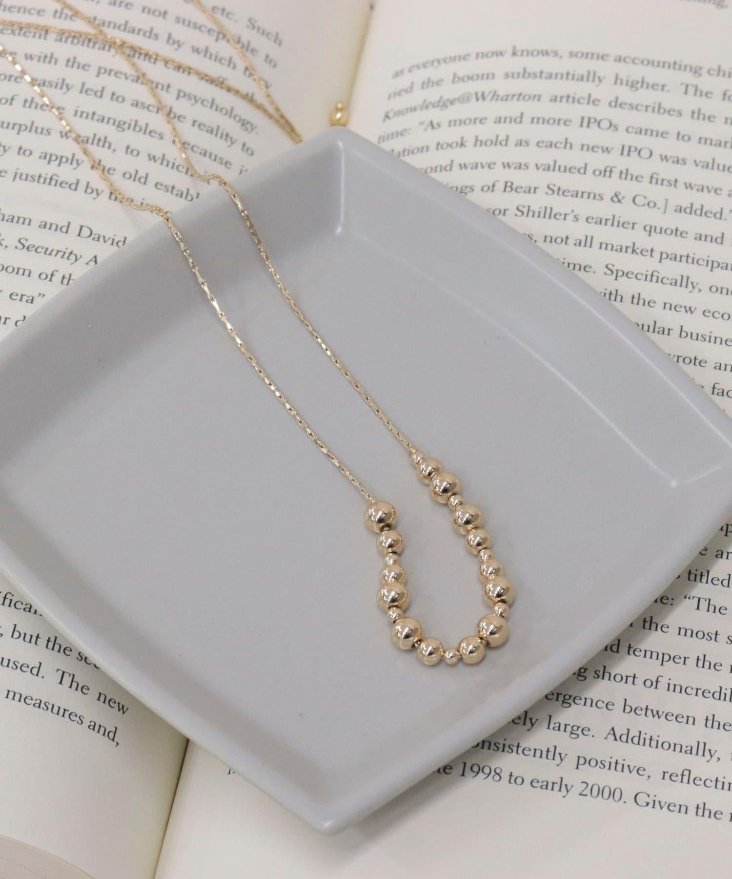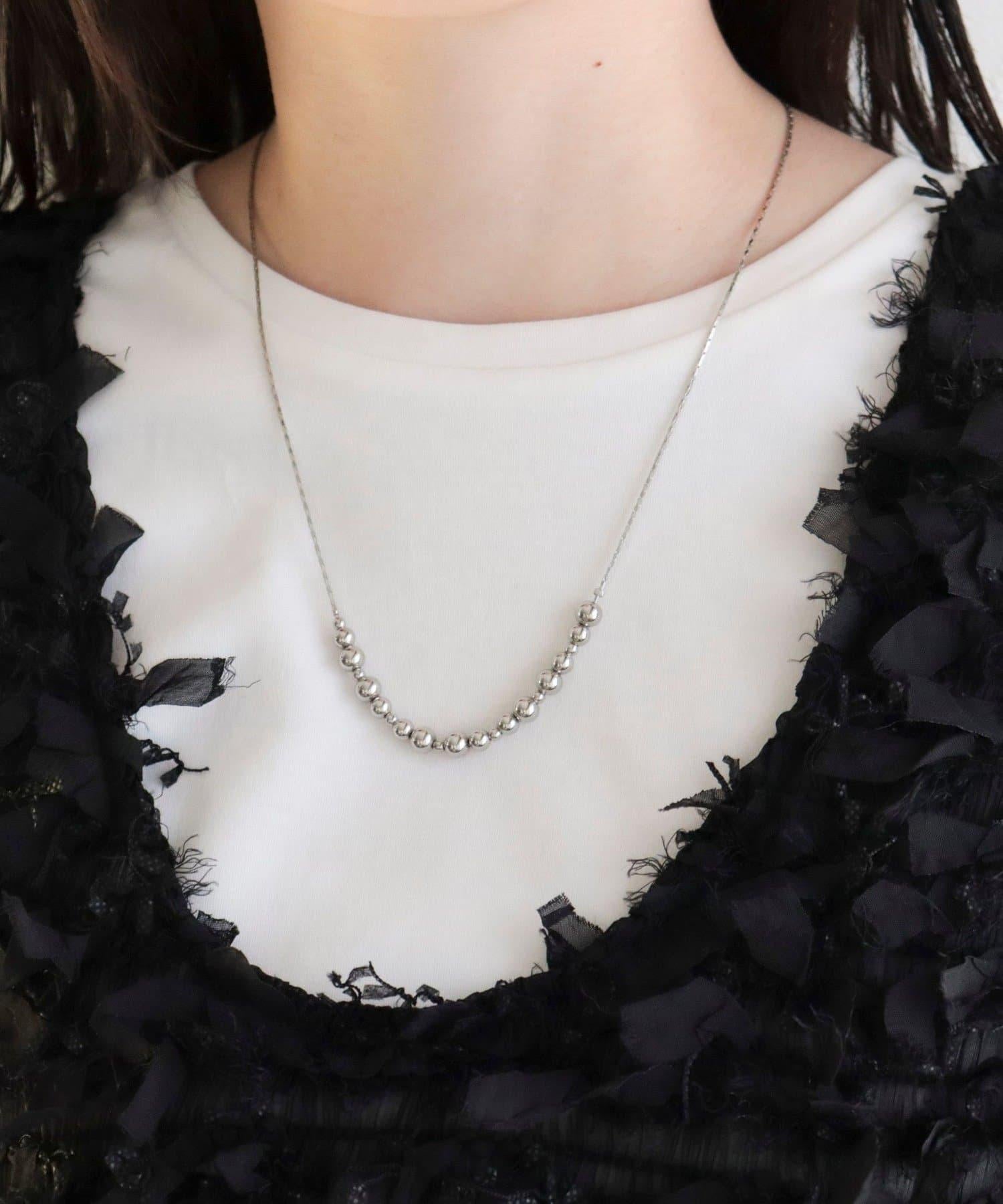項鍊頂部由一系列球形金屬片組成,為頸部線條增添了亮點。