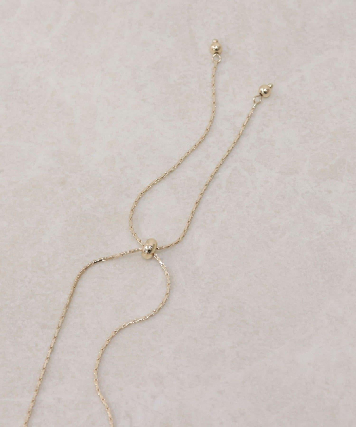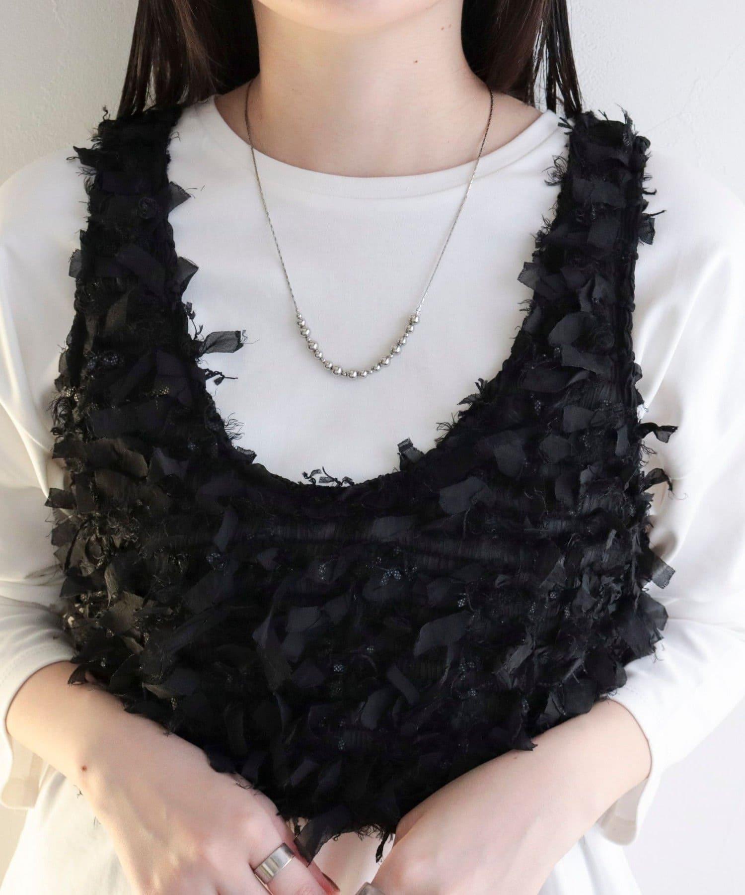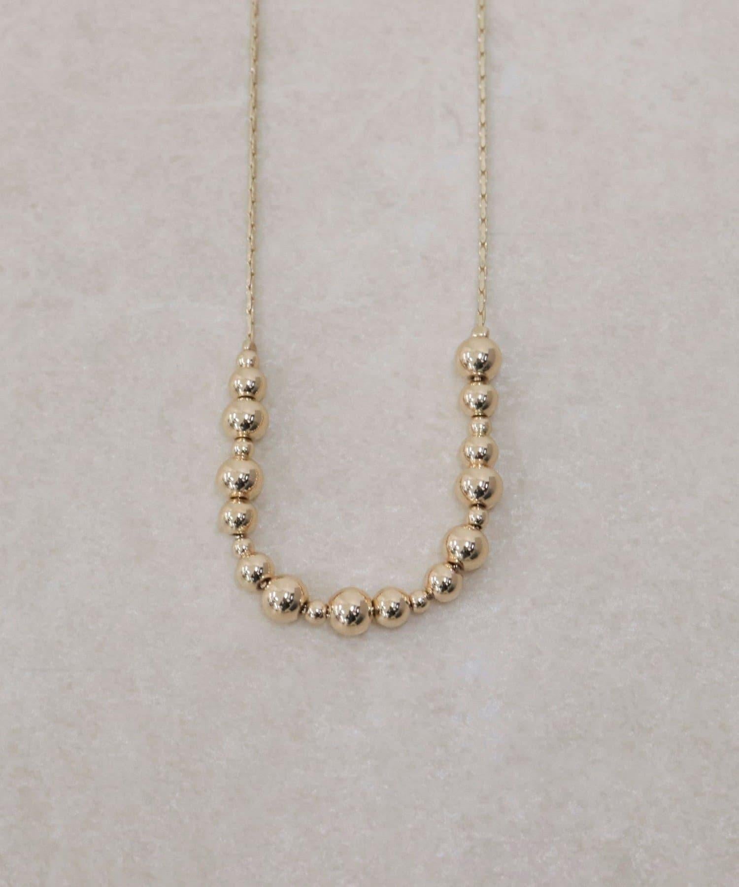 項鍊頂部由一系列球形金屬片組成,為頸部線條增添了亮點。