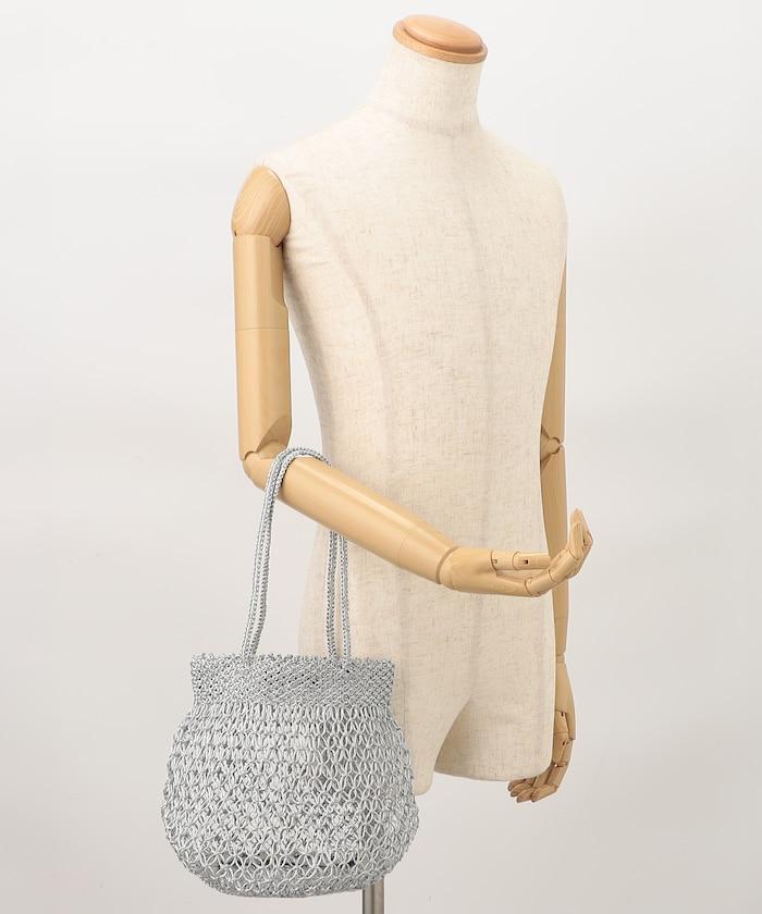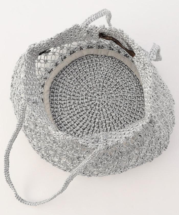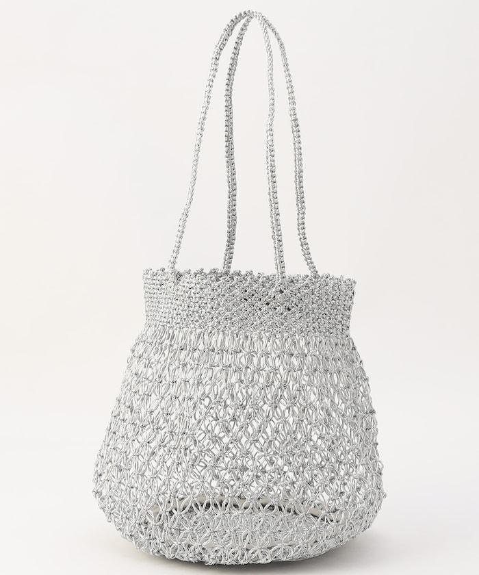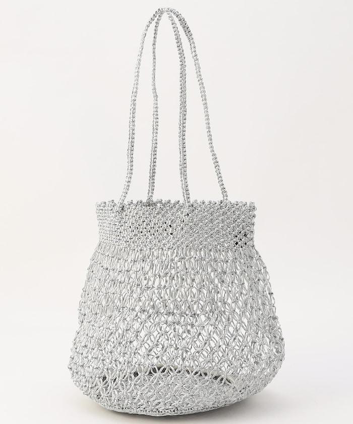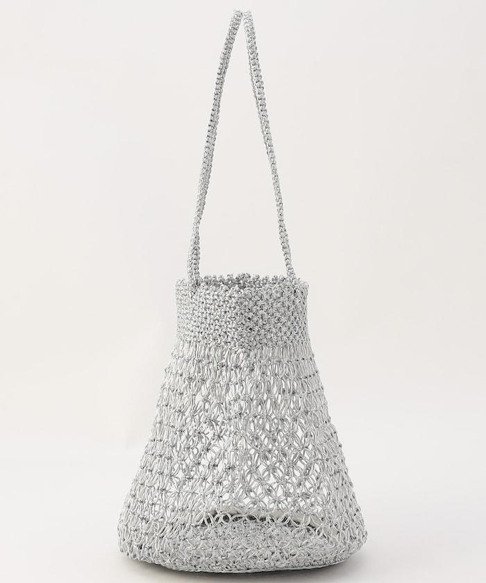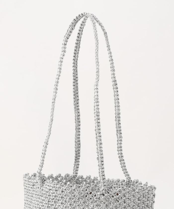 這款手袋由手工藝人採用金屬裝飾紗線手工編織而成。