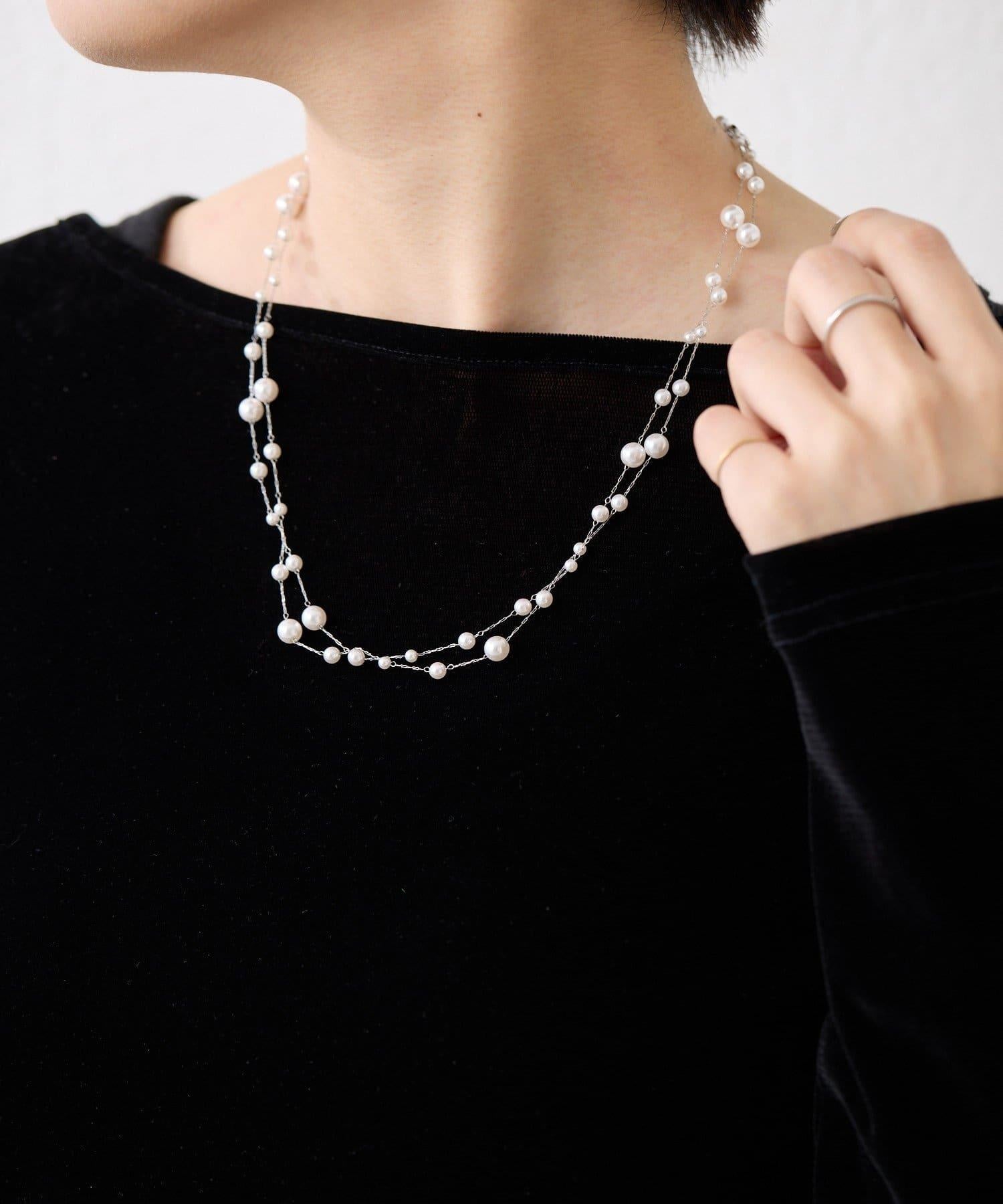 長頸珍珠項鍊,珍珠均勻分佈在精緻的超細不鏽鋼鏈條上。