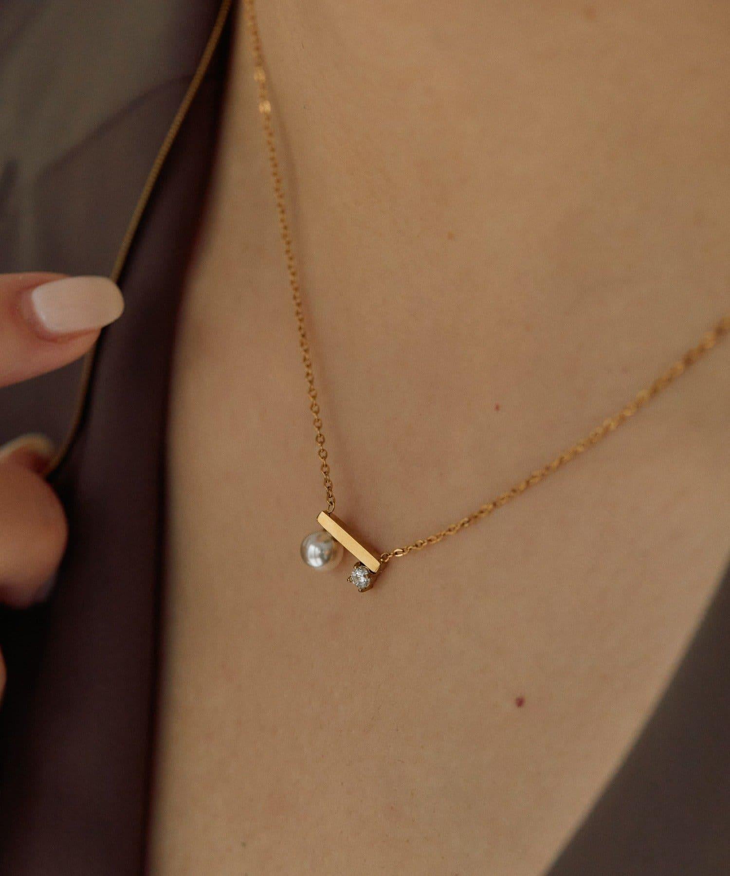 項鍊左右兩側不同尺寸的不平衡使其呈現出獨特的不對稱設計。