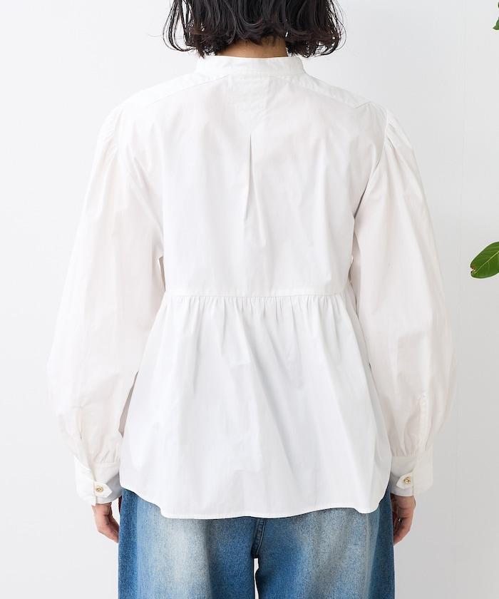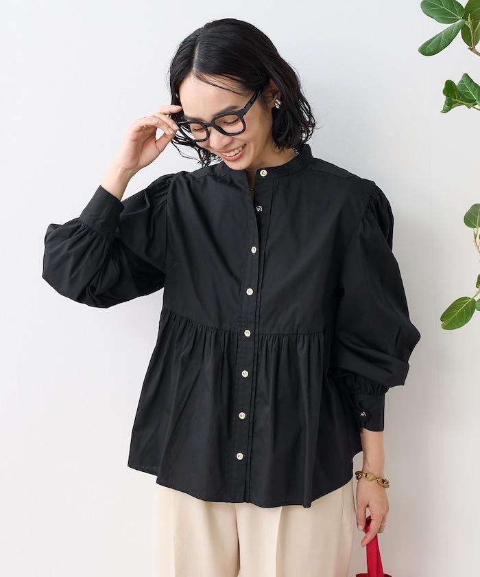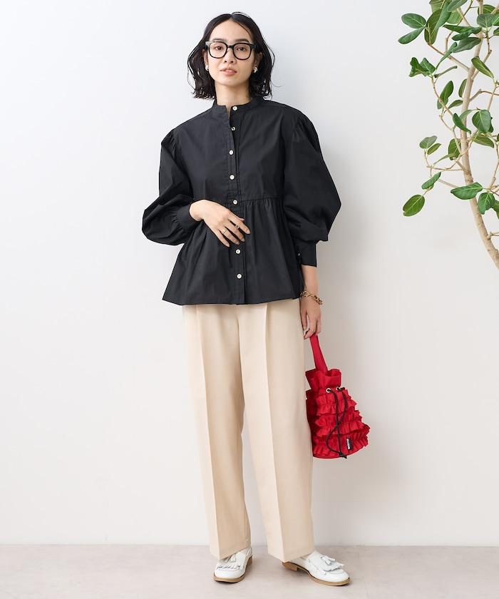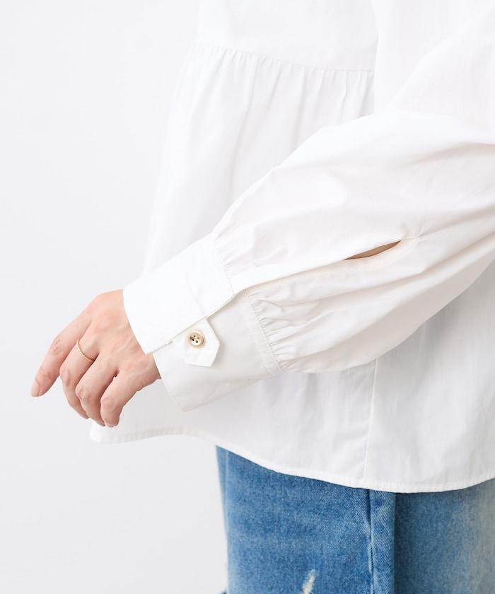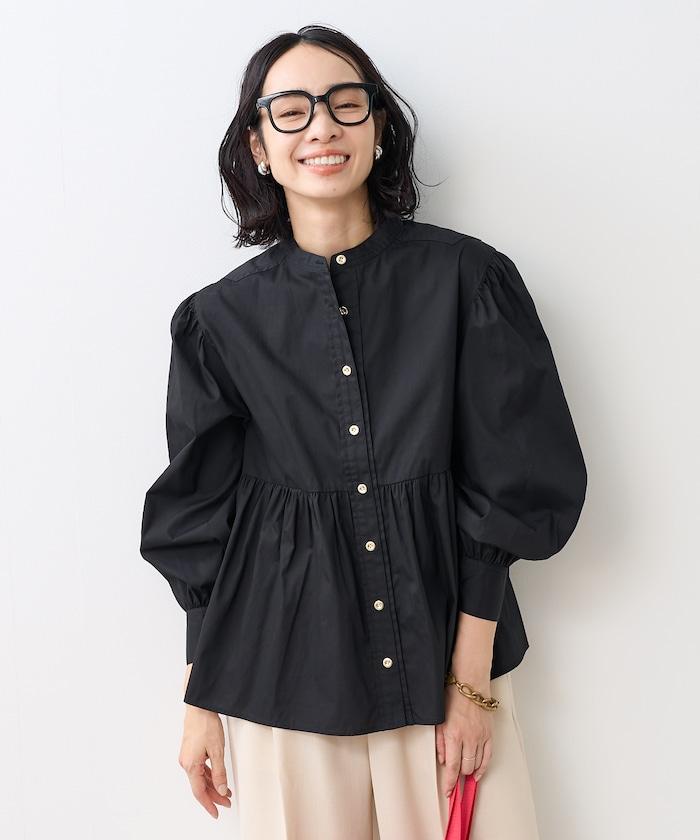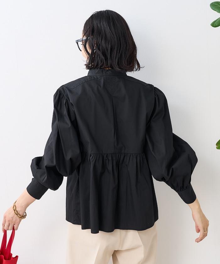 這是一款均衡的上衣,採用聚攏的蓬袖設計和簡潔的無領設計。