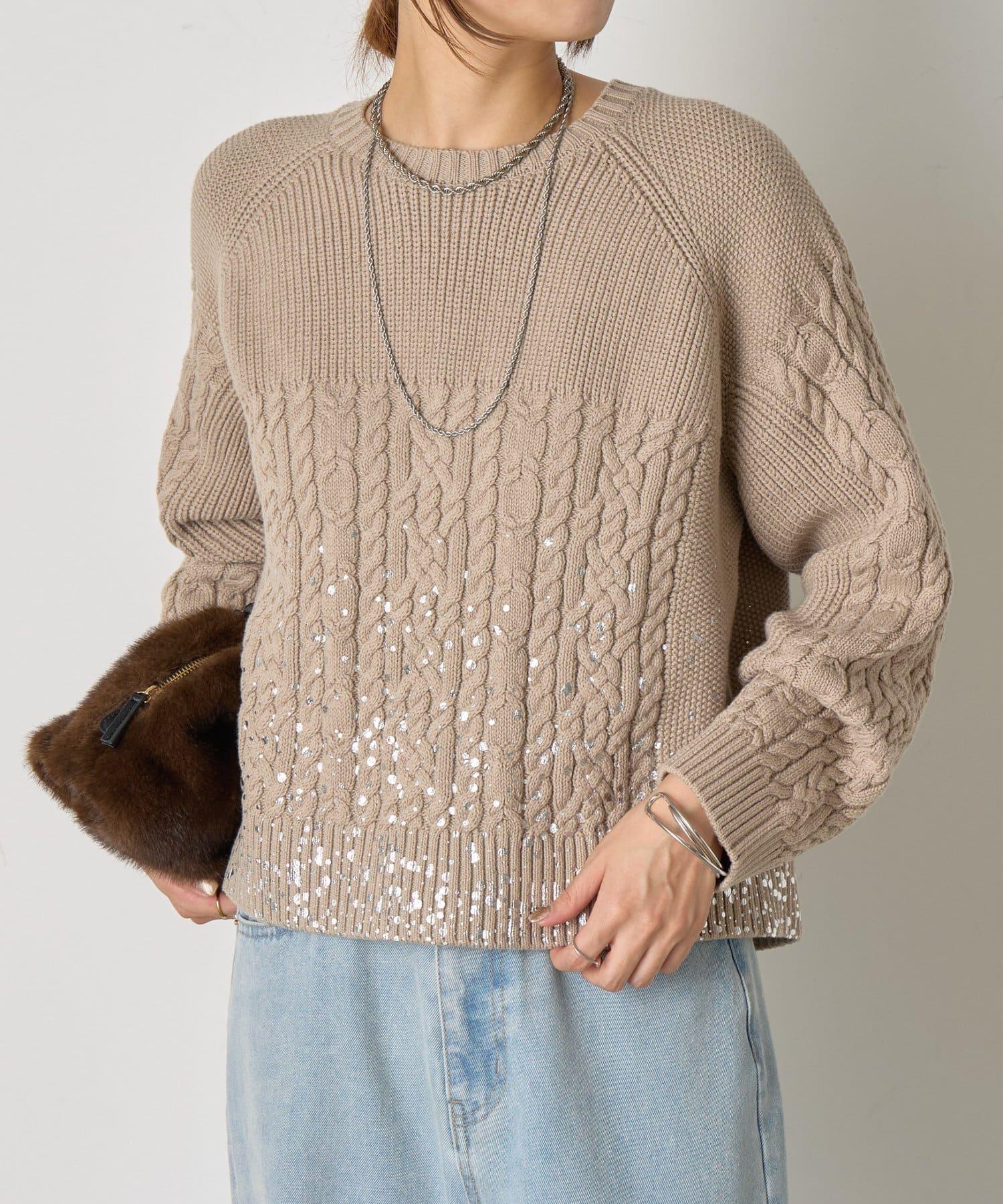 電纜針織設計配以金箔印花點綴,增添了一絲嬌媚。