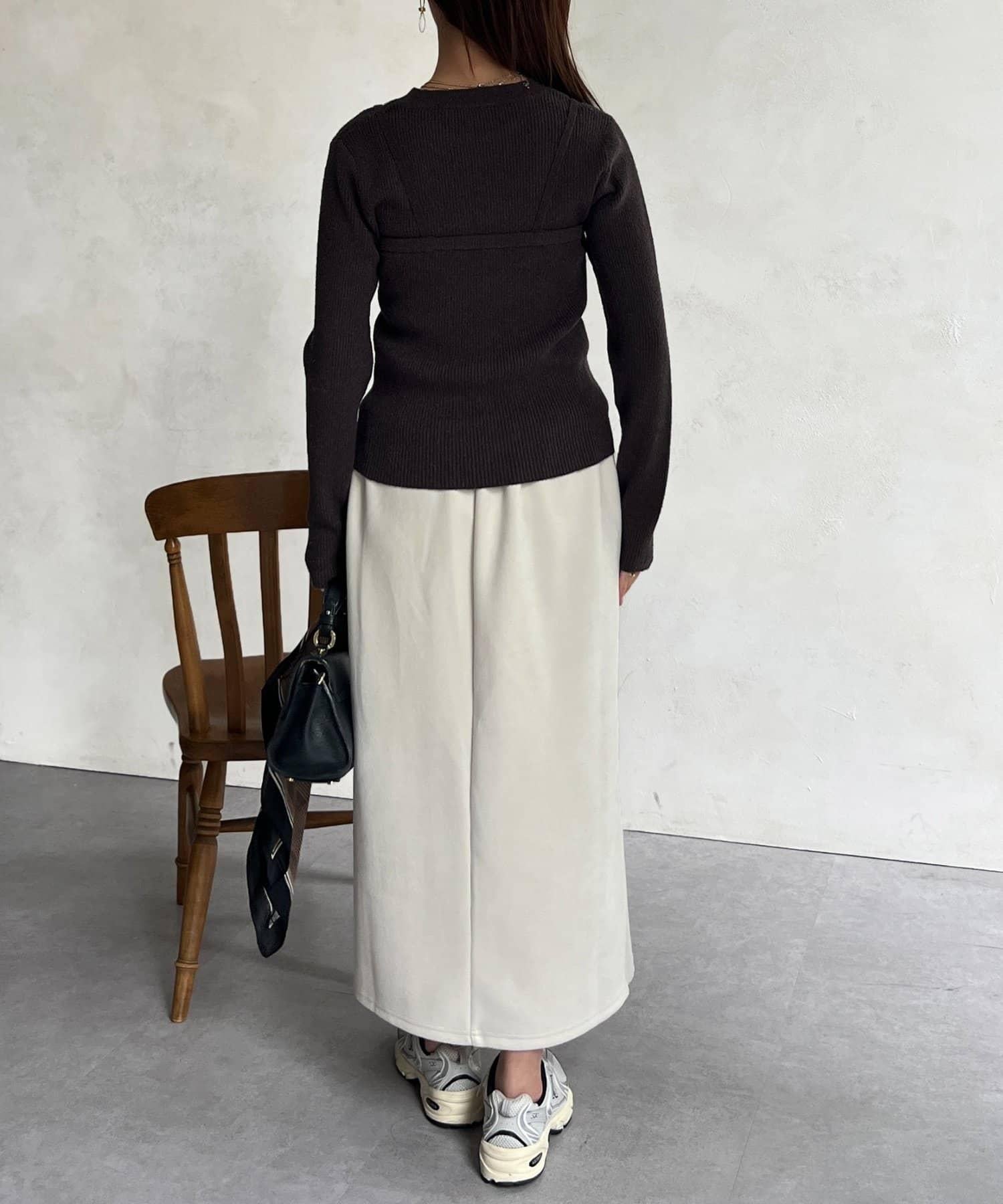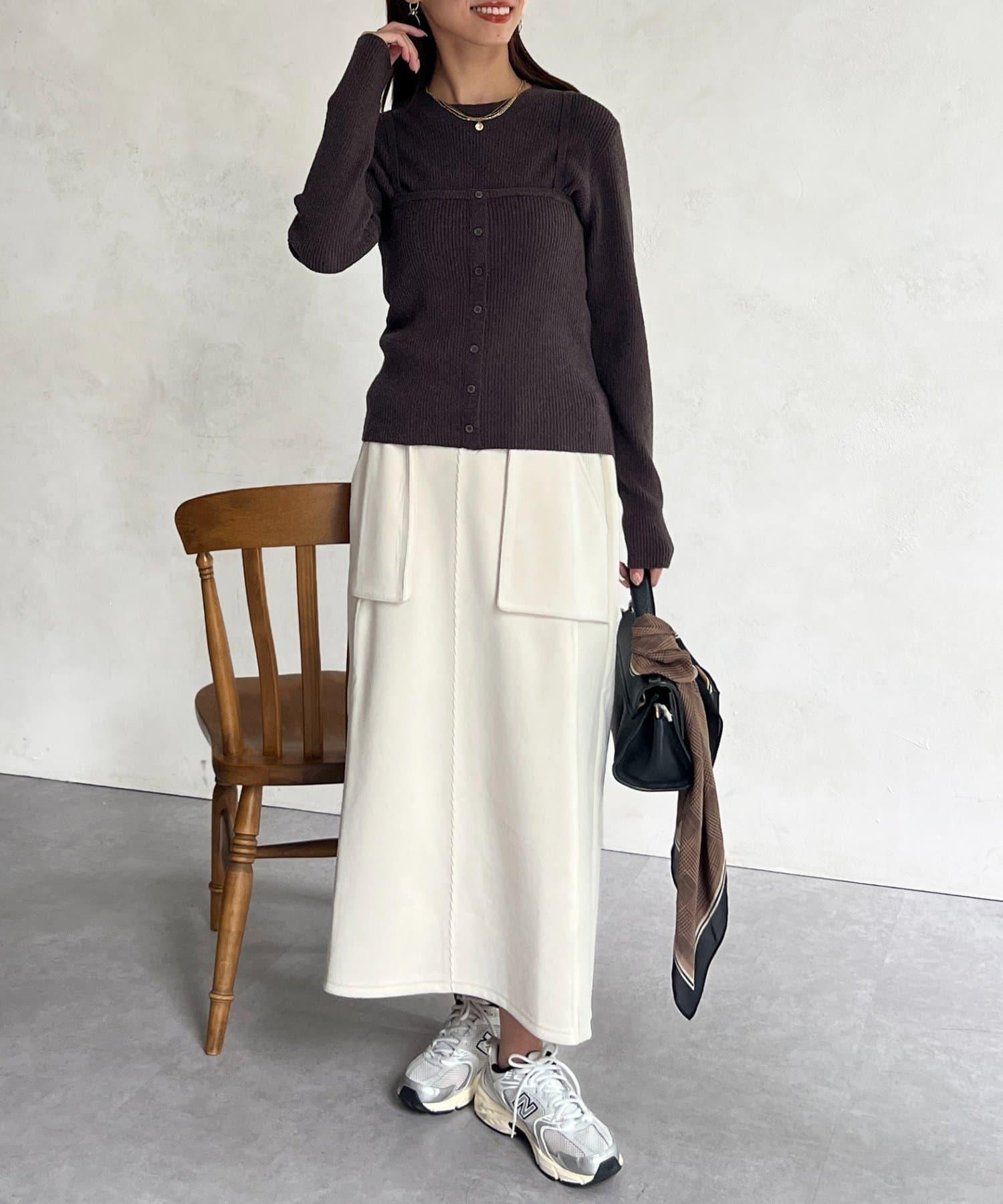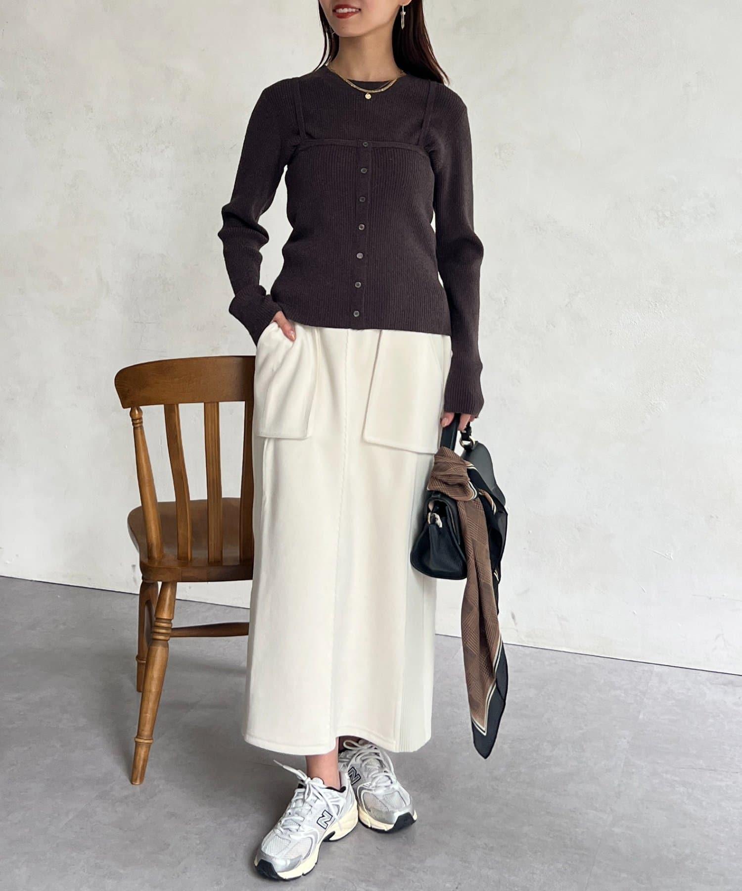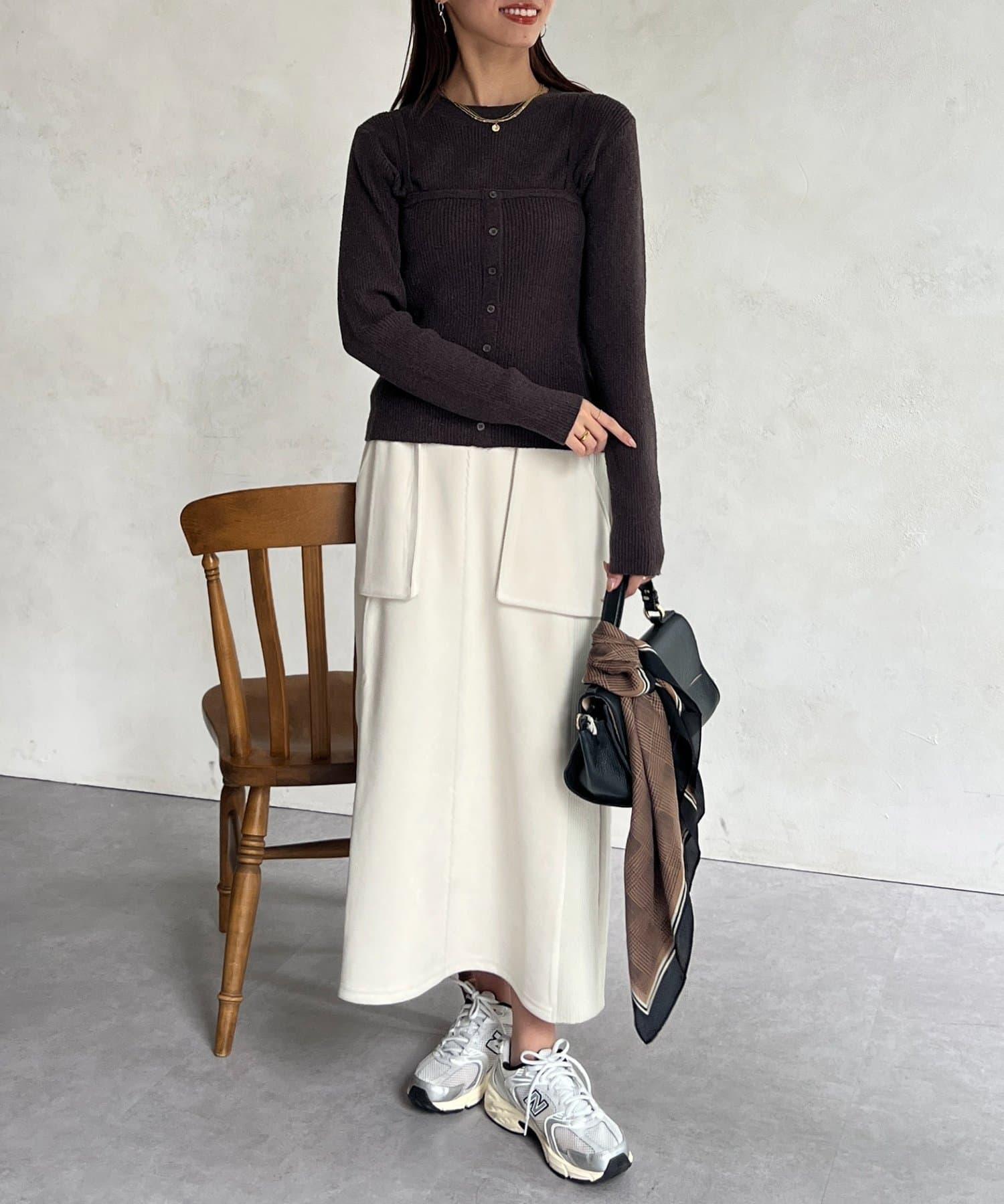 有趣的疊穿單品,搭配同材質的半身裙套裝。