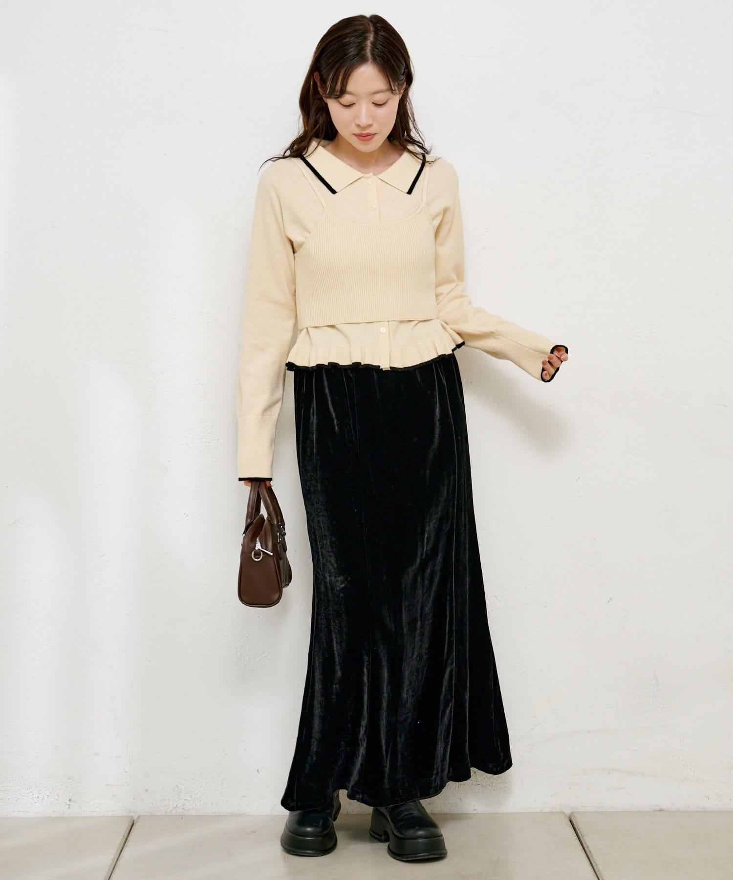 由柔軟、厚度適中的針織開衫和羅紋針織半身裙組成的多層套裝。