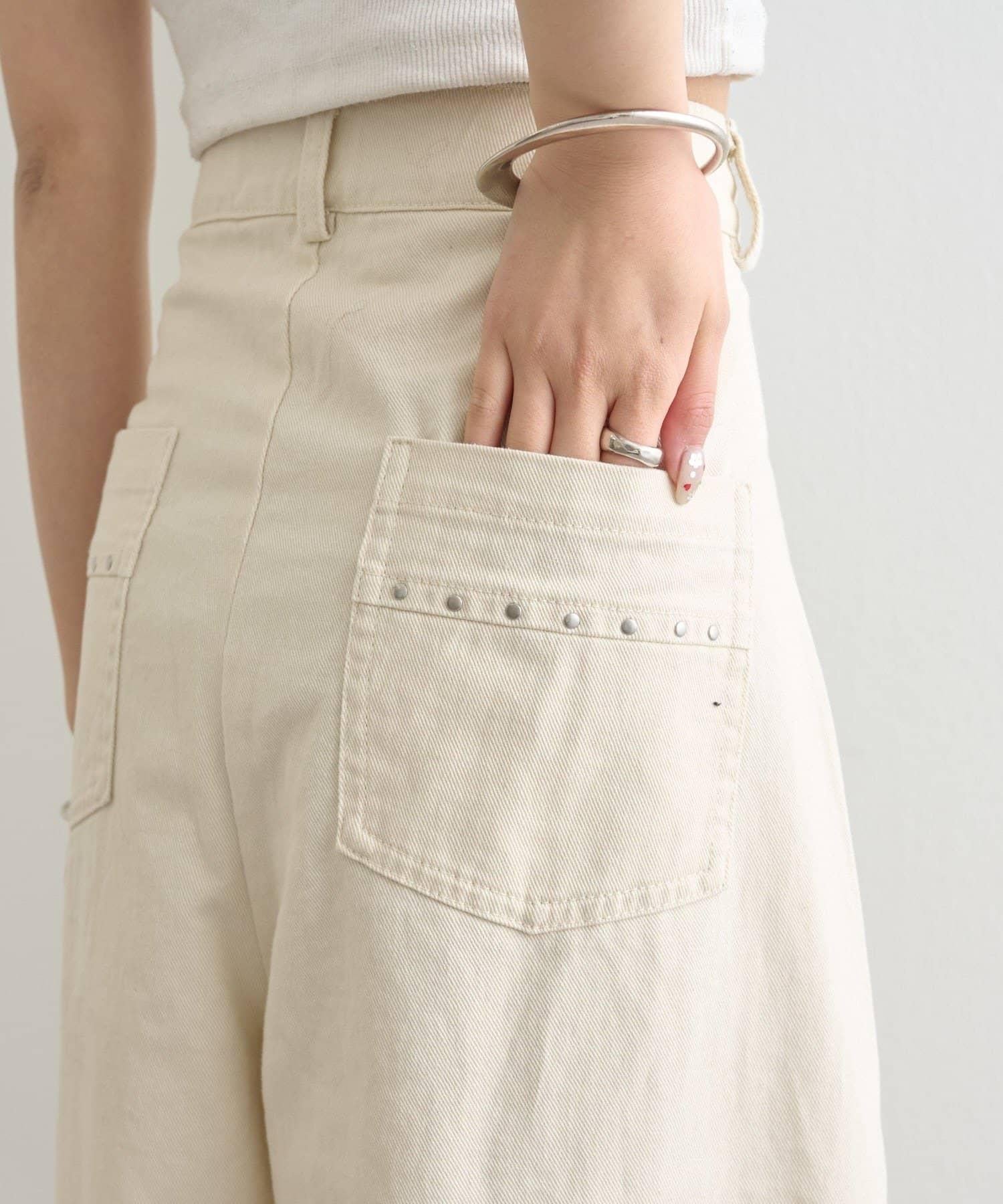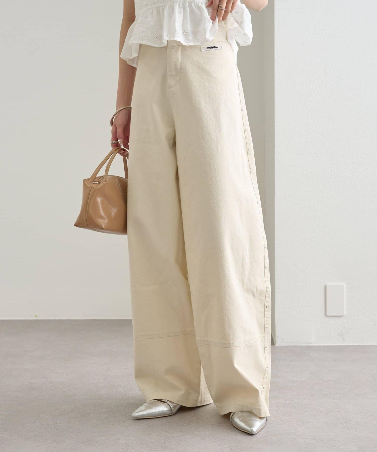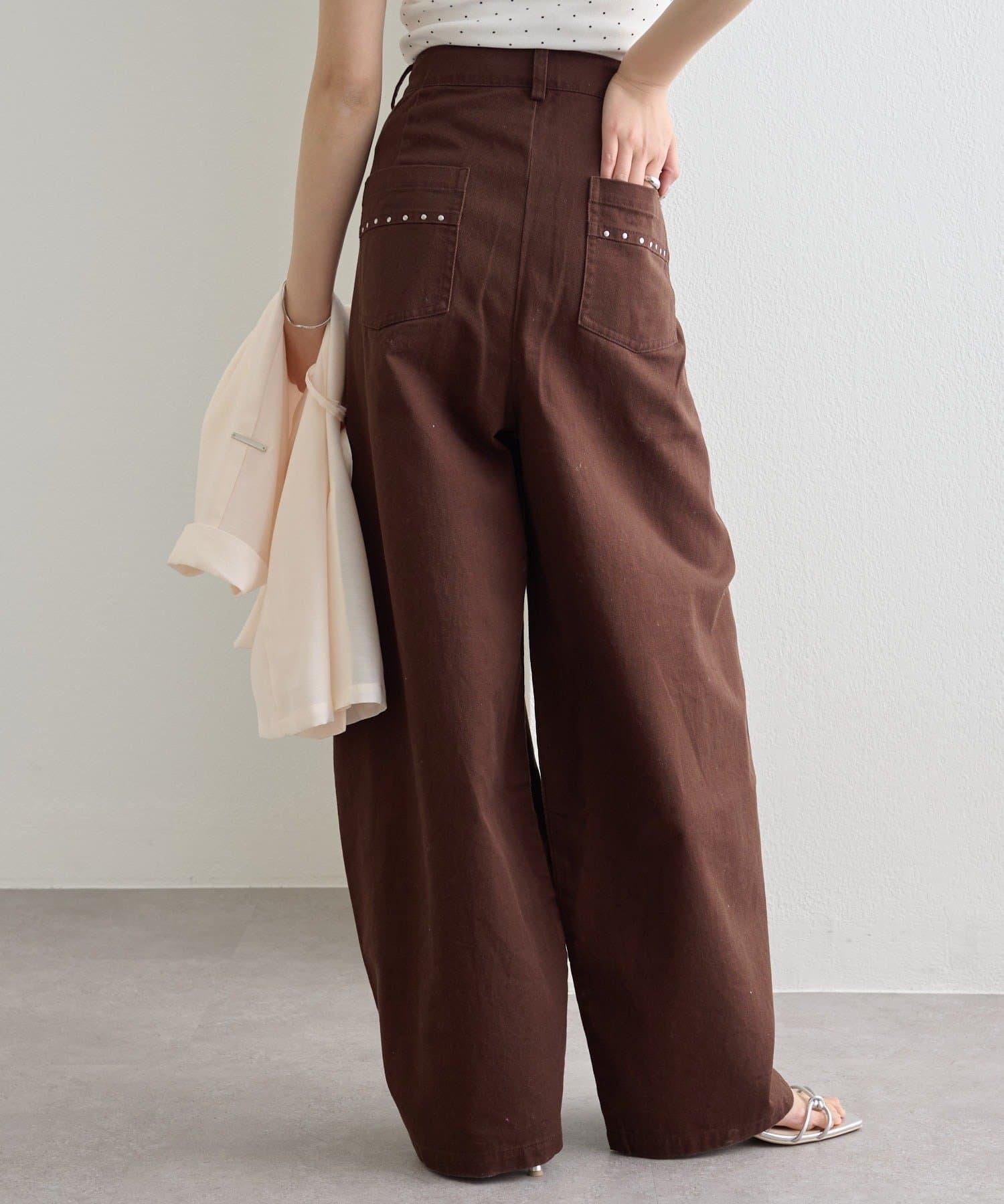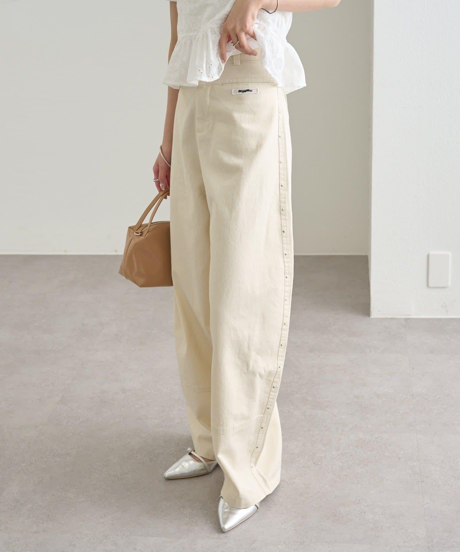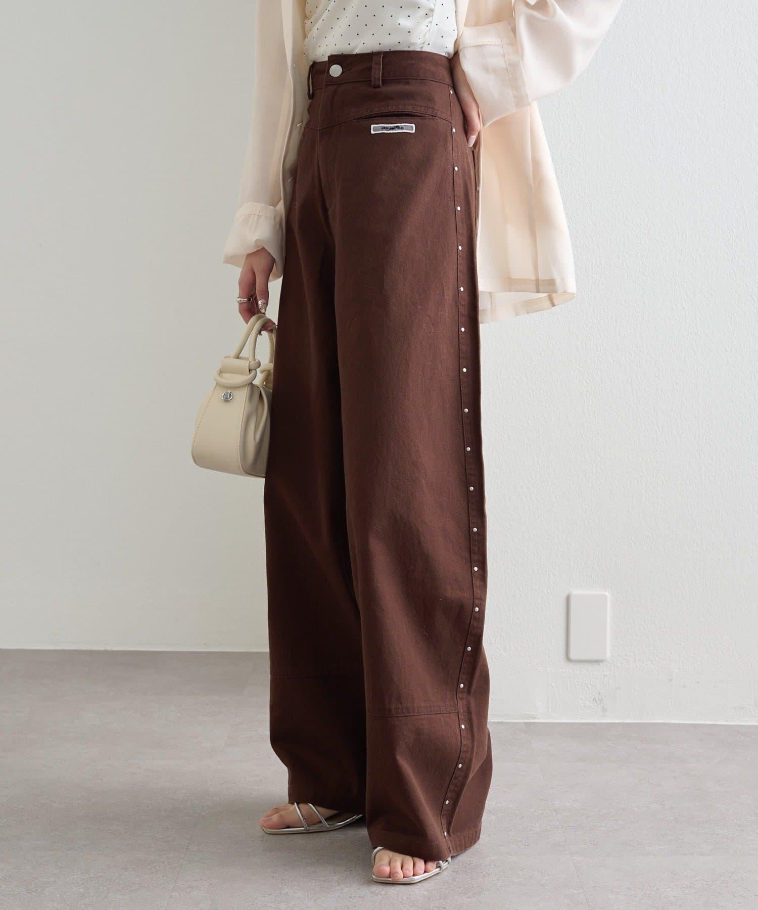 斜紋布長褲,採用時尚的立體剪裁,飾以鉚釘設計。