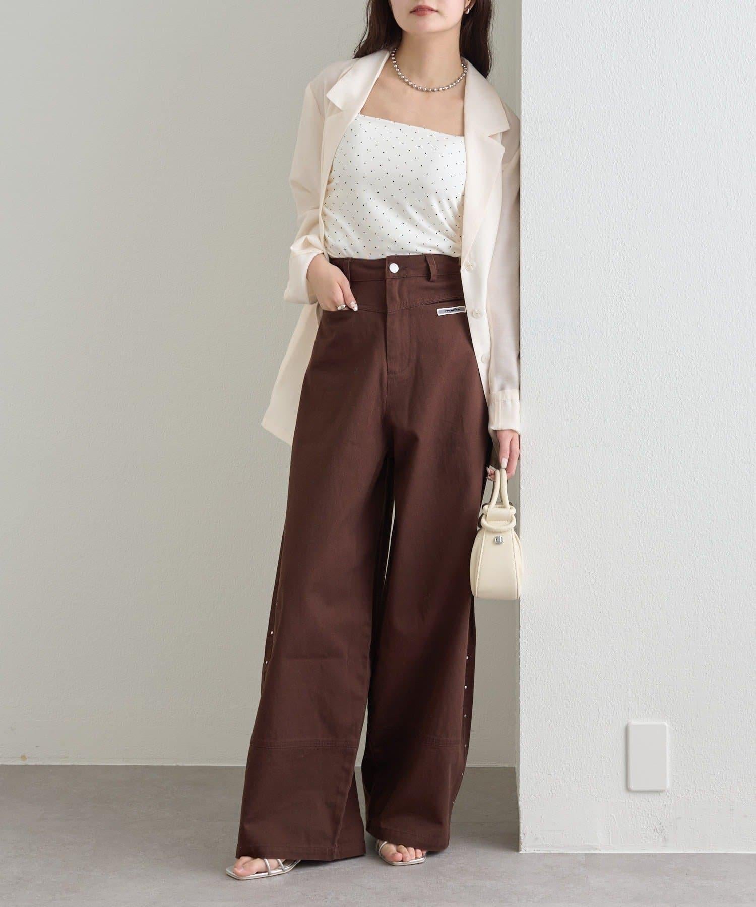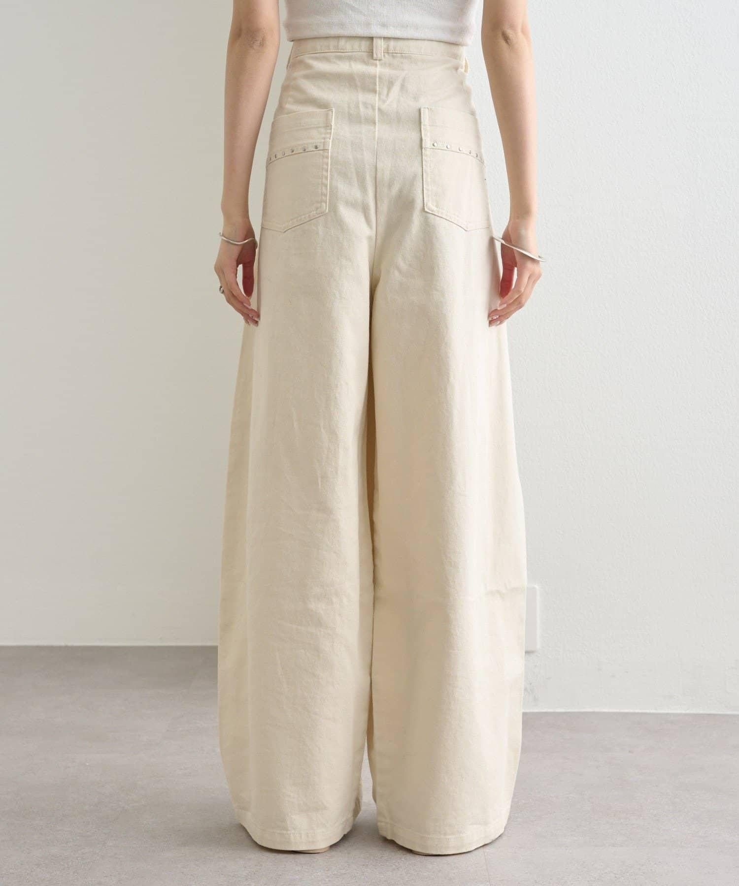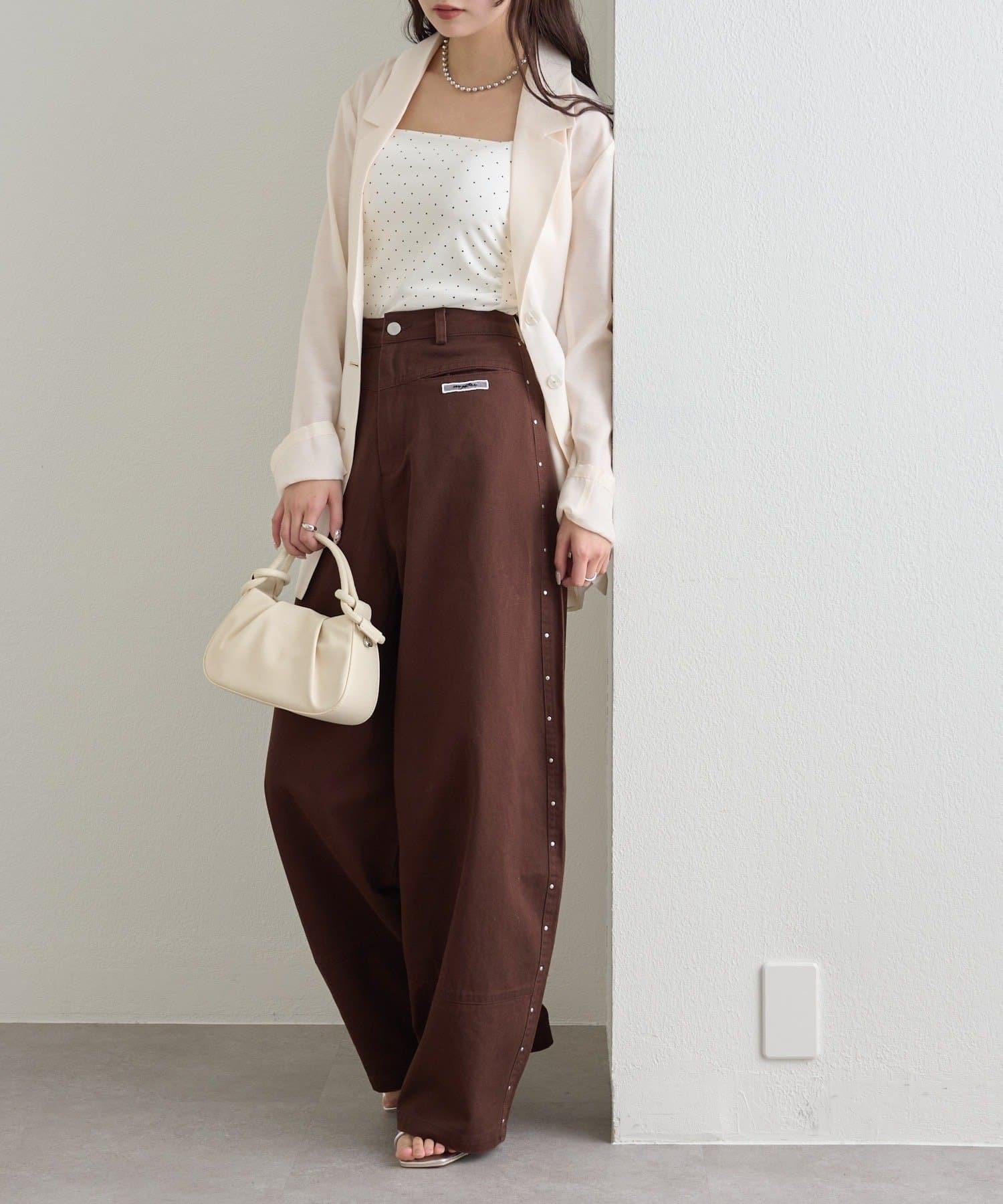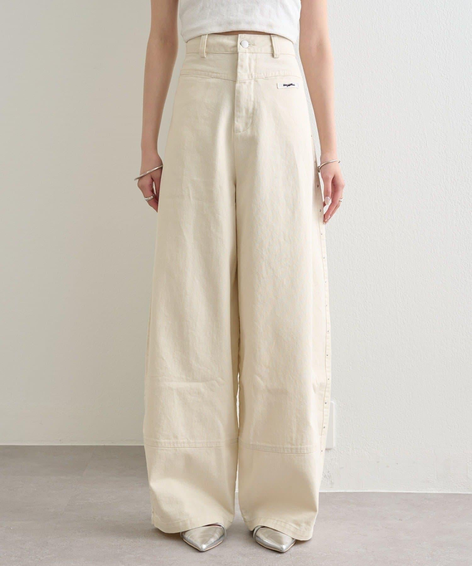 斜紋布長褲,採用時尚的立體剪裁,飾以鉚釘設計。