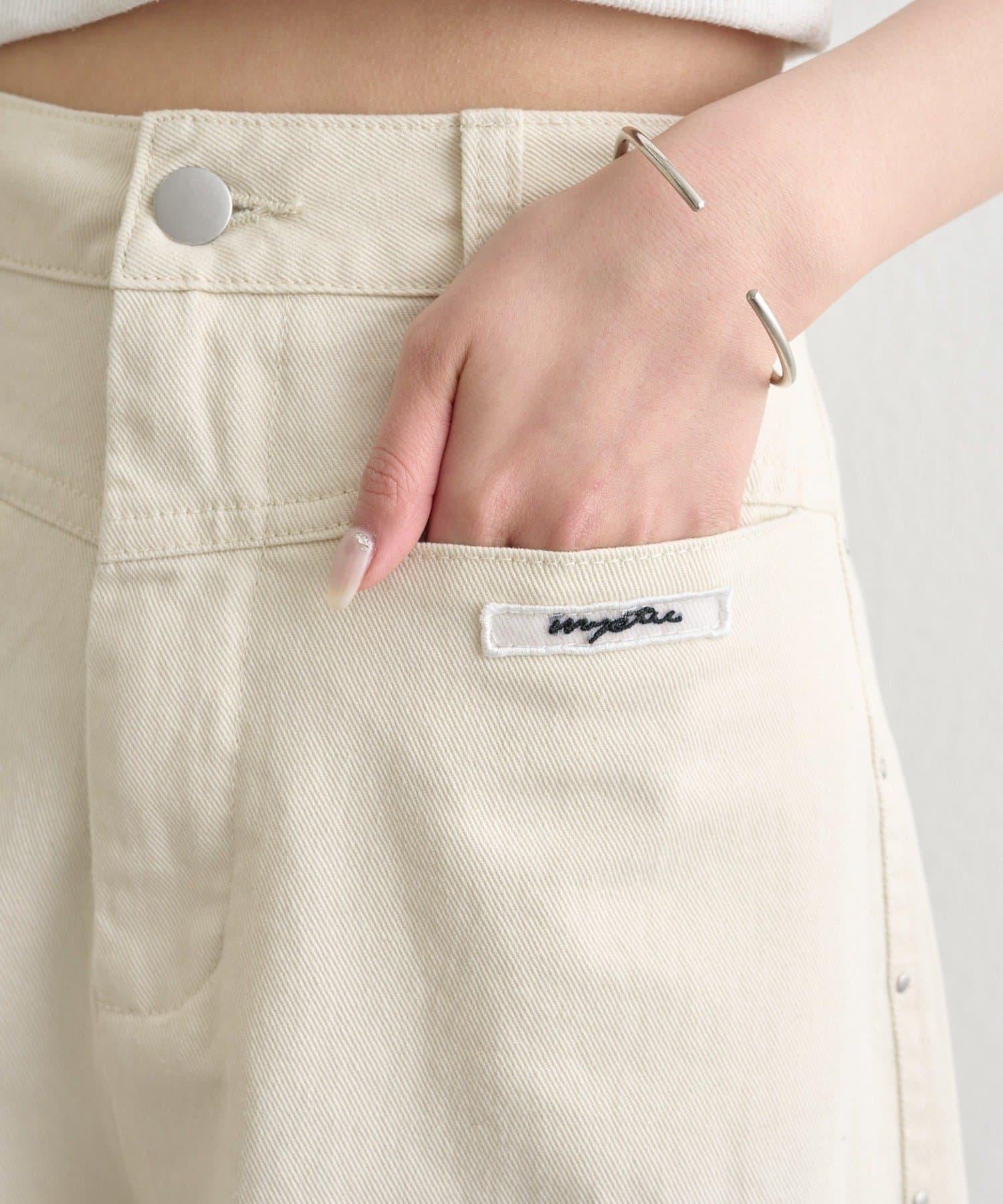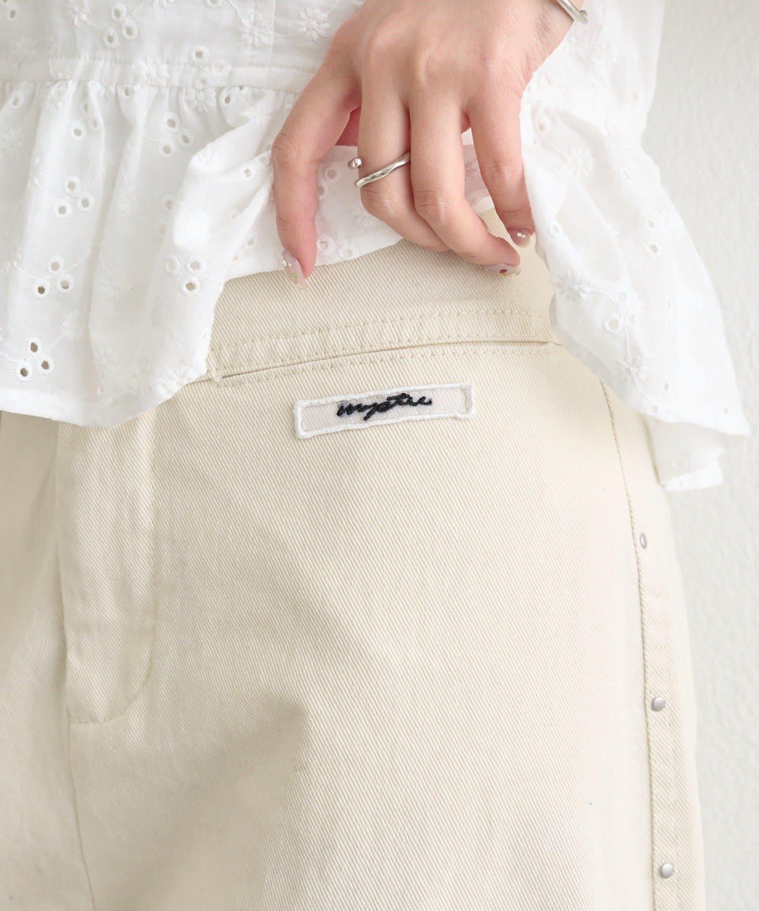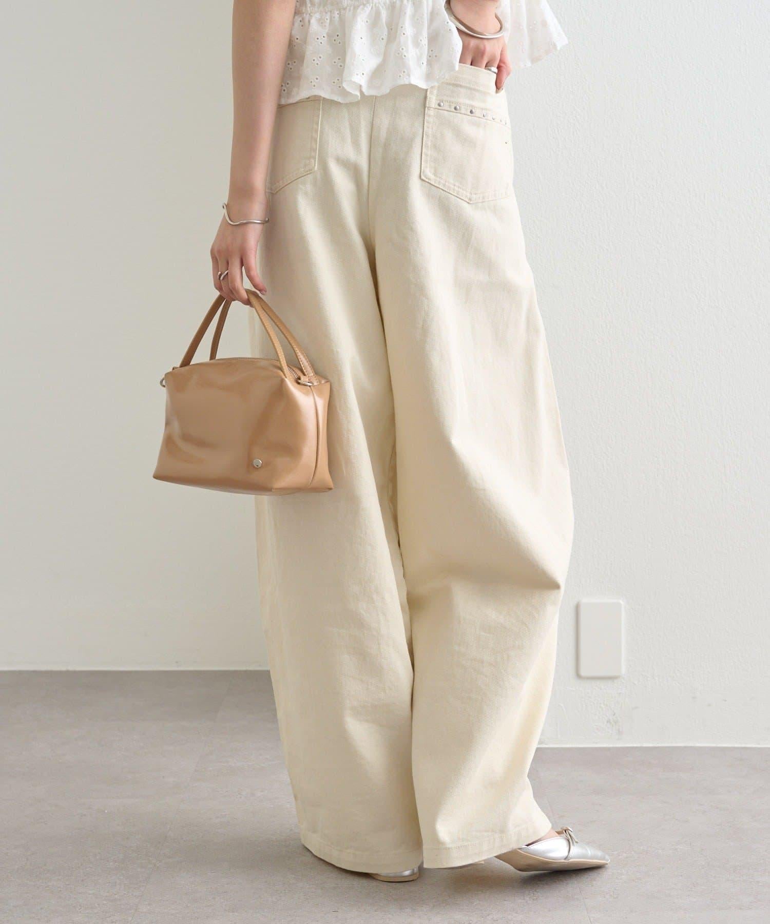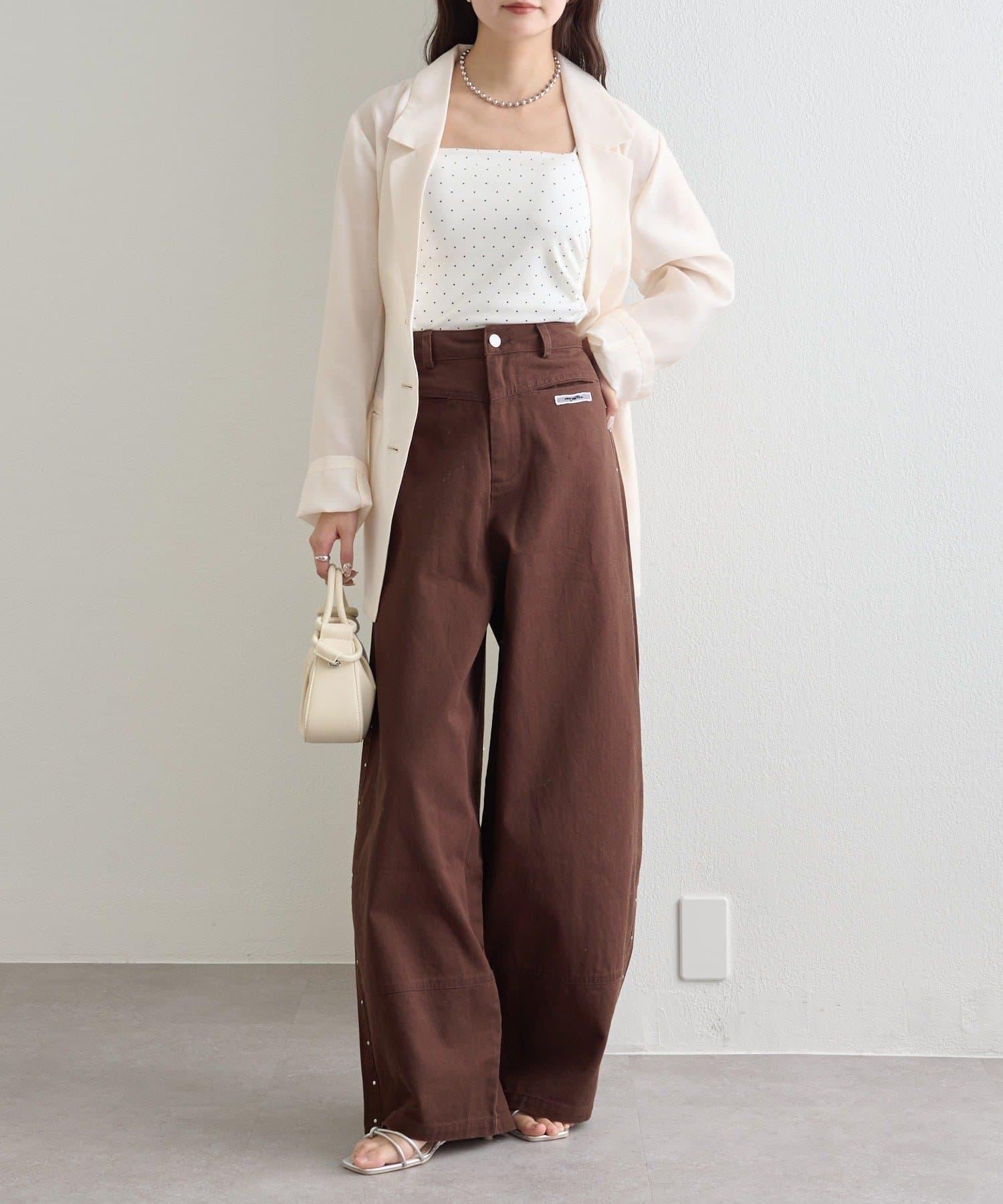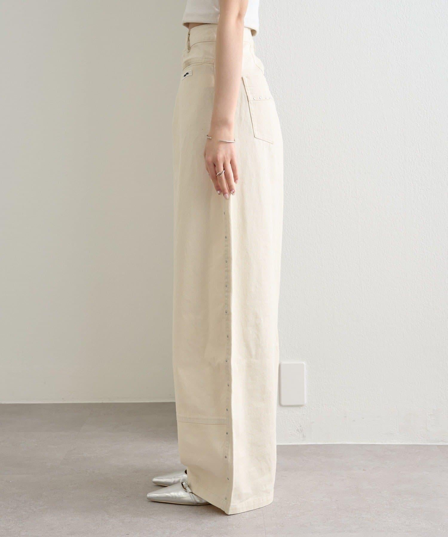 斜紋布長褲,採用時尚的立體剪裁,飾以鉚釘設計。