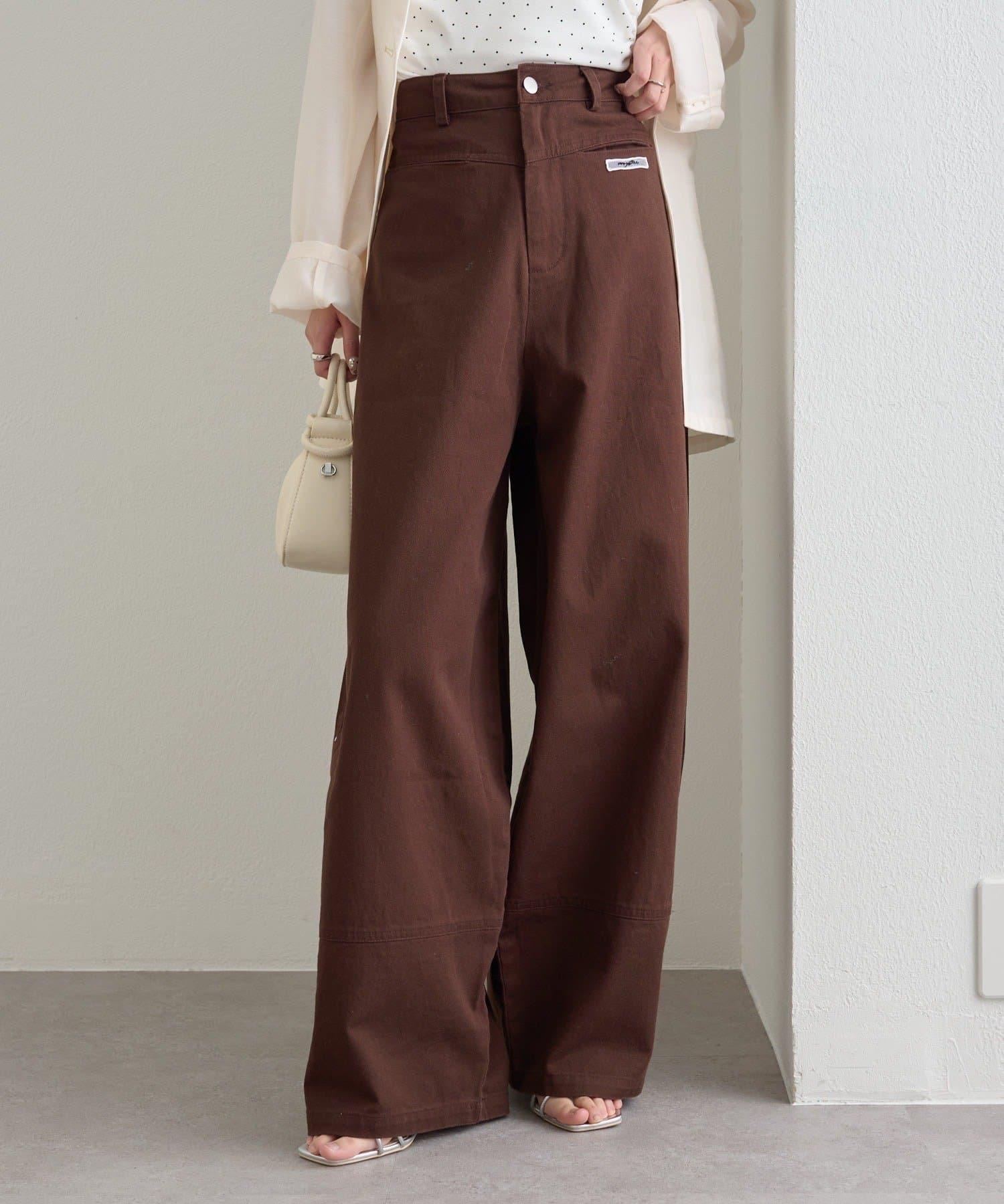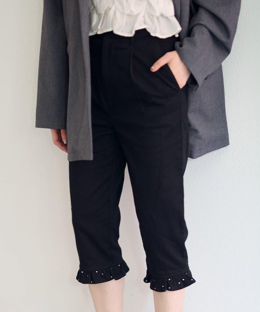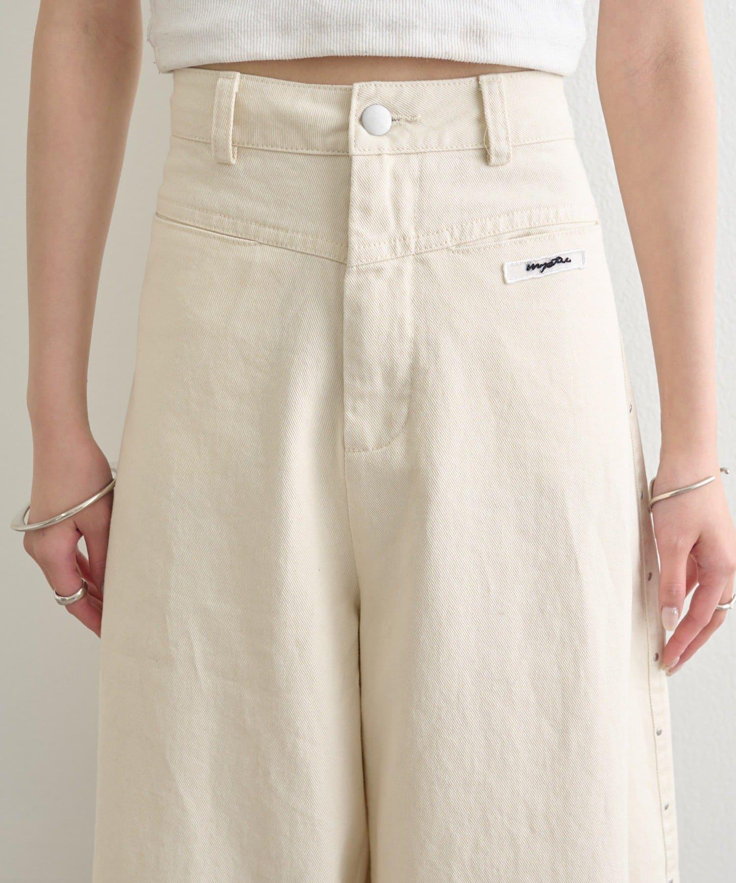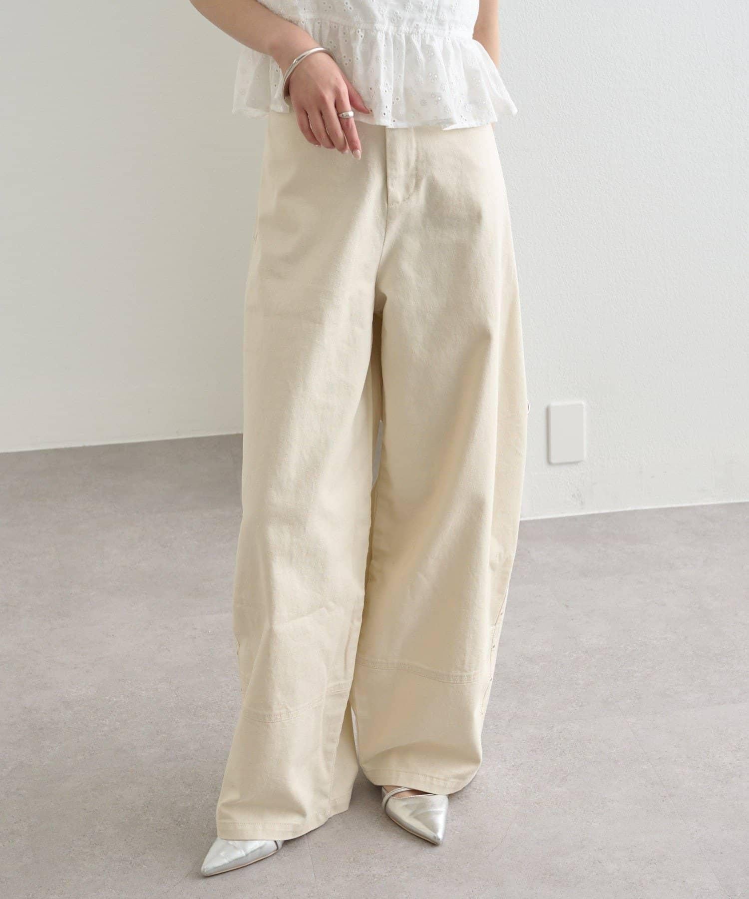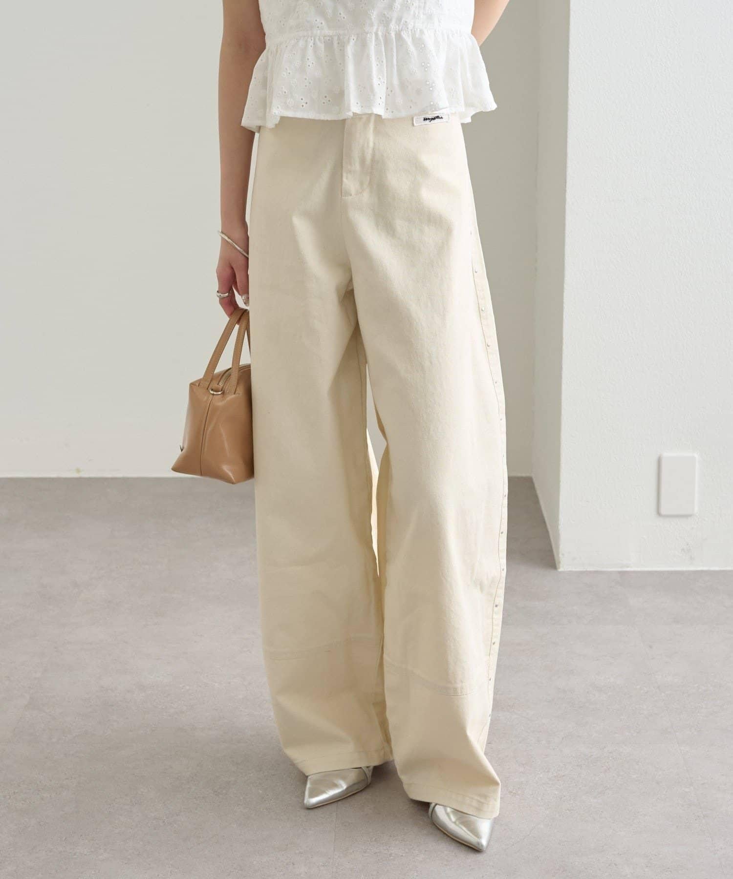 斜紋布長褲,採用時尚的立體剪裁,飾以鉚釘設計。