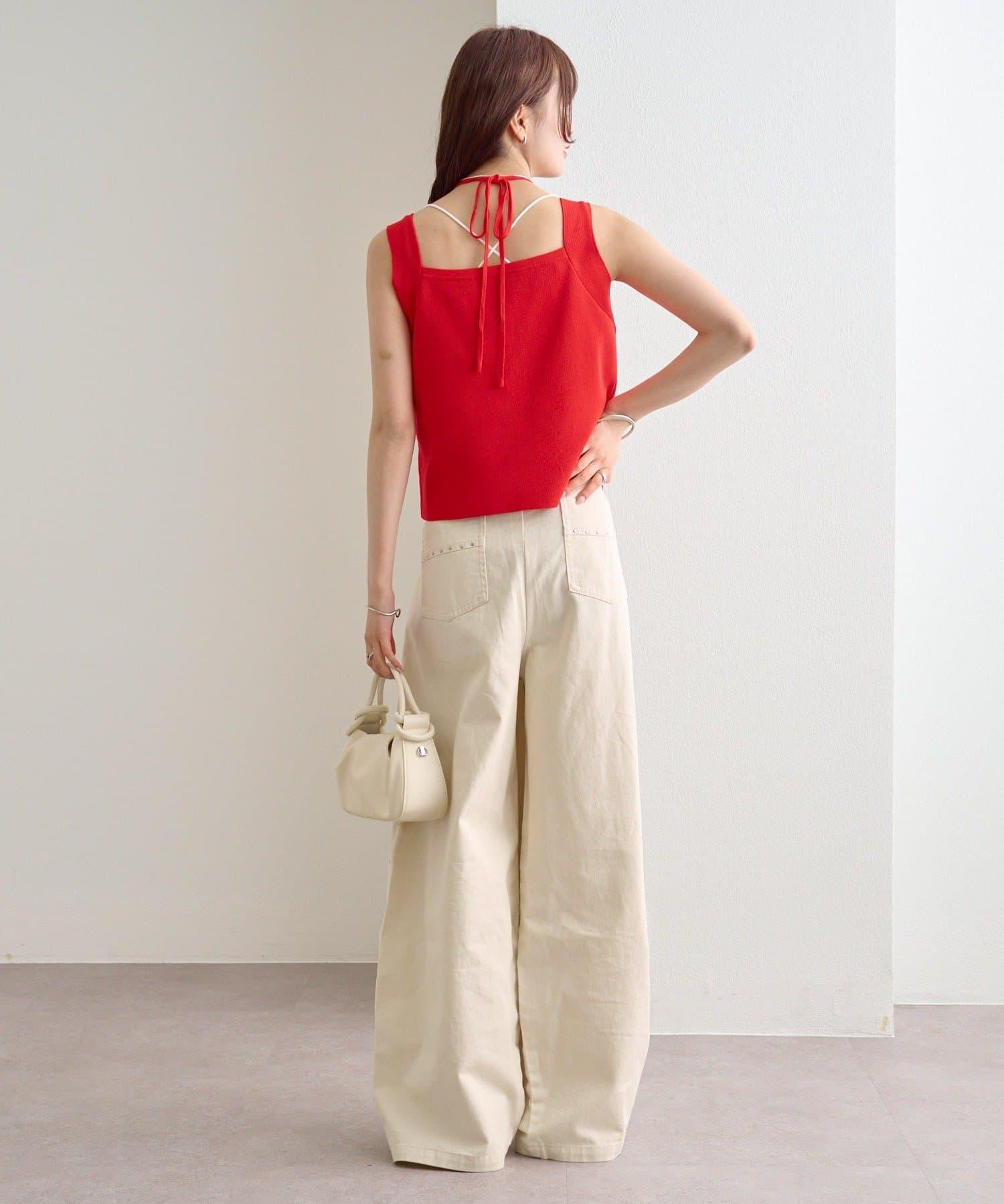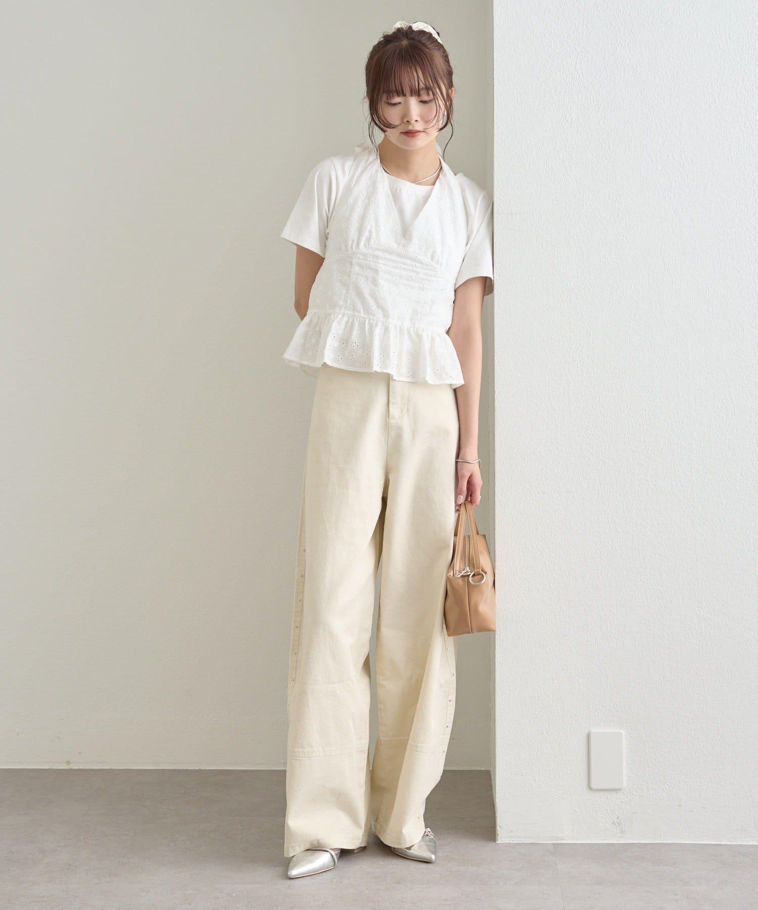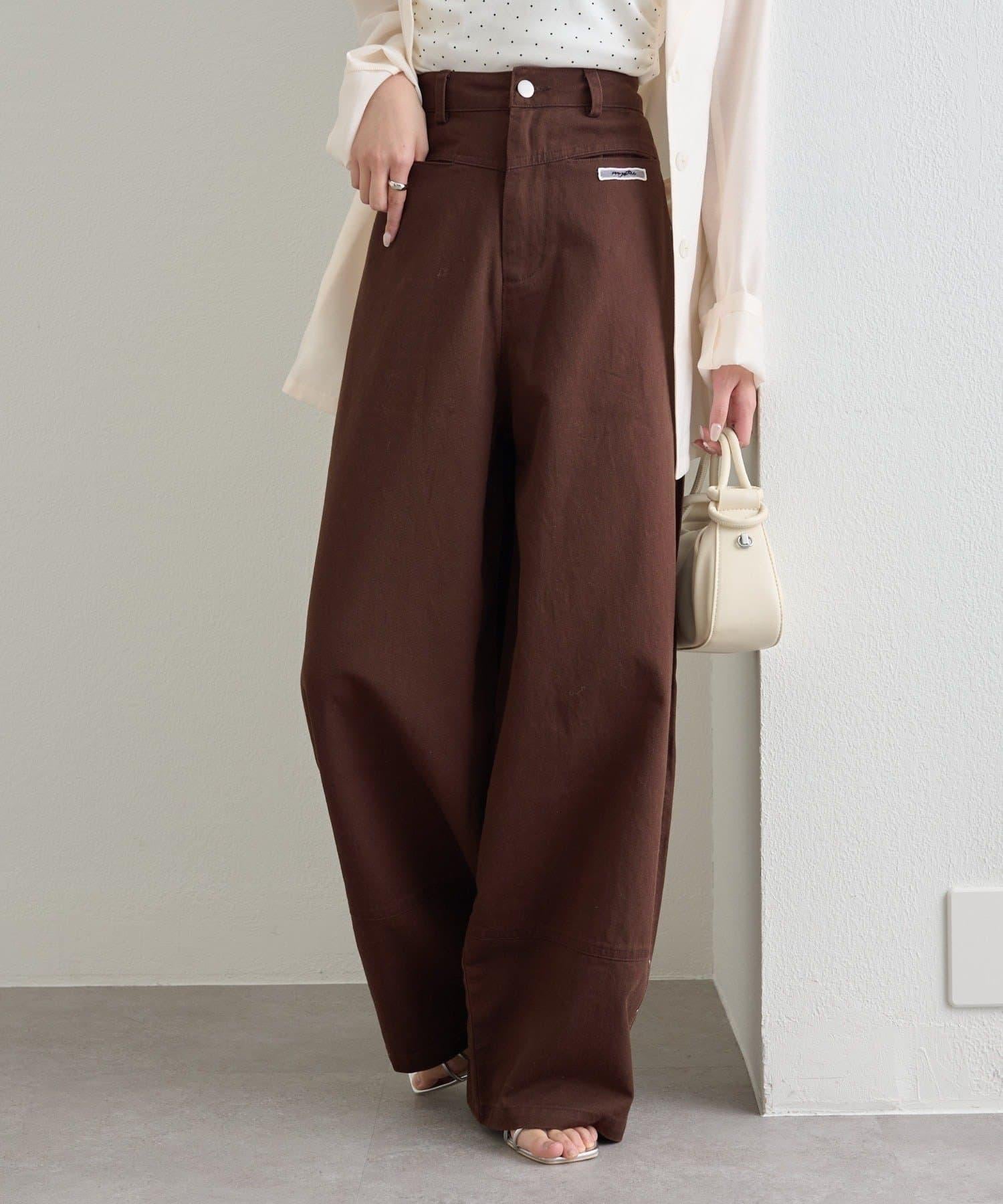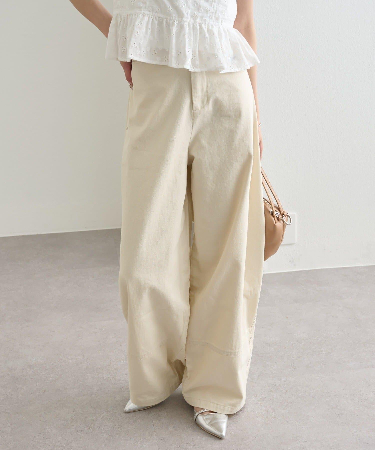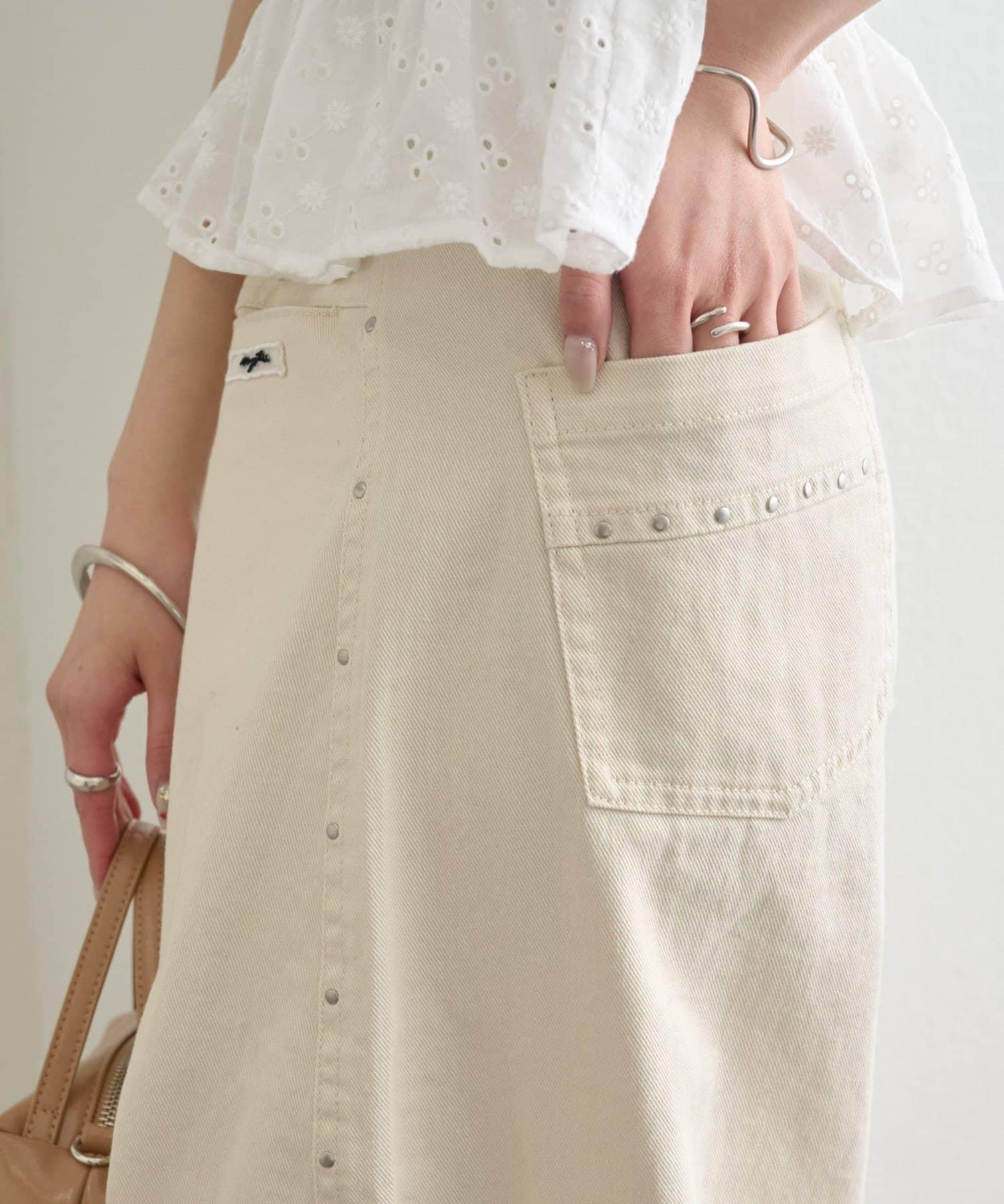 斜紋布長褲,採用時尚的立體剪裁,飾以鉚釘設計。