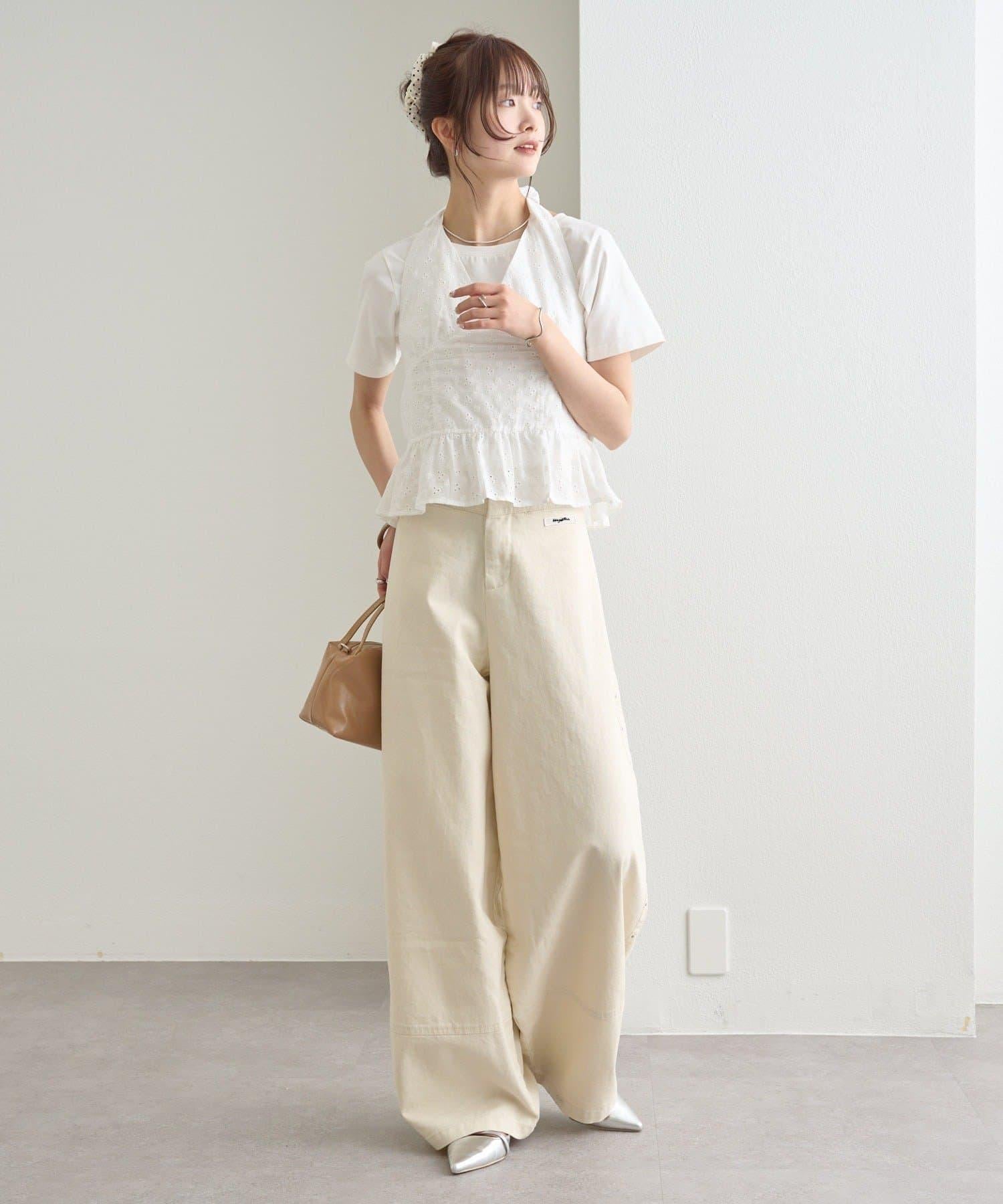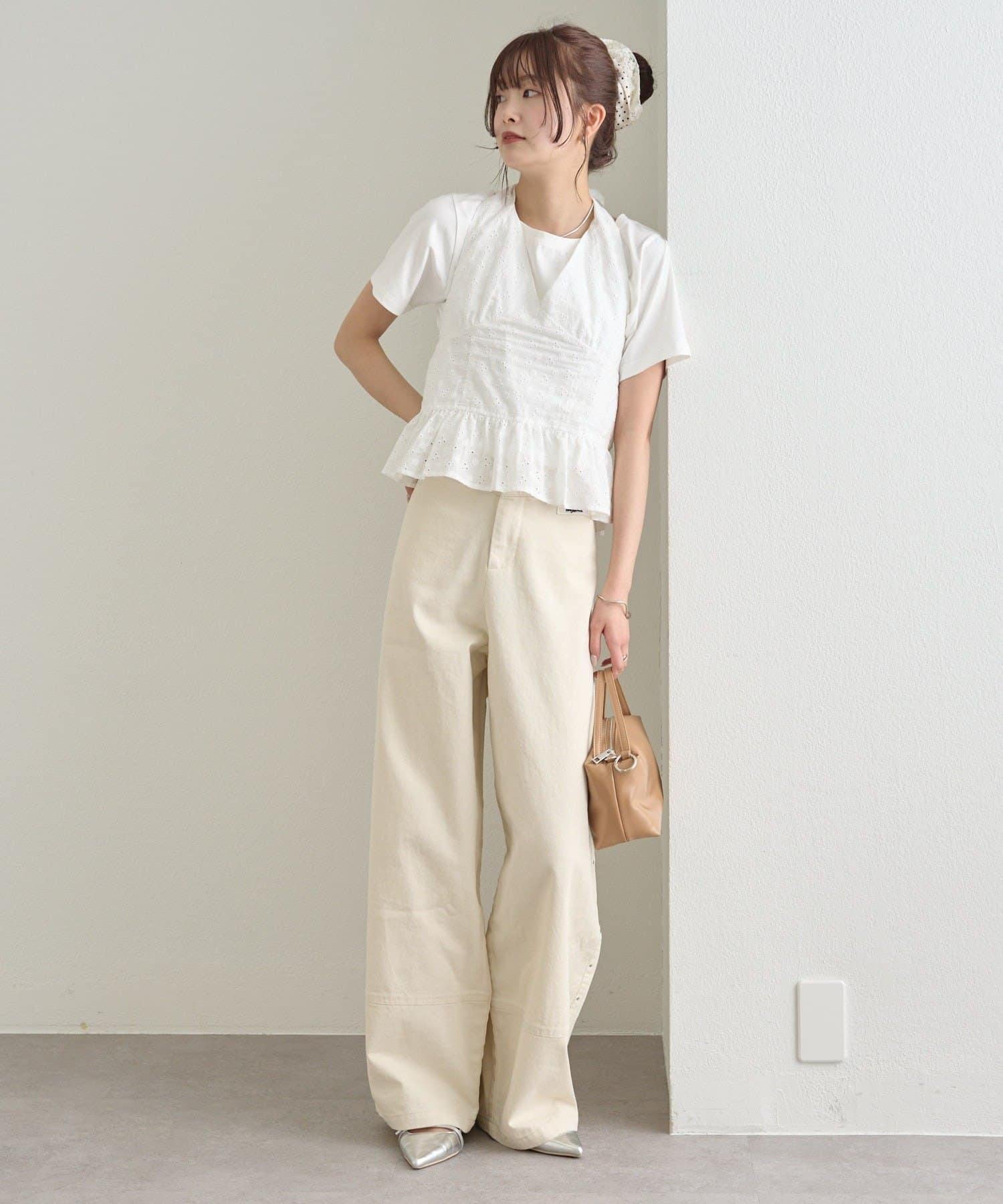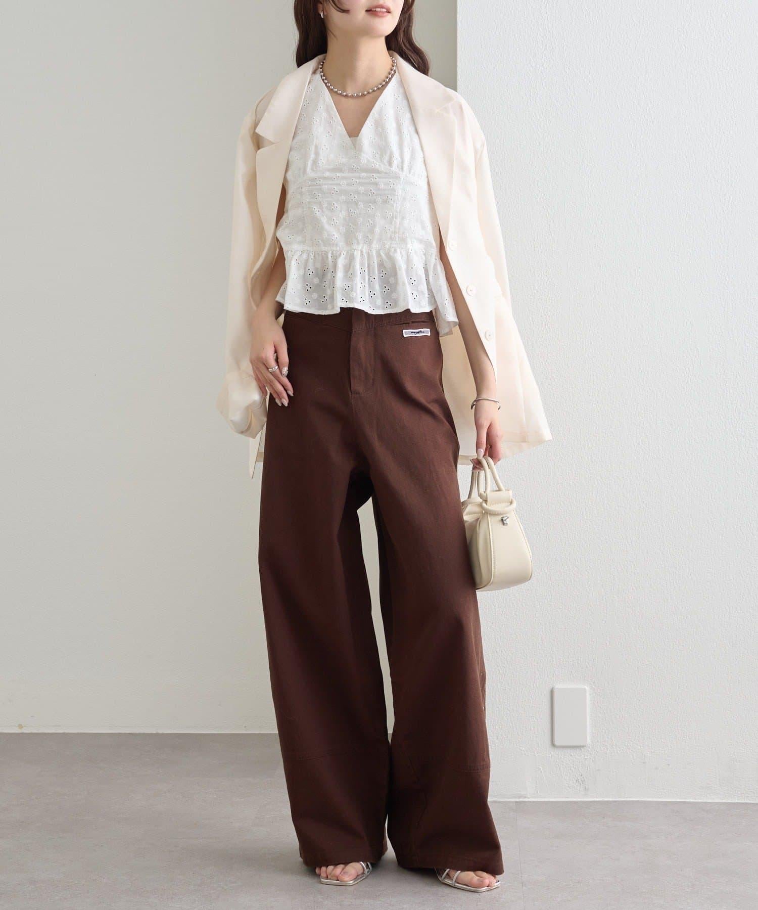 長褲的寬大廓形非常顯眼,與小巧的上衣搭配起來非常平衡。