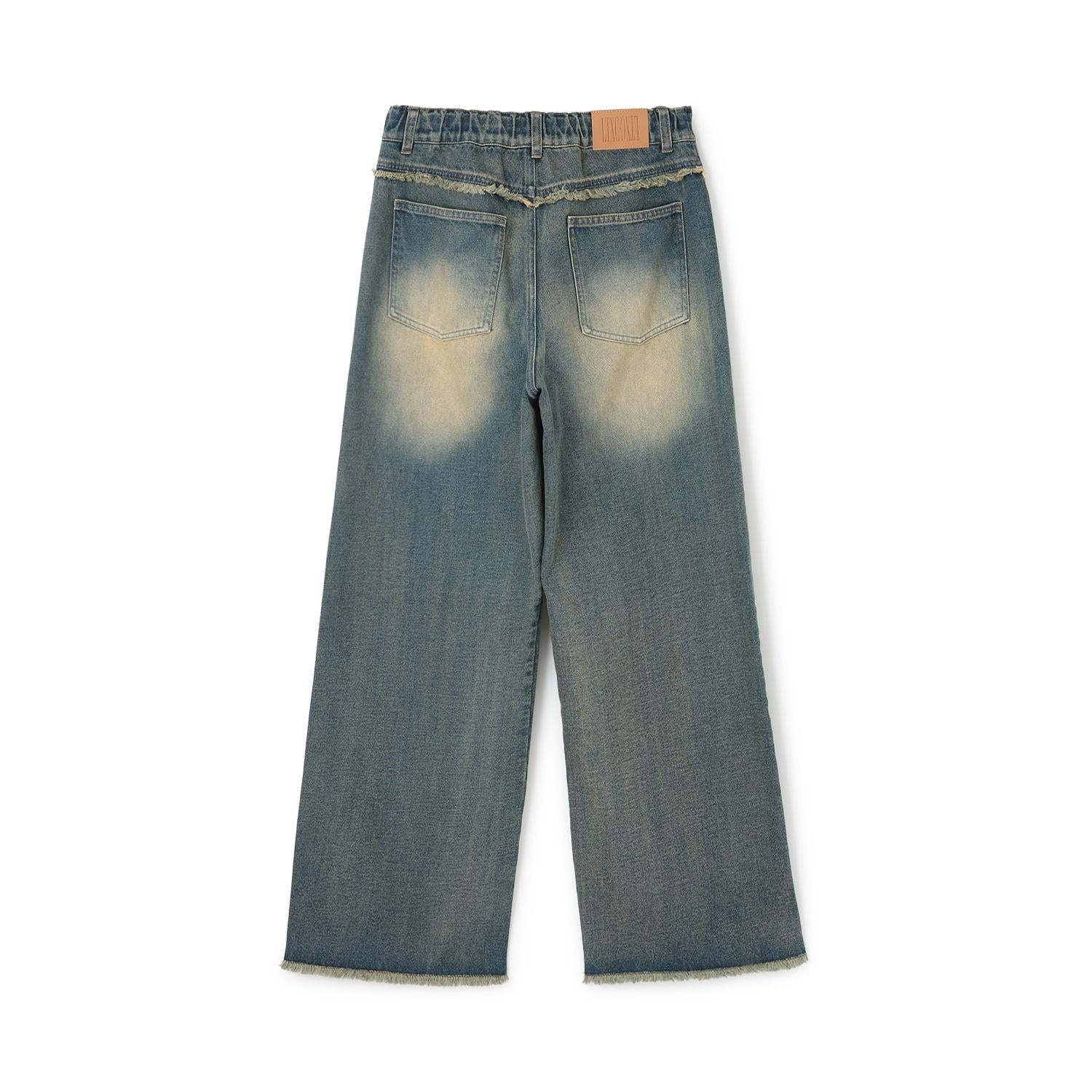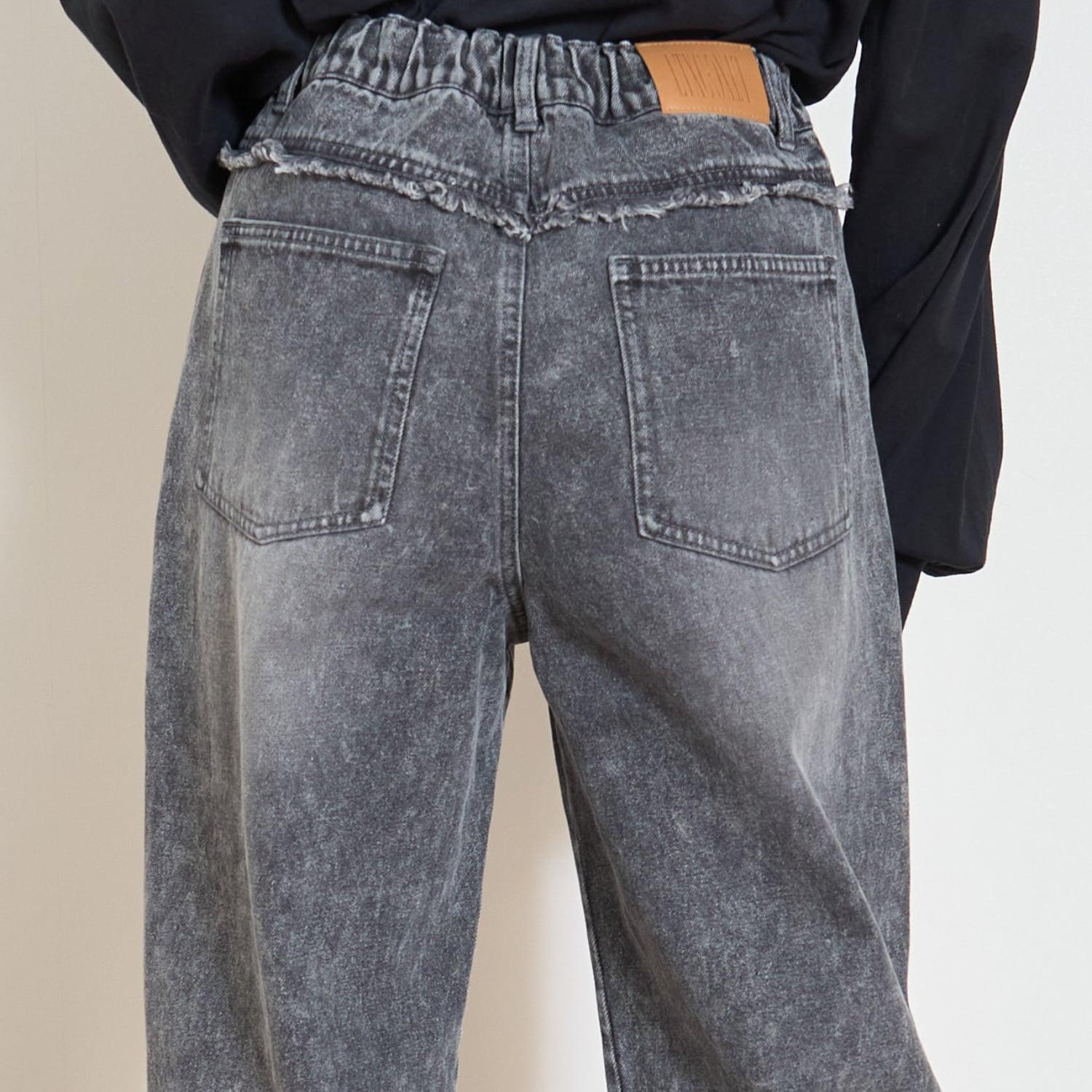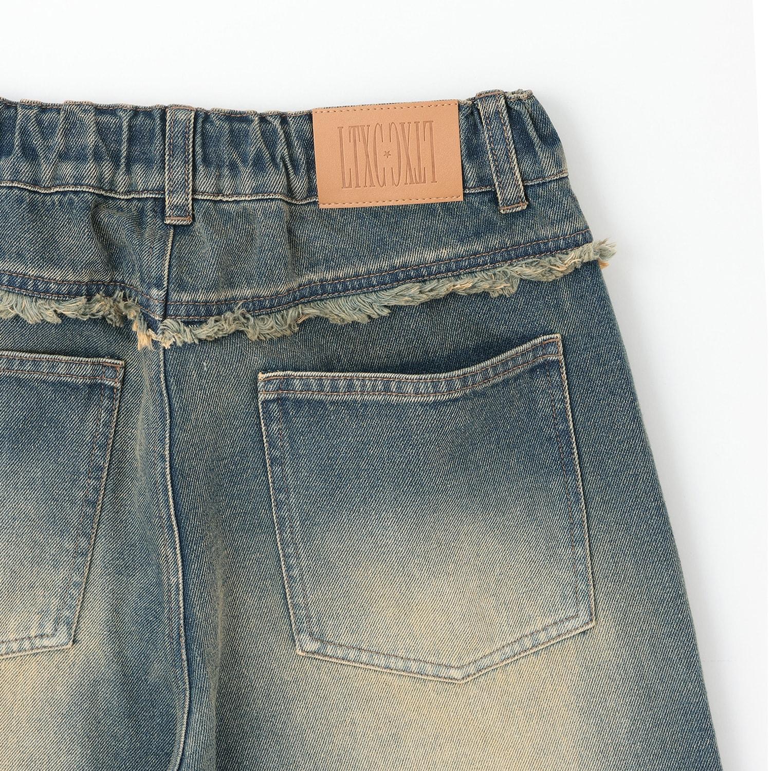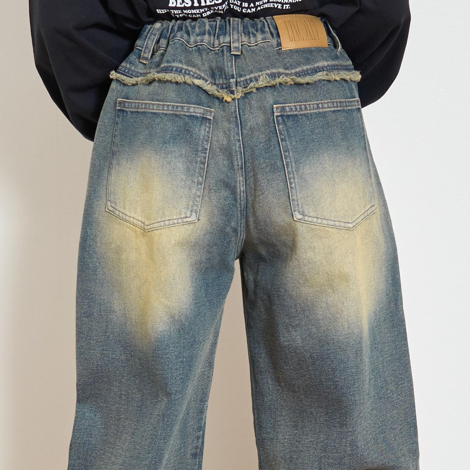 這條牛仔長褲充滿了時下流行的邋遢細節。